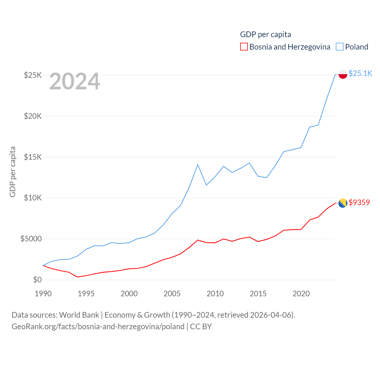 By GDP, Bosnia and Herzegovina ranks 111/197 ($29.6B) and Poland ranks 21/197 ($918B). By GDP per capita, Bosnia and Herzegovina ranks 87/197 ($9,359), while Poland ranks 48/197 ($25,104).
