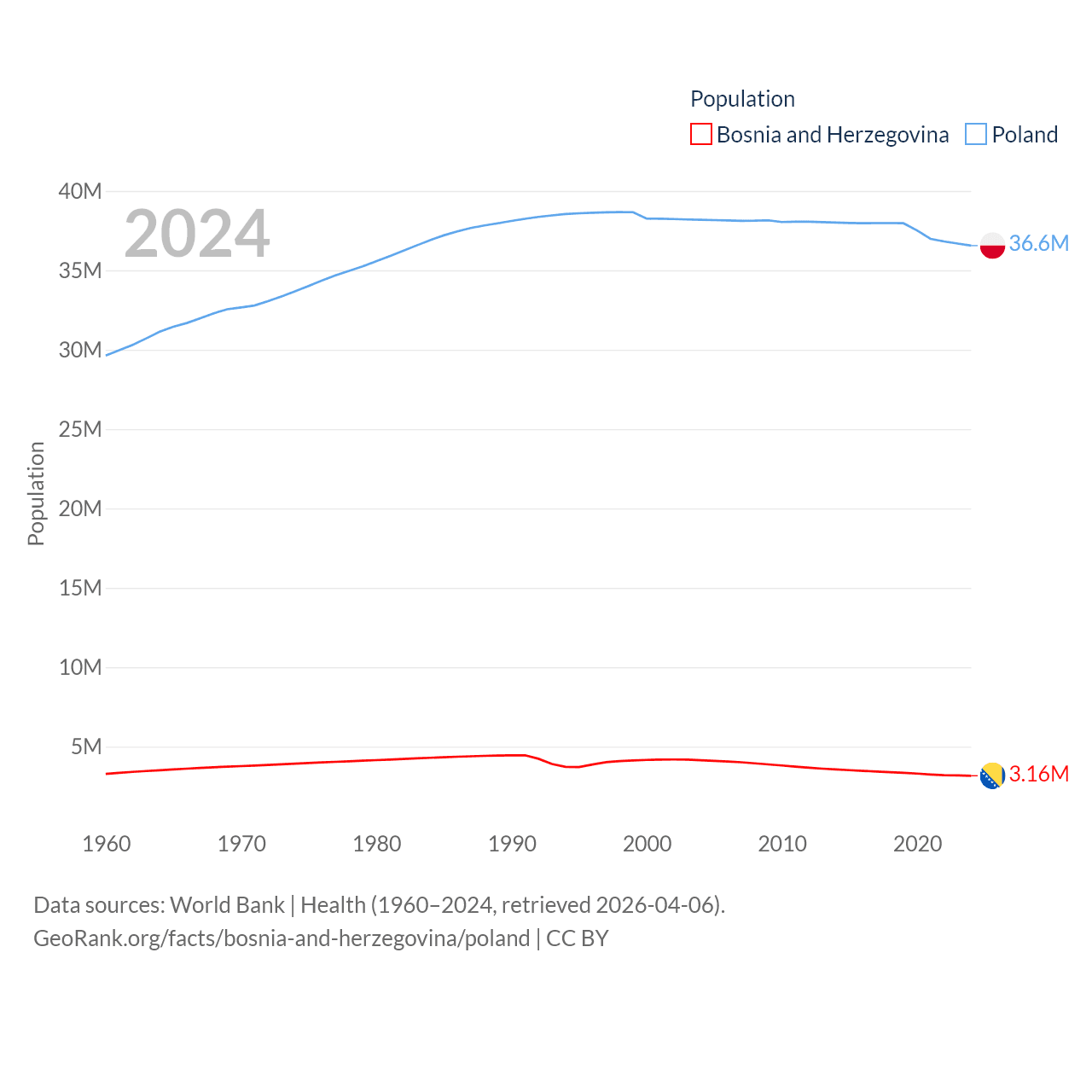 Bosnia and Herzegovina has a population of 3.16M (ranked 134/197), compared with 36.6M in Poland (ranked 42/197). Bosnia and Herzegovina's land area is 19,768 sq mi versus 118,252 sq mi for Poland (ranked 125th vs. 69th).