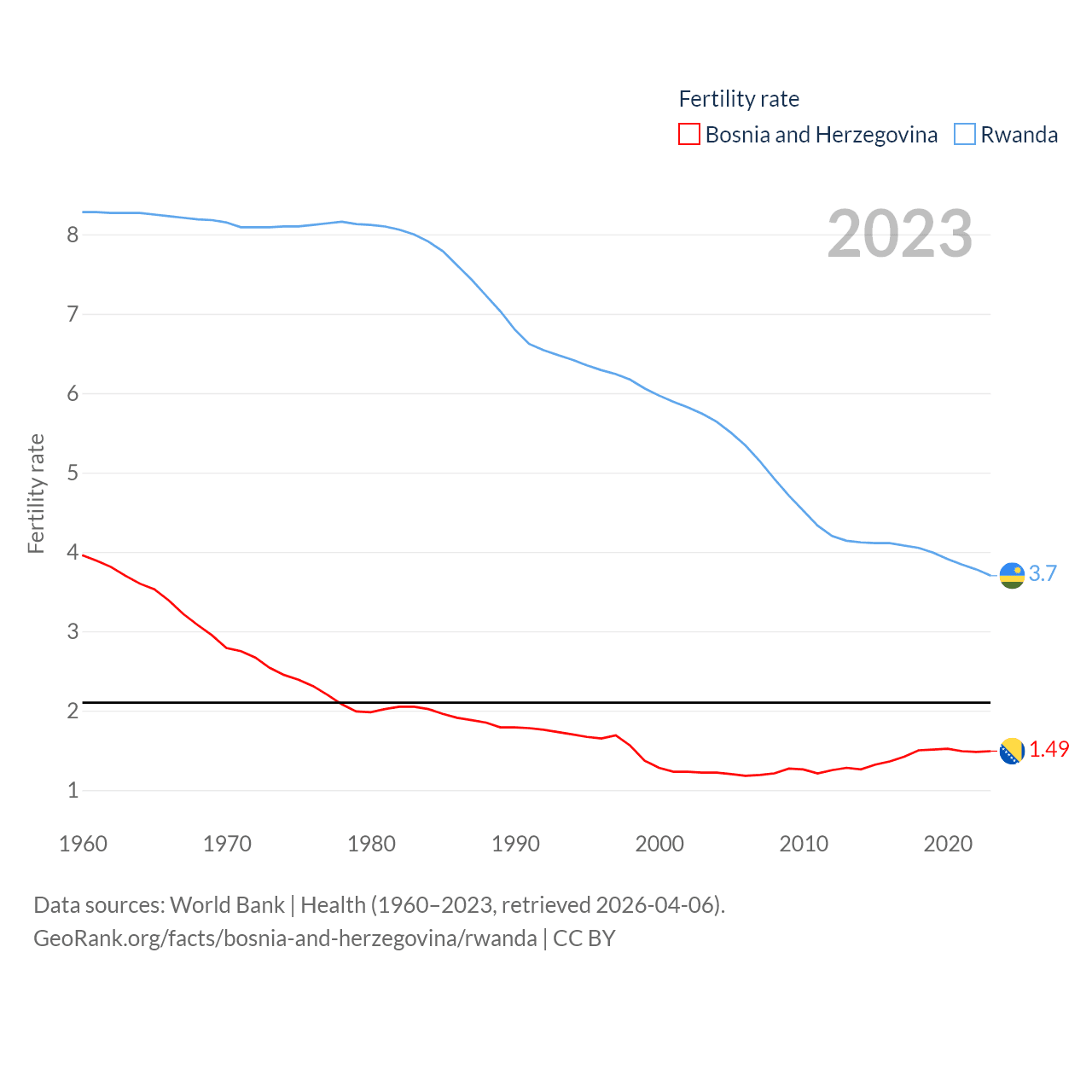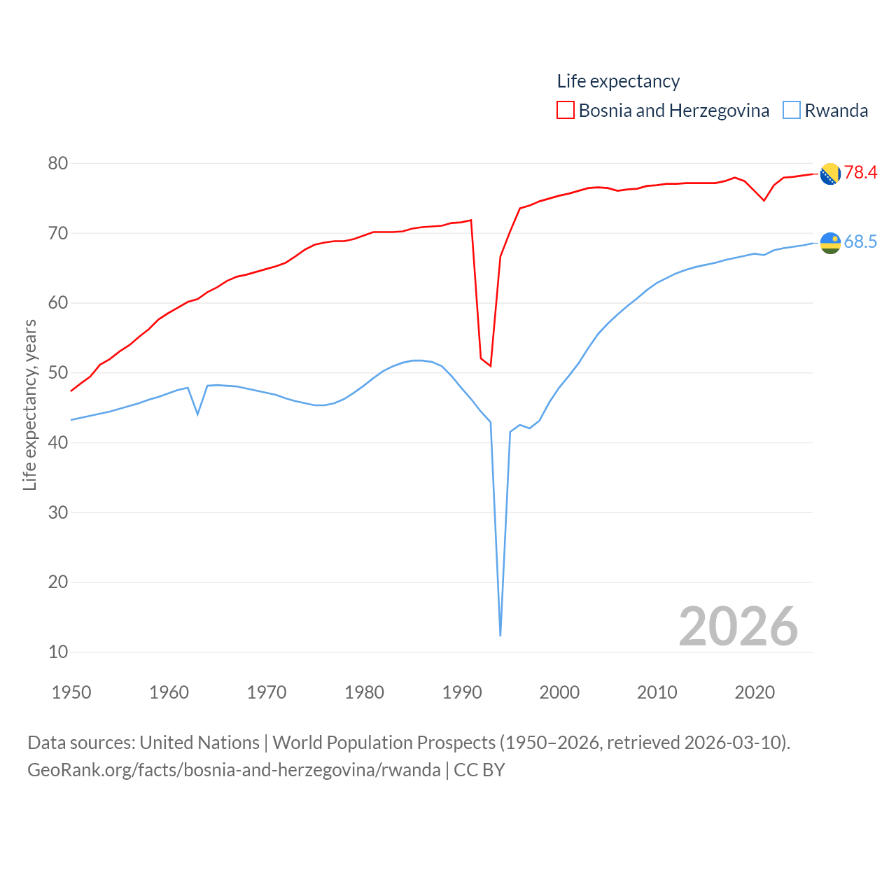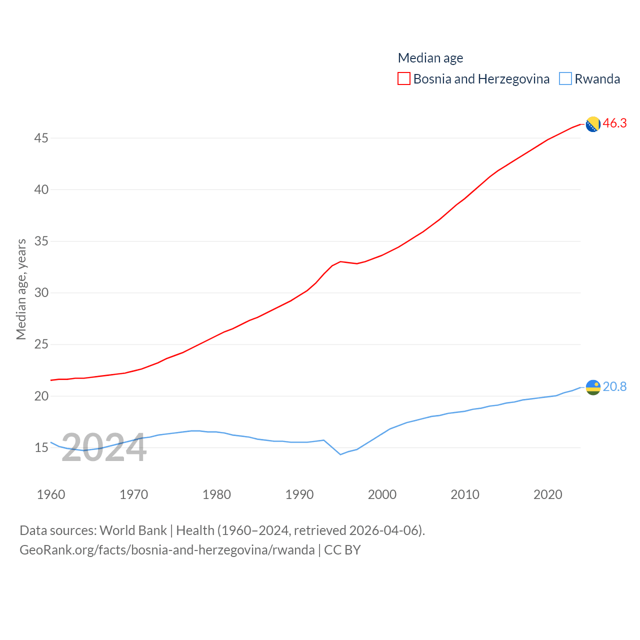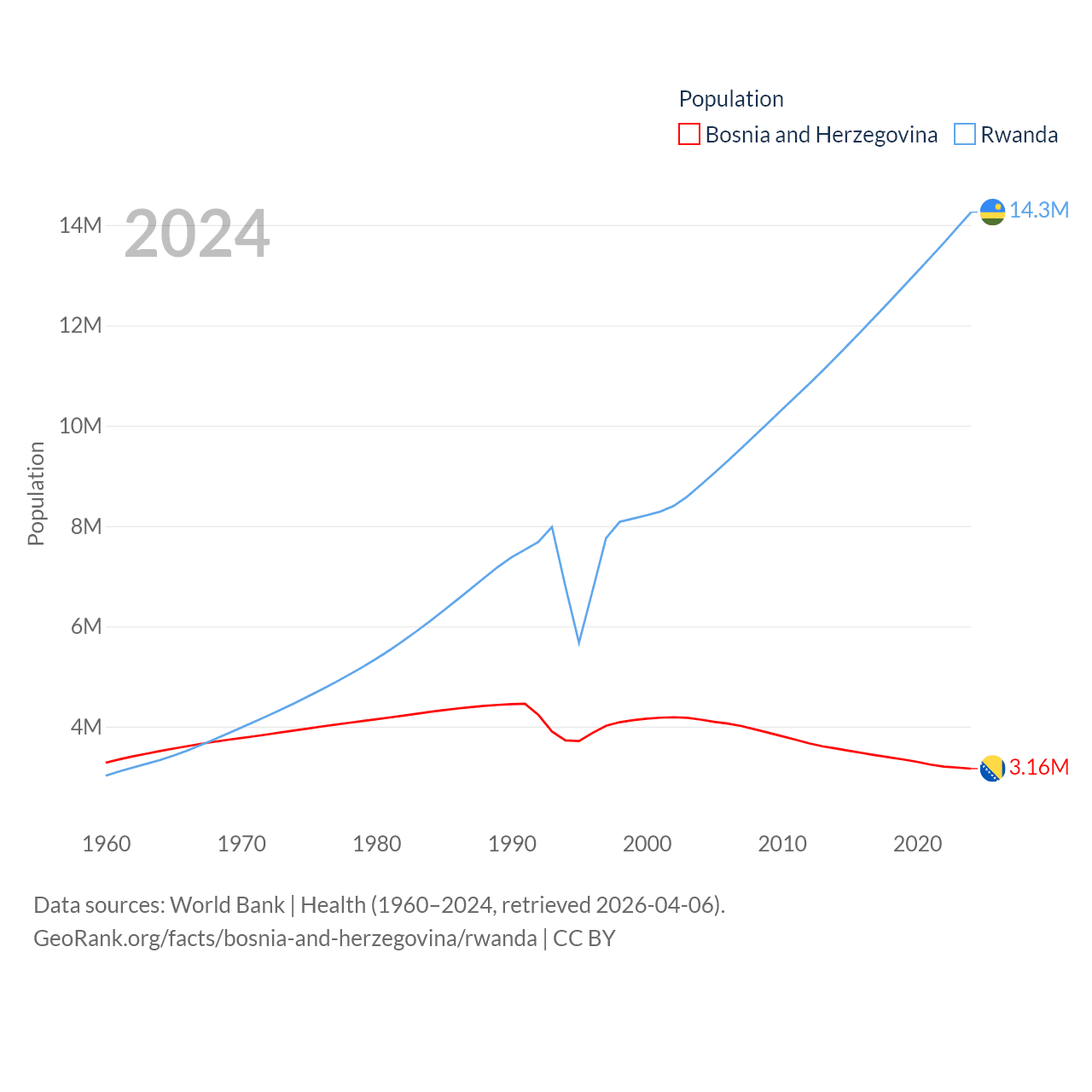 Bosnia and Herzegovina has a population of 3.16M (ranked 134/197), compared with 14.3M in Rwanda (ranked 77/197). Bosnia and Herzegovina's land area is 19,768 sq mi versus 9,525 sq mi for Rwanda (ranked 125th vs. 146th).
