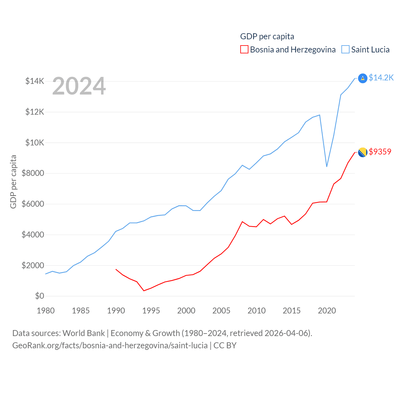 By GDP, Bosnia and Herzegovina ranks 111/197 ($29.6B) and Saint Lucia ranks 173/197 ($2.55B). By GDP per capita, Bosnia and Herzegovina ranks 87/197 ($9,359), while Saint Lucia ranks 70/197 ($14,182).