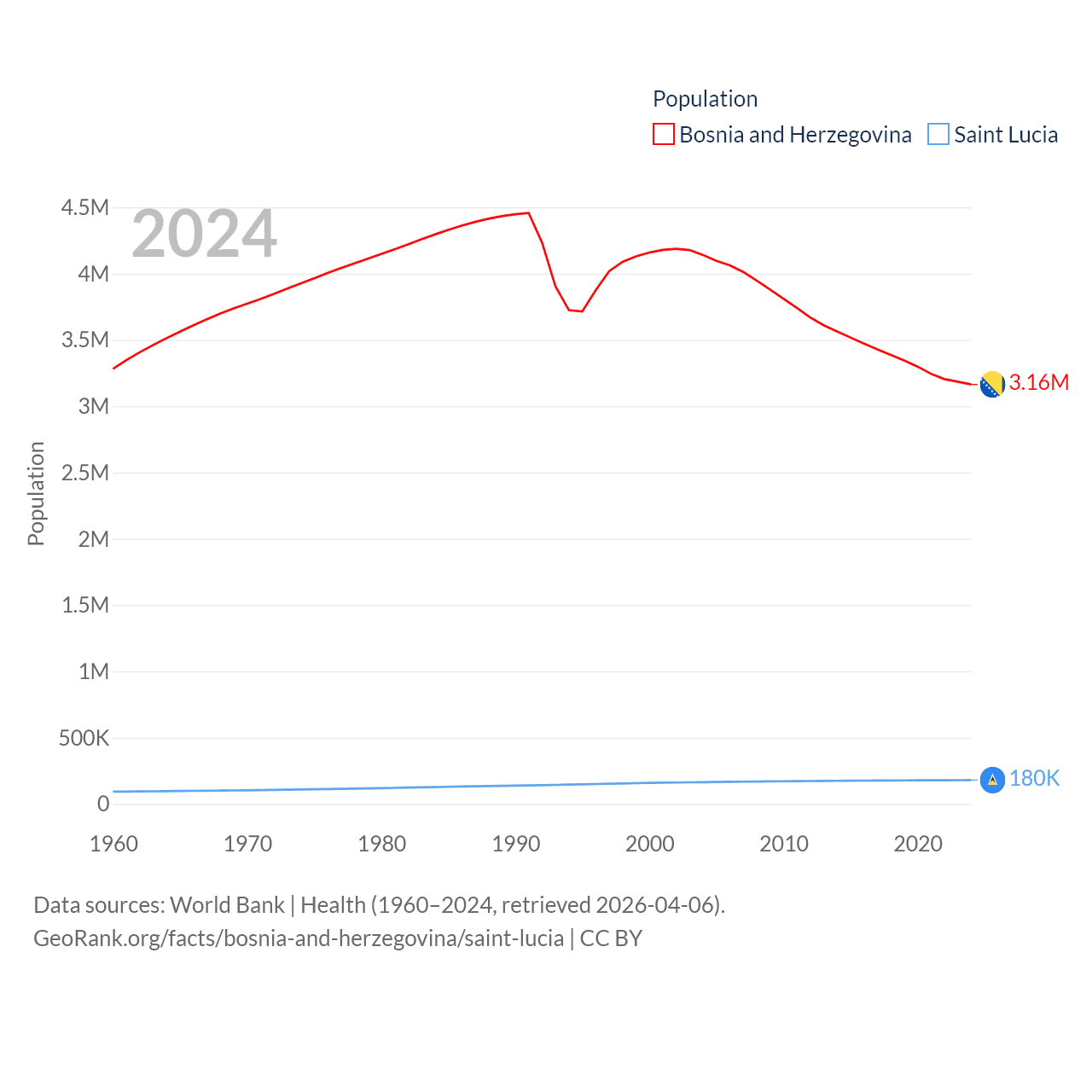 Bosnia and Herzegovina has a population of 3.16M (ranked 134/197), compared with 180K in Saint Lucia (ranked 178/197). Bosnia and Herzegovina's land area is 19,768 sq mi versus 235.5 sq mi for Saint Lucia (ranked 125th vs. 178th).