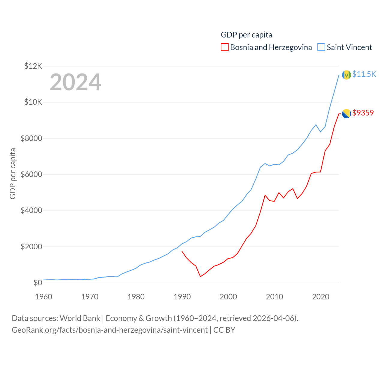 By GDP, Bosnia and Herzegovina ranks 111/197 ($29.6B) and Saint Vincent ranks 186/197 ($1.16B). By GDP per capita, Bosnia and Herzegovina ranks 87/197 ($9,359), while Saint Vincent ranks 81/197 ($11,501).