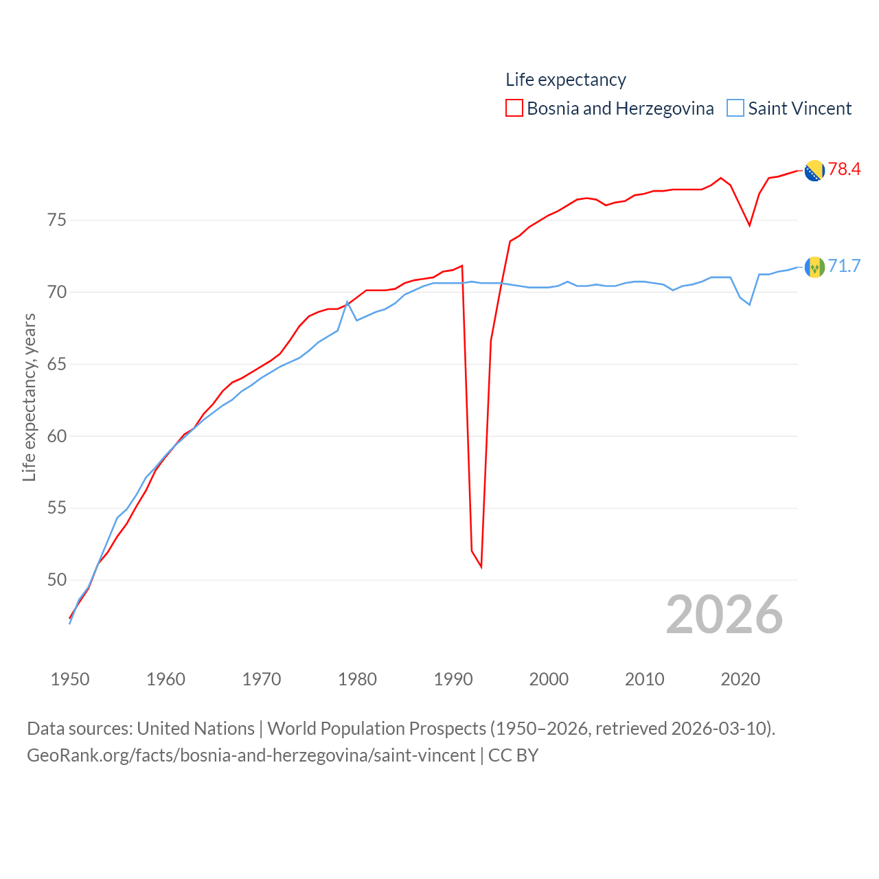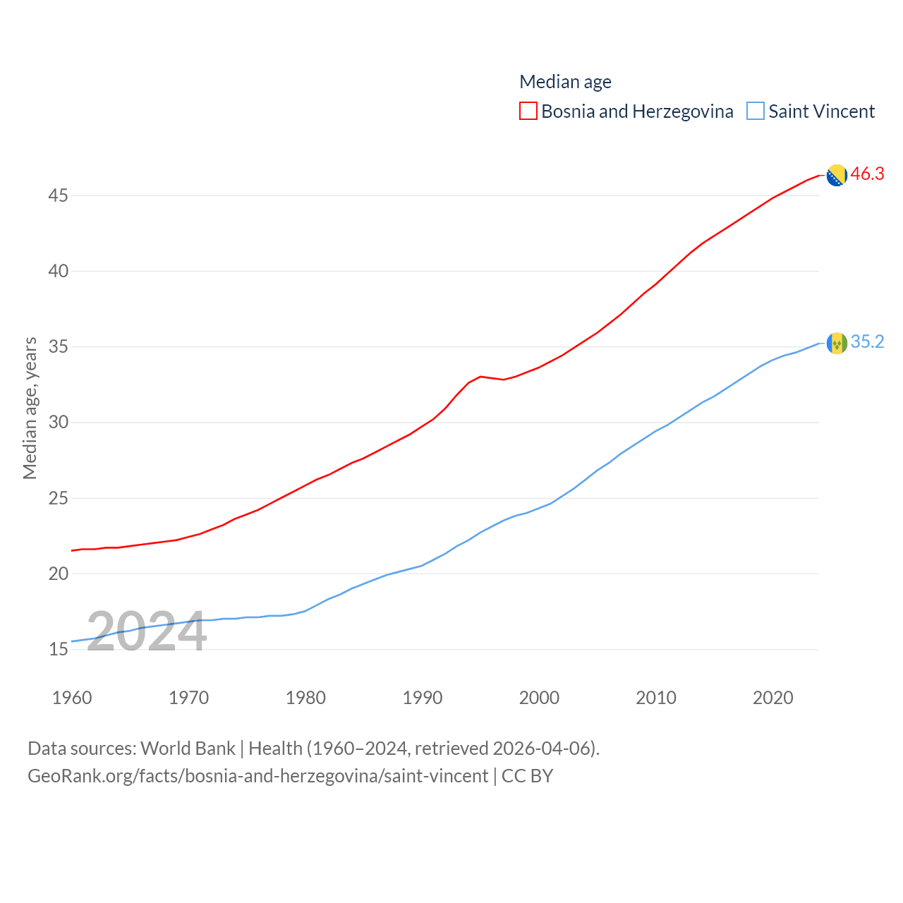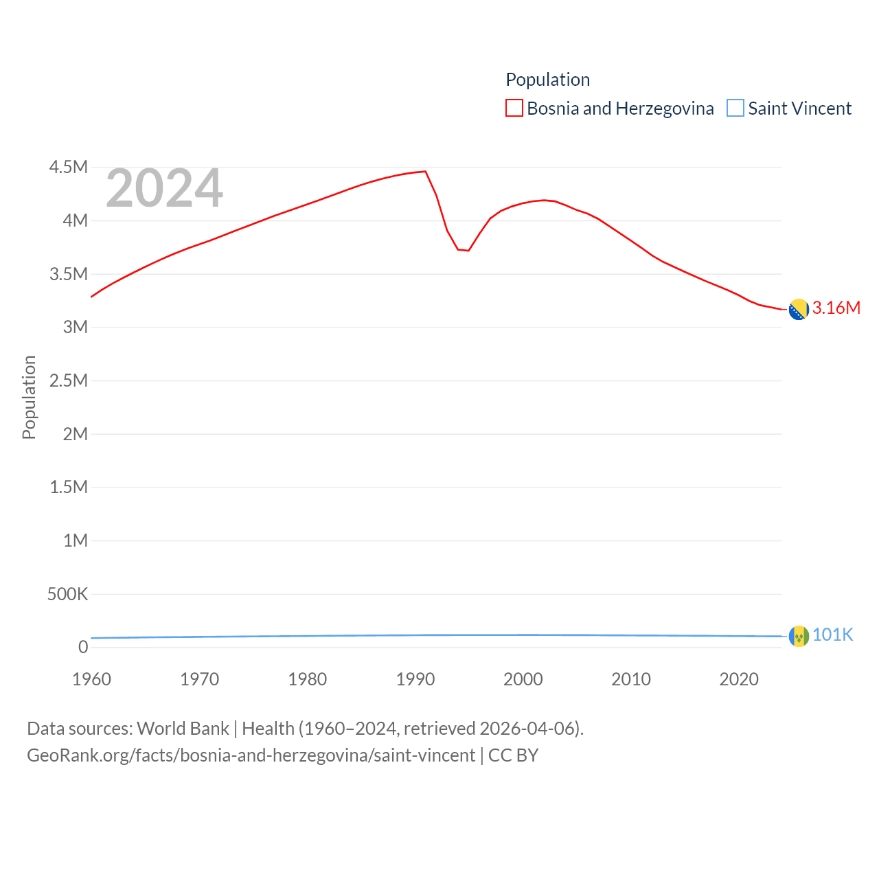 Bosnia and Herzegovina has a population of 3.16M (ranked 134/197), compared with 101K in Saint Vincent (ranked 184/197). Bosnia and Herzegovina's land area is 19,768 sq mi versus 150.6 sq mi for Saint Vincent (ranked 125th vs. 185th).
