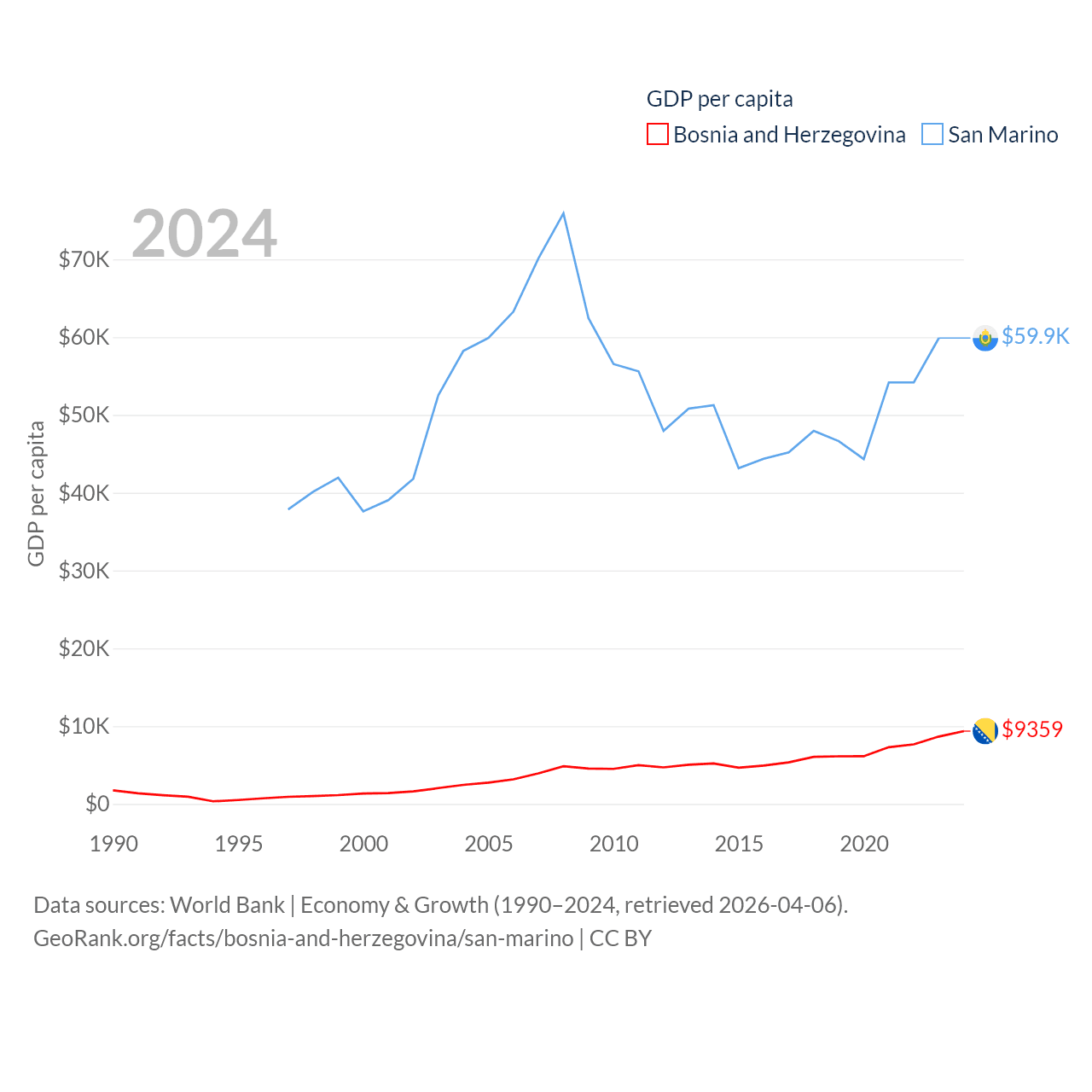 By GDP, Bosnia and Herzegovina ranks 111/197 ($29.6B) and San Marino ranks 180/197 ($2.03B). By GDP per capita, Bosnia and Herzegovina ranks 87/197 ($9,359), while San Marino ranks 15/197 ($59,880).