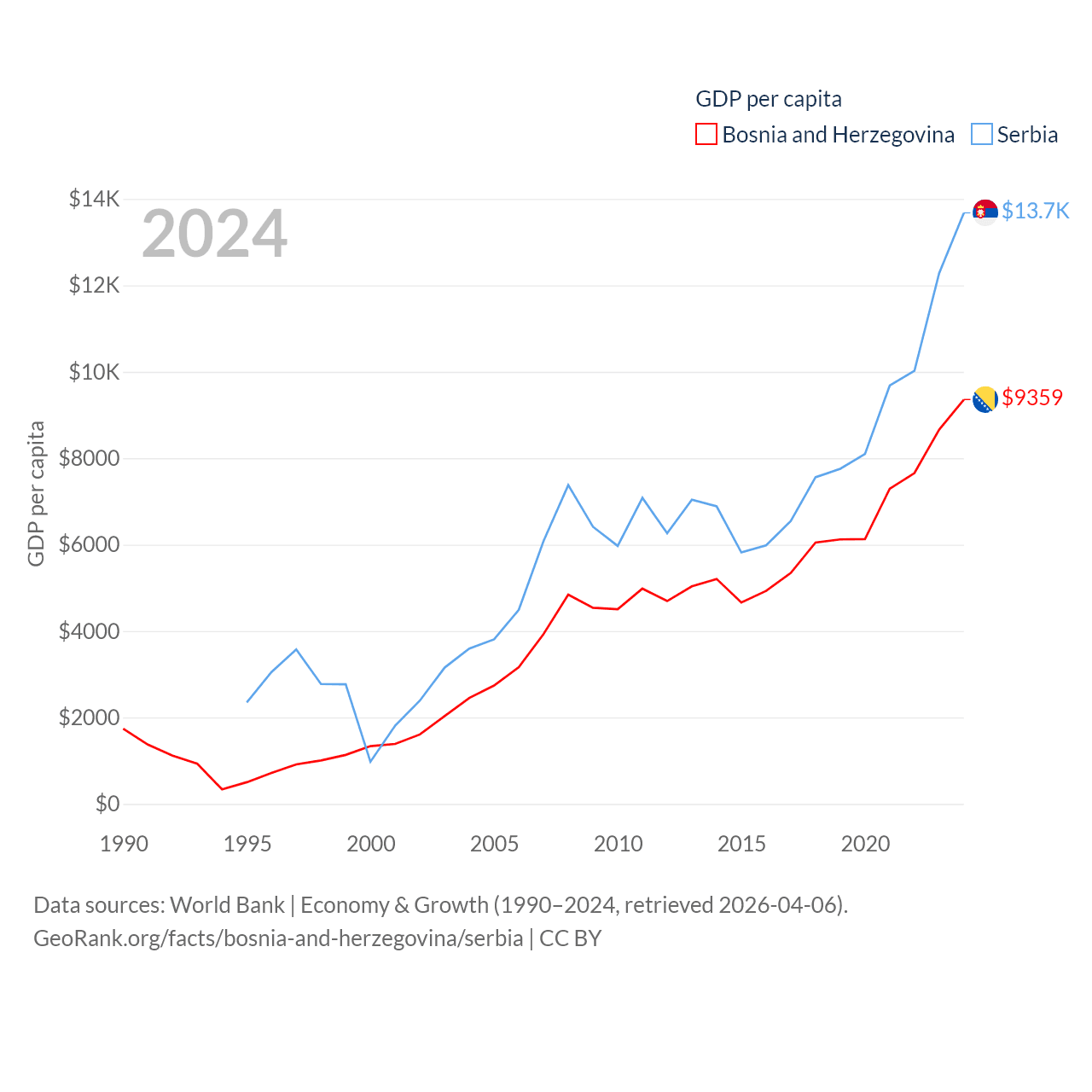 By GDP, Bosnia and Herzegovina ranks 111/197 ($29.6B) and Serbia ranks 76/197 ($90.1B). By GDP per capita, Bosnia and Herzegovina ranks 87/197 ($9,359), while Serbia ranks 73/197 ($13,679).