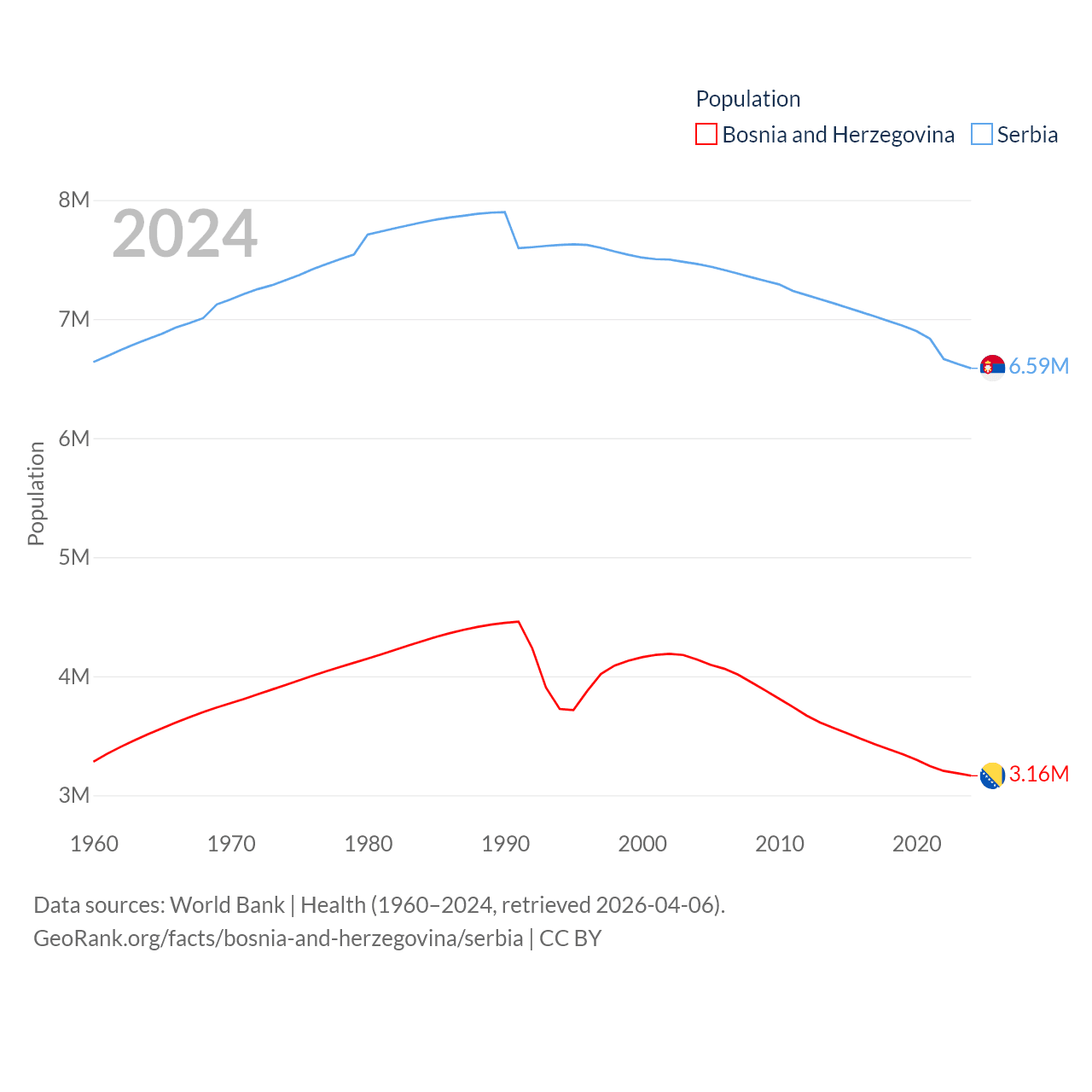 Bosnia and Herzegovina has a population of 3.16M (ranked 134/197), compared with 6.59M in Serbia (ranked 109/197). Bosnia and Herzegovina's land area is 19,768 sq mi versus 32,467 sq mi for Serbia (ranked 125th vs. 111th).