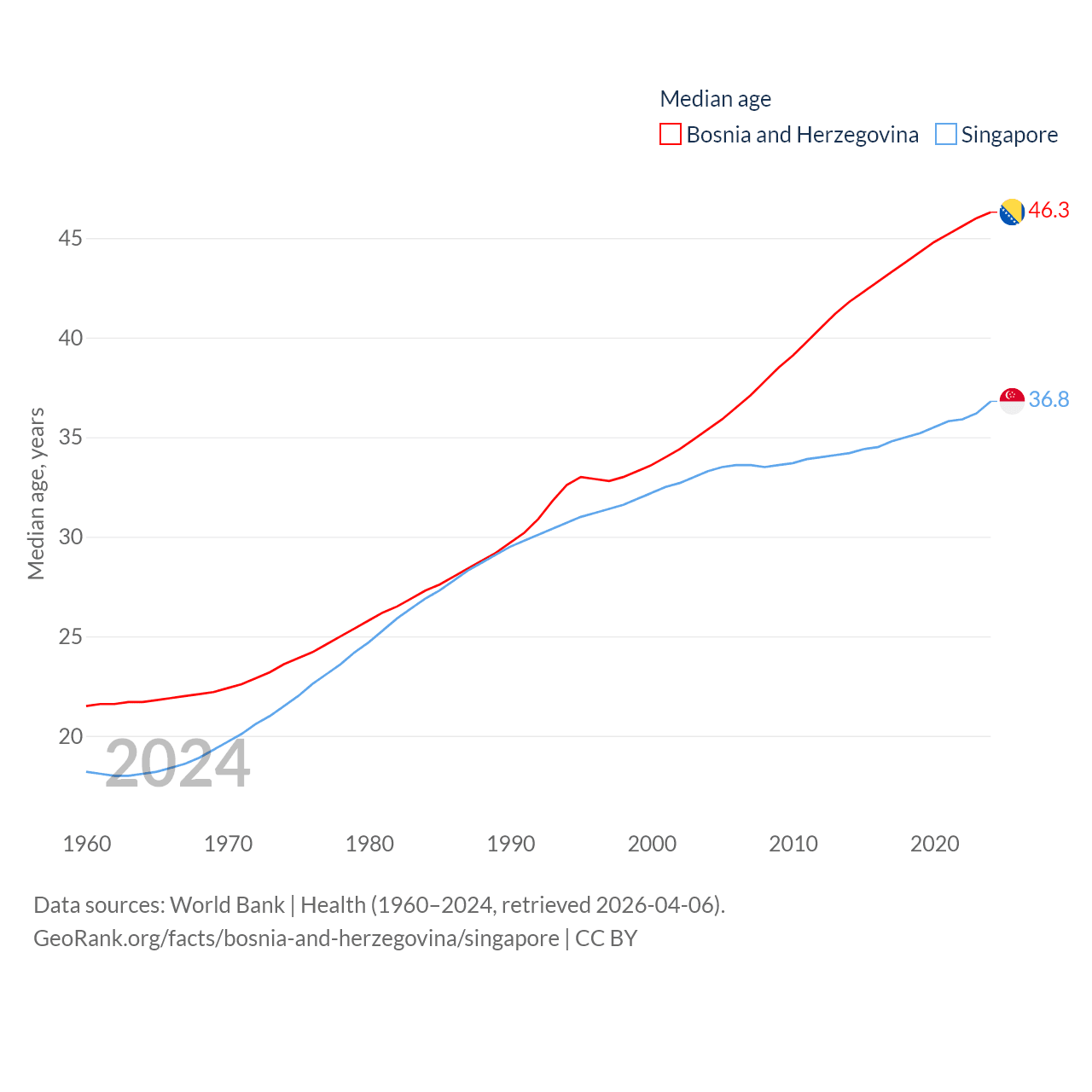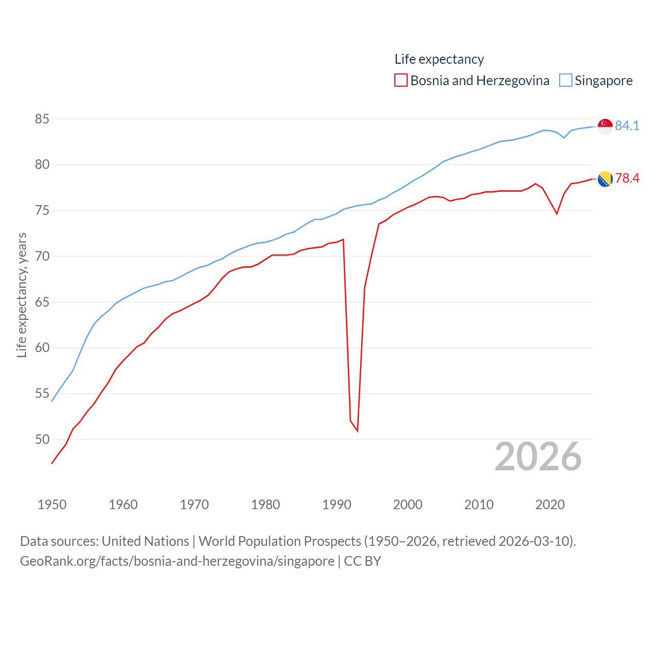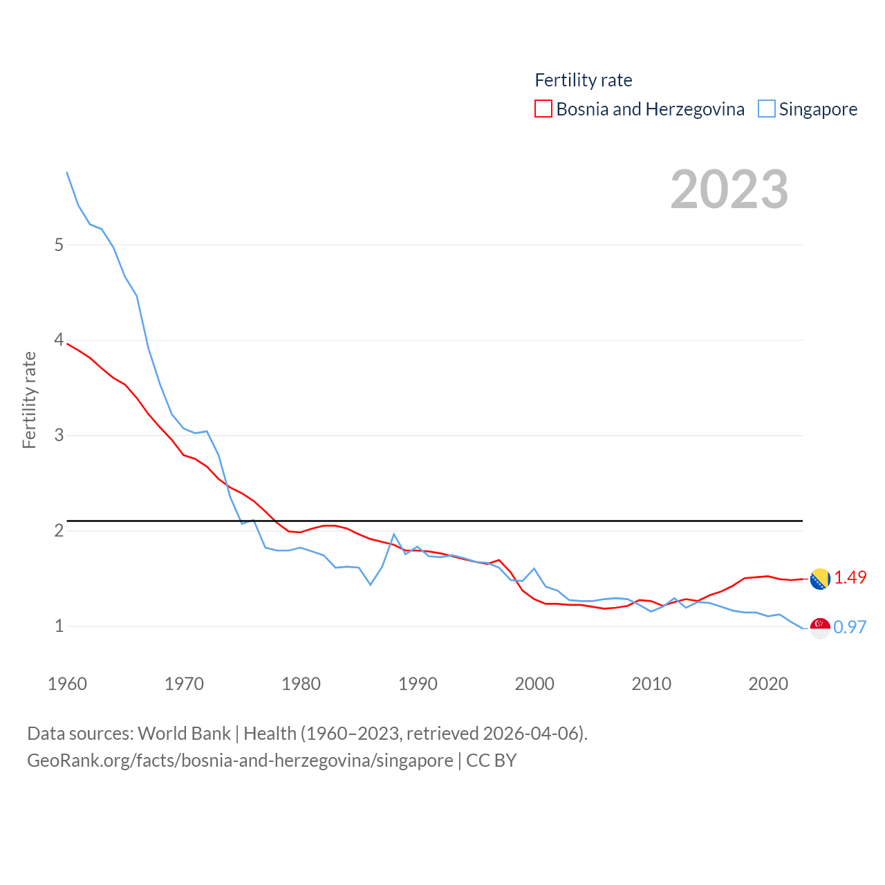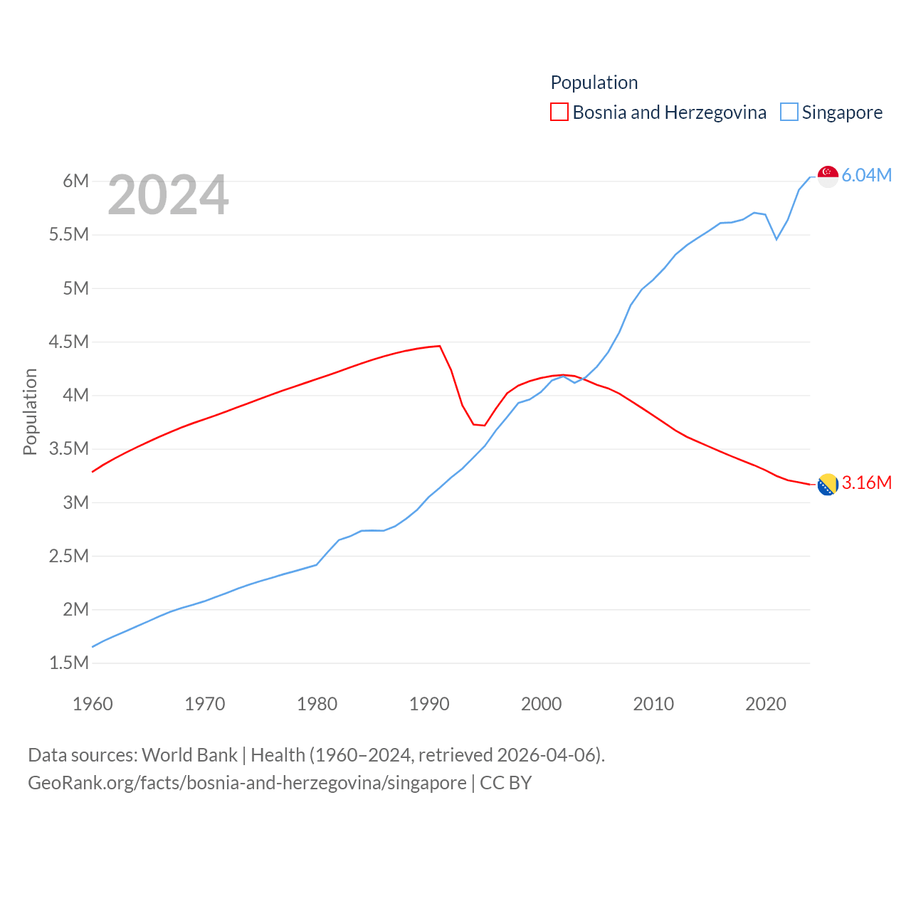Bosnia and Herzegovina has a population of 3.16M (ranked 134/197), compared with 6.04M in Singapore (ranked 113/197). Bosnia and Herzegovina's land area is 19,768 sq mi versus 277.2 sq mi for Singapore (ranked 125th vs. 177th).