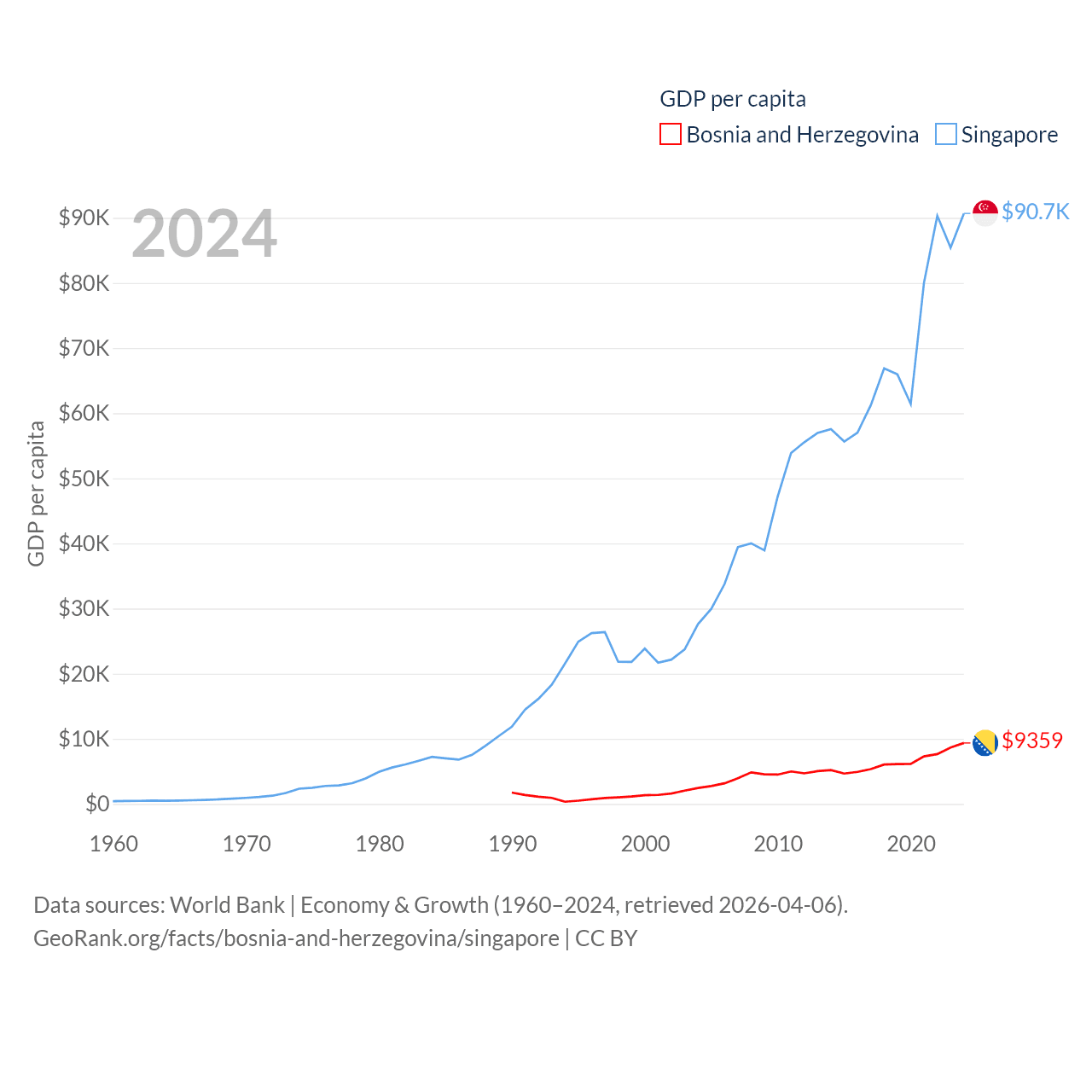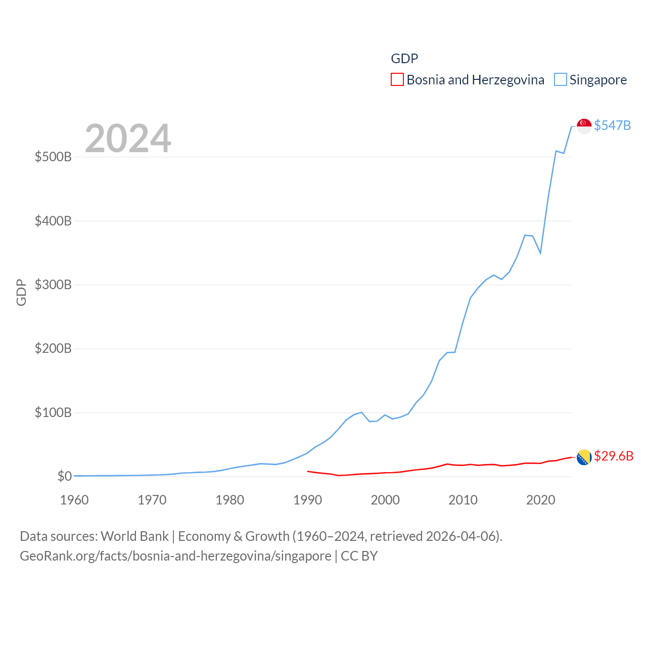 By GDP, Bosnia and Herzegovina ranks 111/197 ($29.6B) and Singapore ranks 28/197 ($547B). By GDP per capita, Bosnia and Herzegovina ranks 87/197 ($9,359), while Singapore ranks 7/197 ($90,674).