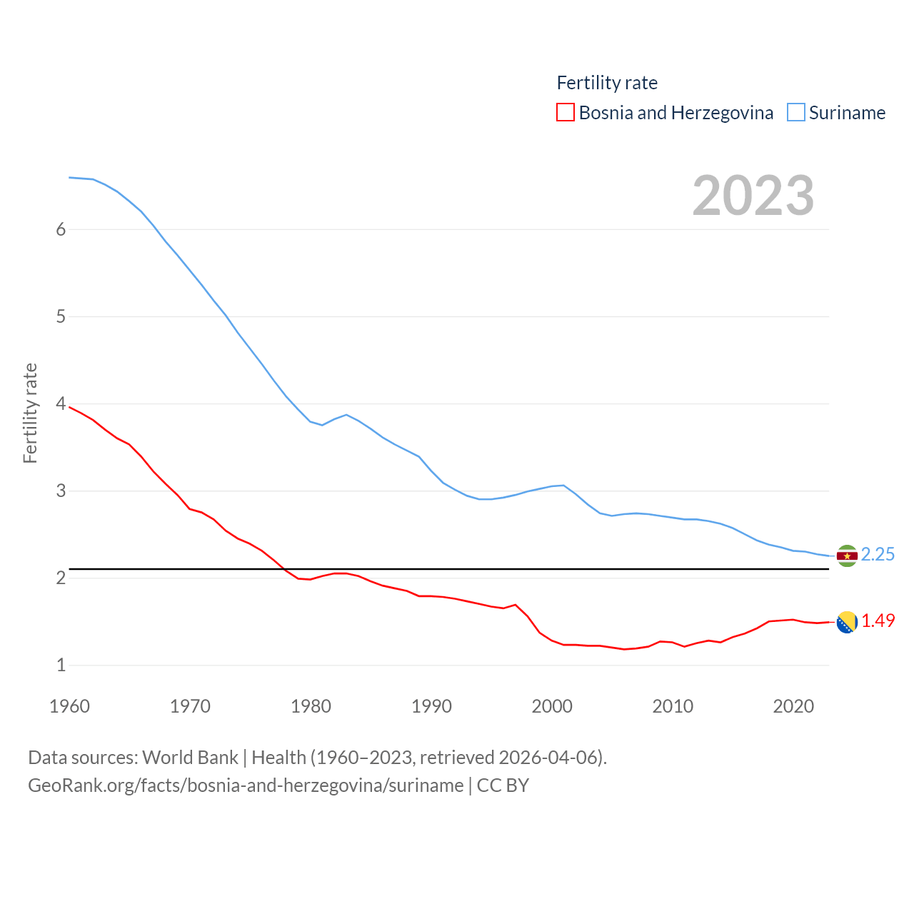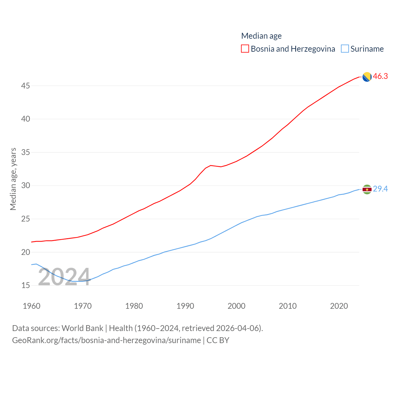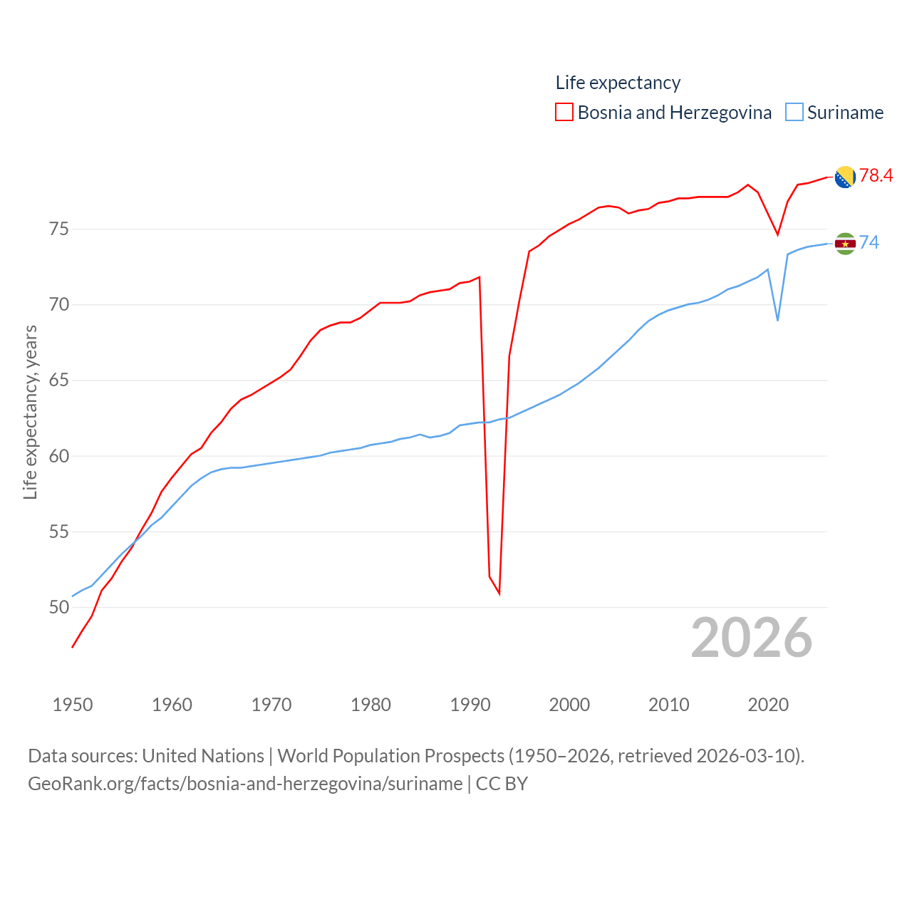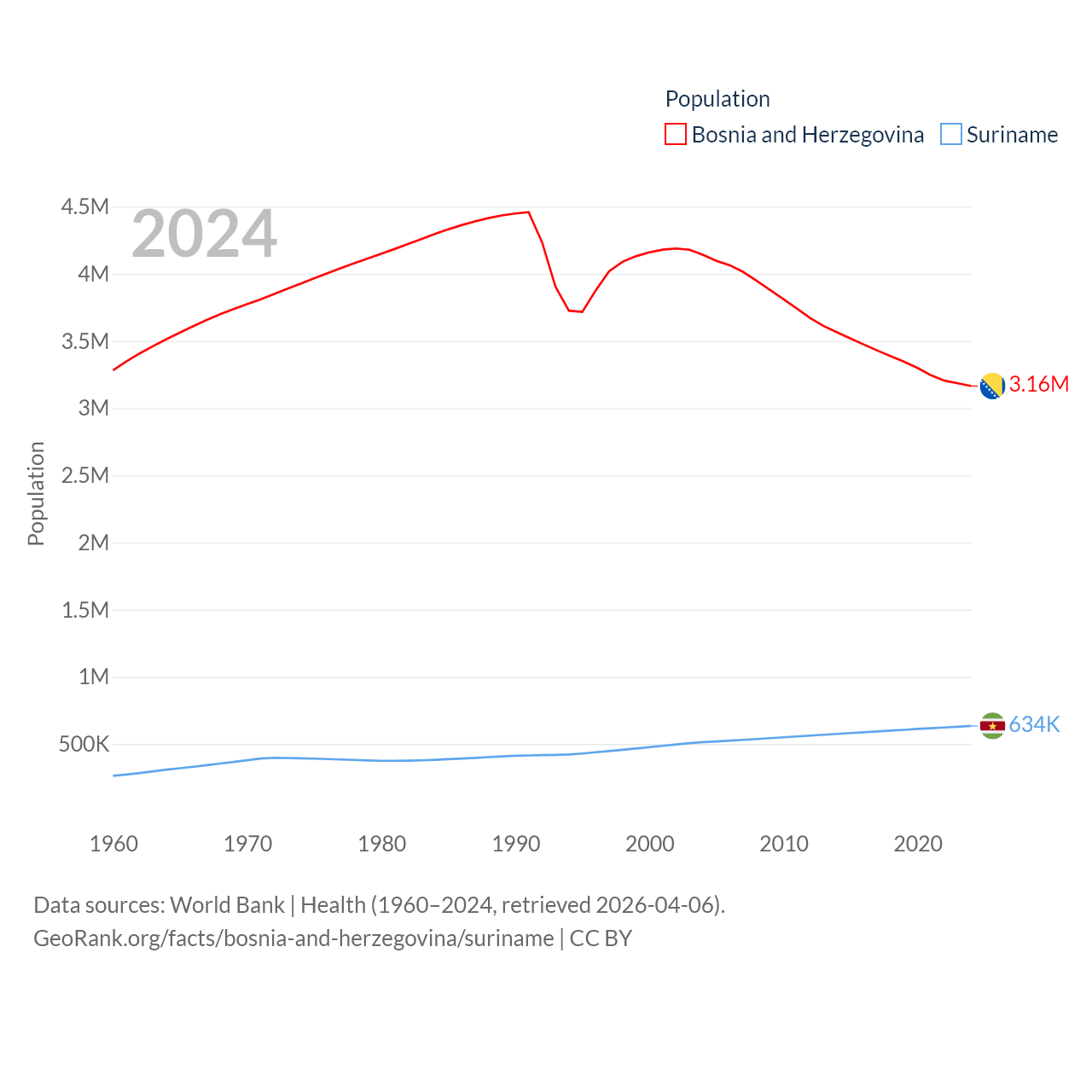 Bosnia and Herzegovina has a population of 3.16M (ranked 134/197), compared with 634K in Suriname (ranked 165/197). Bosnia and Herzegovina's land area is 19,768 sq mi versus 61,972 sq mi for Suriname (ranked 125th vs. 90th).