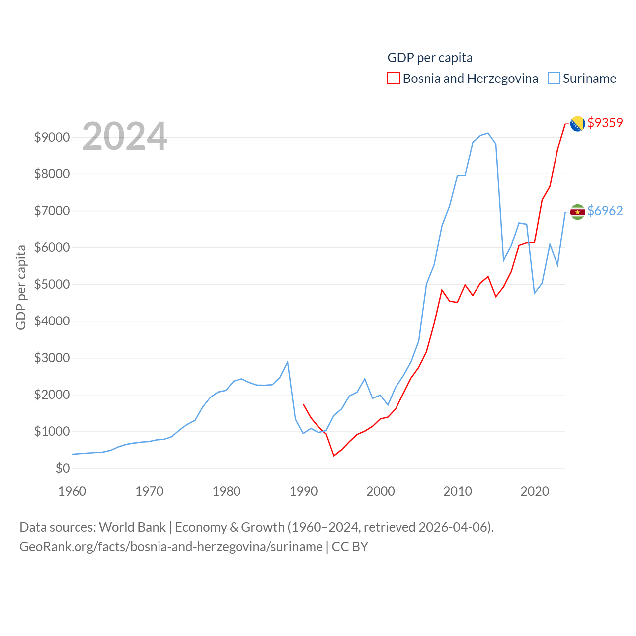 By GDP, Bosnia and Herzegovina ranks 111/197 ($29.6B) and Suriname ranks 164/197 ($4.42B). By GDP per capita, Bosnia and Herzegovina ranks 87/197 ($9,359), while Suriname ranks 102/197 ($6,962).