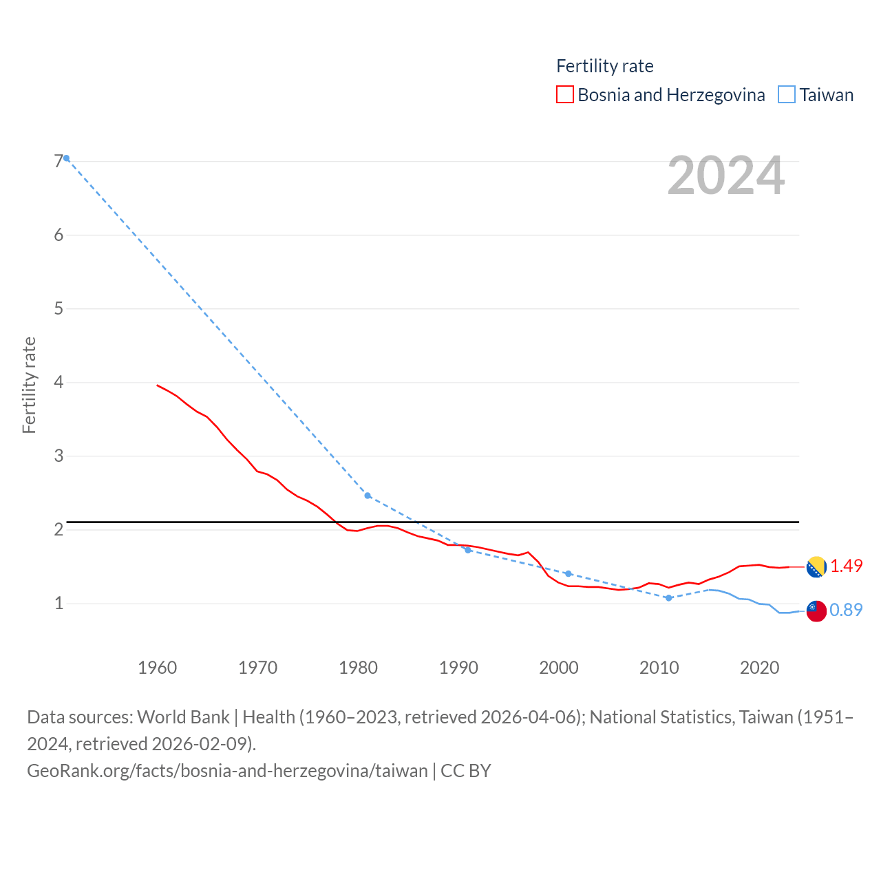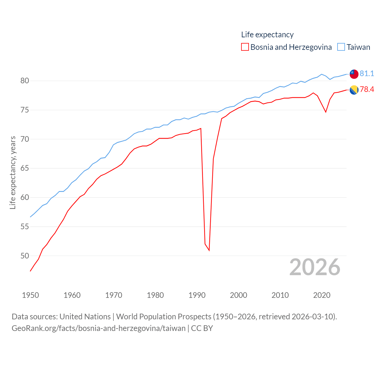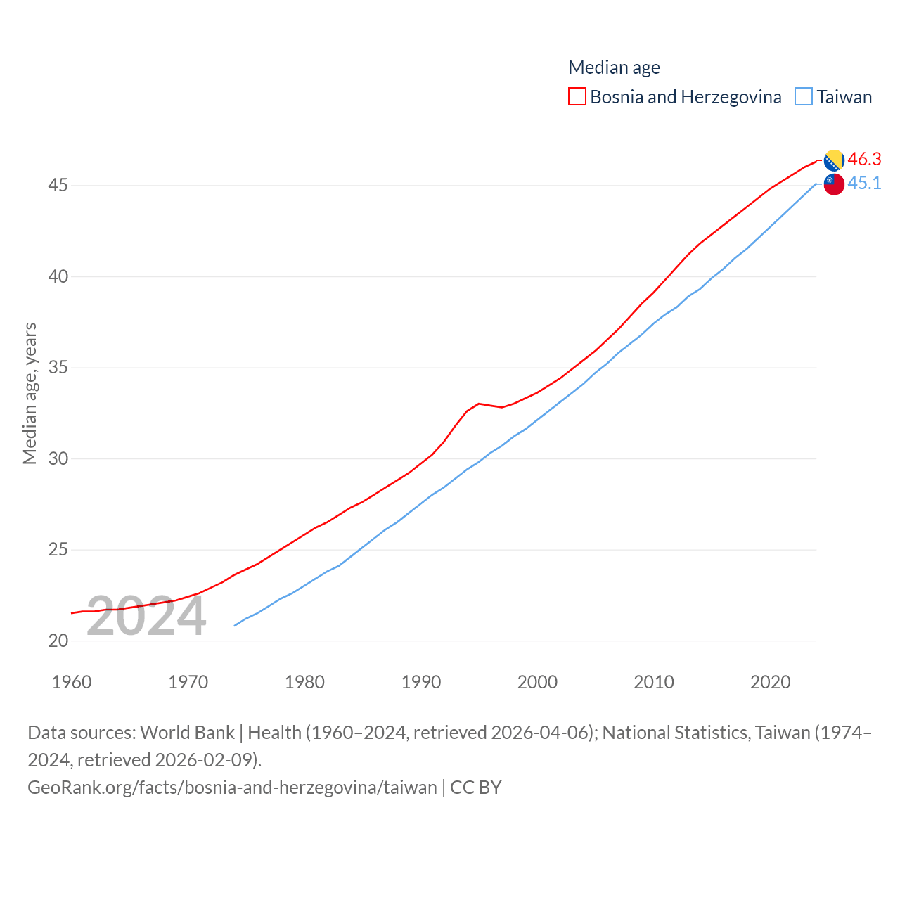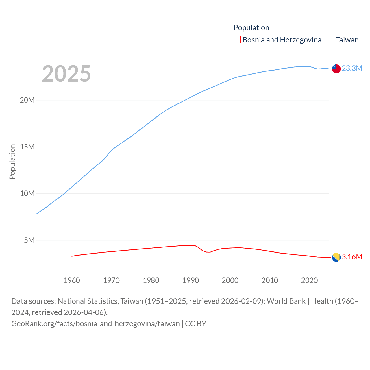 Bosnia and Herzegovina has a population of 3.16M (ranked 134/197), compared with 23.3M in Taiwan (ranked 60/197). Bosnia and Herzegovina's land area is 19,768 sq mi versus 13,976 sq mi for Taiwan (ranked 125th vs. 133rd).