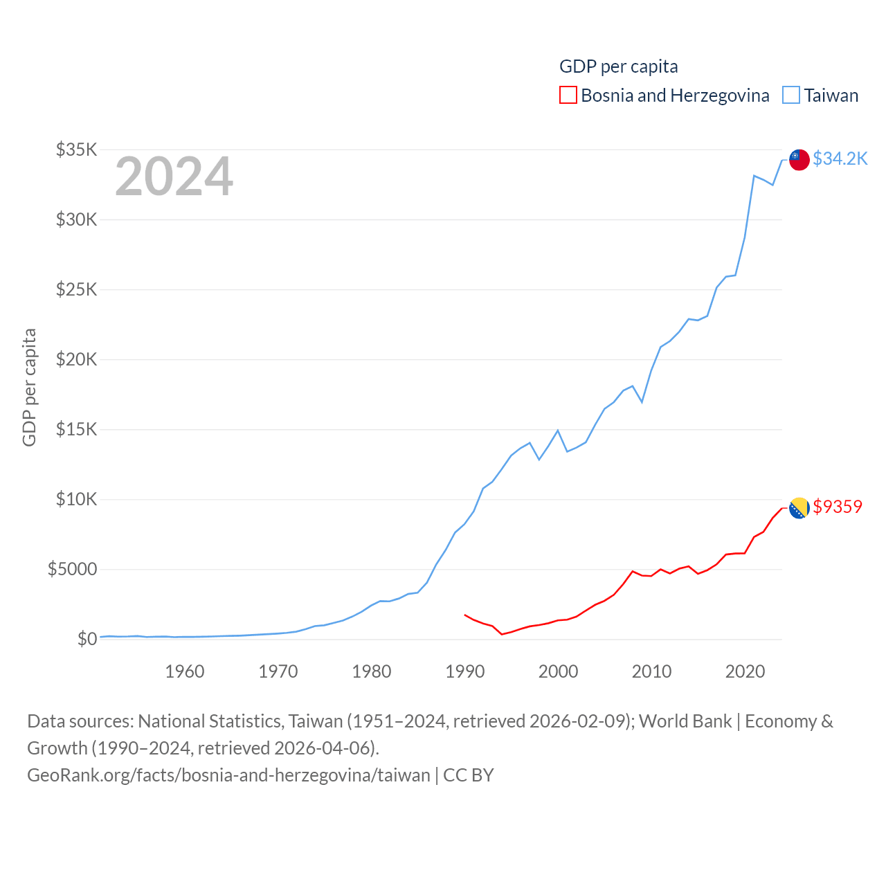 By GDP, Bosnia and Herzegovina ranks 111/197 ($29.6B) and Taiwan ranks 22/197 ($802B). By GDP per capita, Bosnia and Herzegovina ranks 87/197 ($9,359), while Taiwan ranks 35/197 ($34,238).