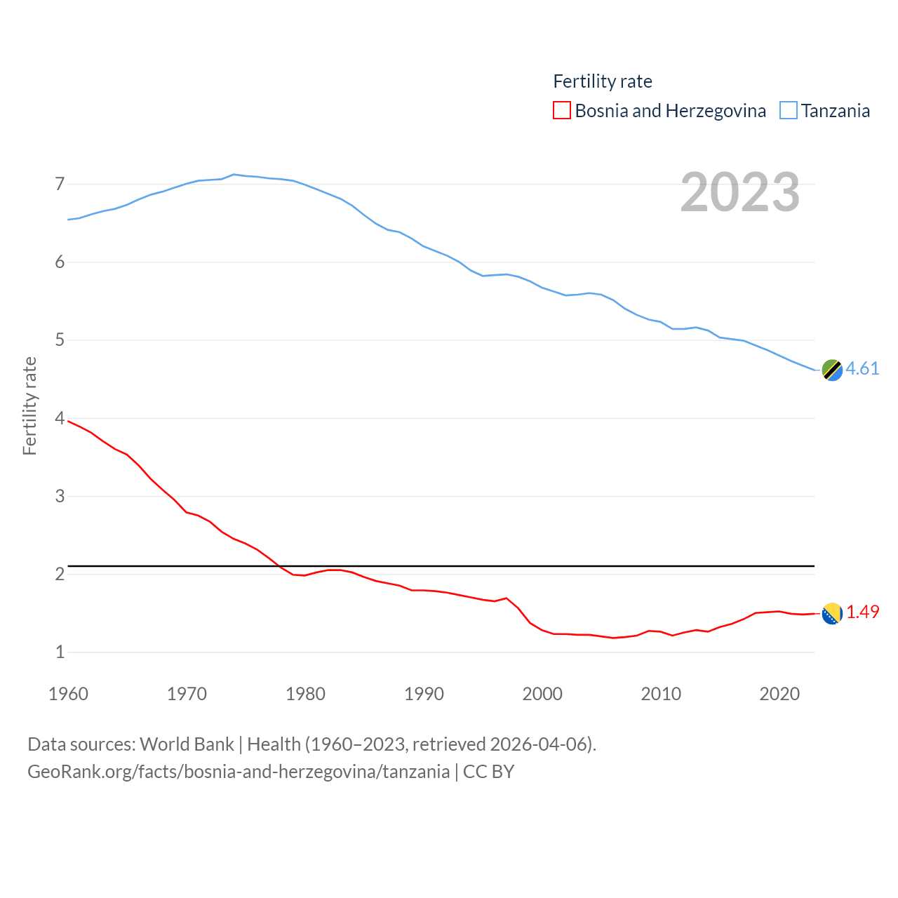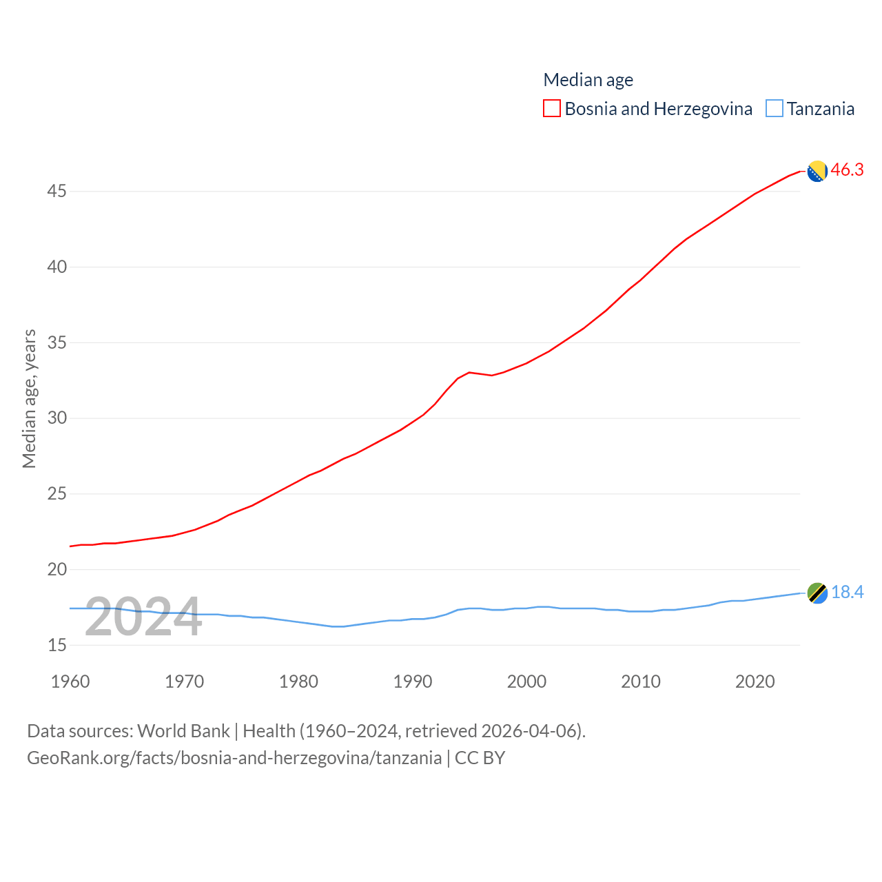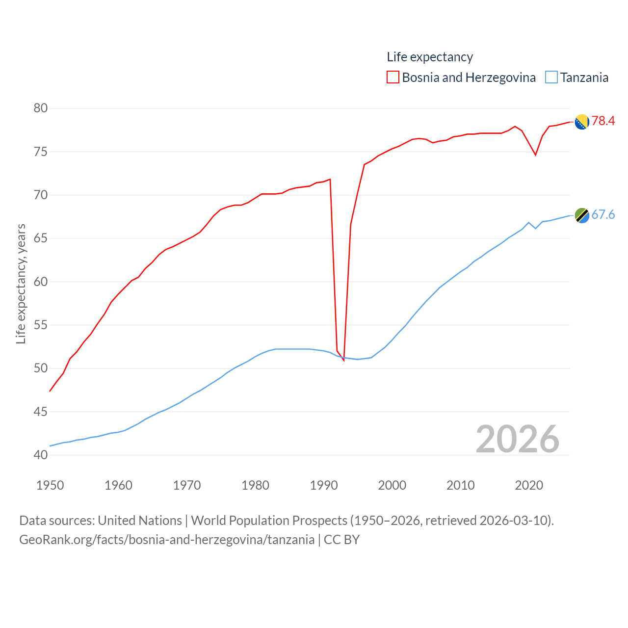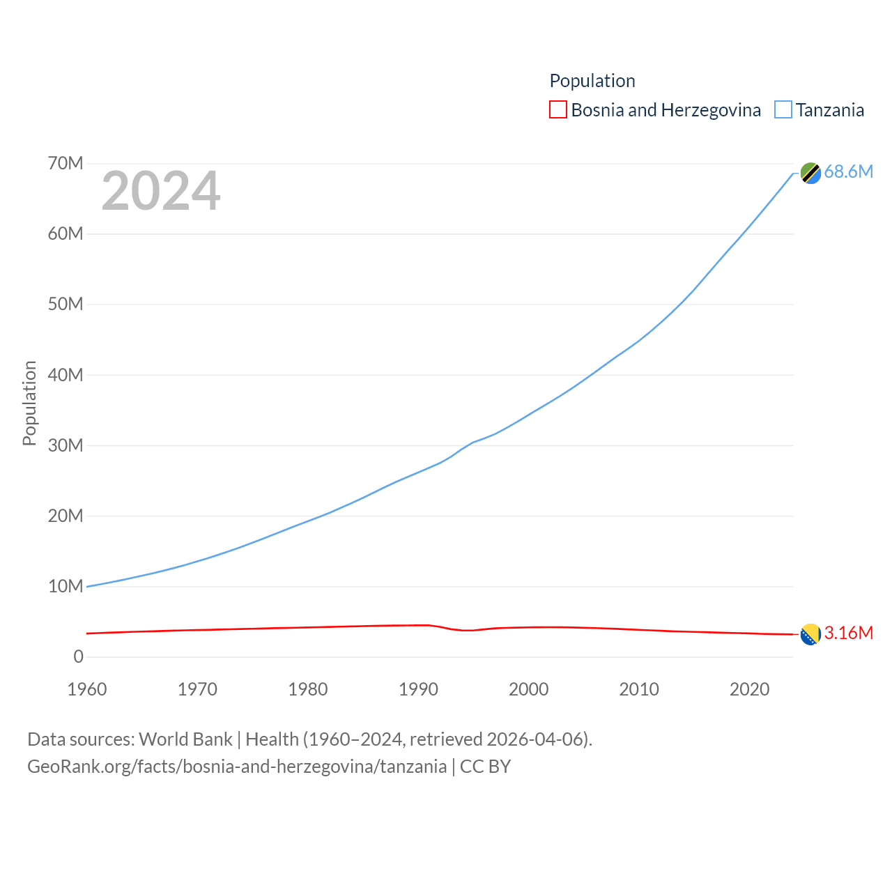 Bosnia and Herzegovina has a population of 3.16M (ranked 134/197), compared with 68.6M in Tanzania (ranked 22/197). Bosnia and Herzegovina's land area is 19,768 sq mi versus 342,009 sq mi for Tanzania (ranked 125th vs. 31st).