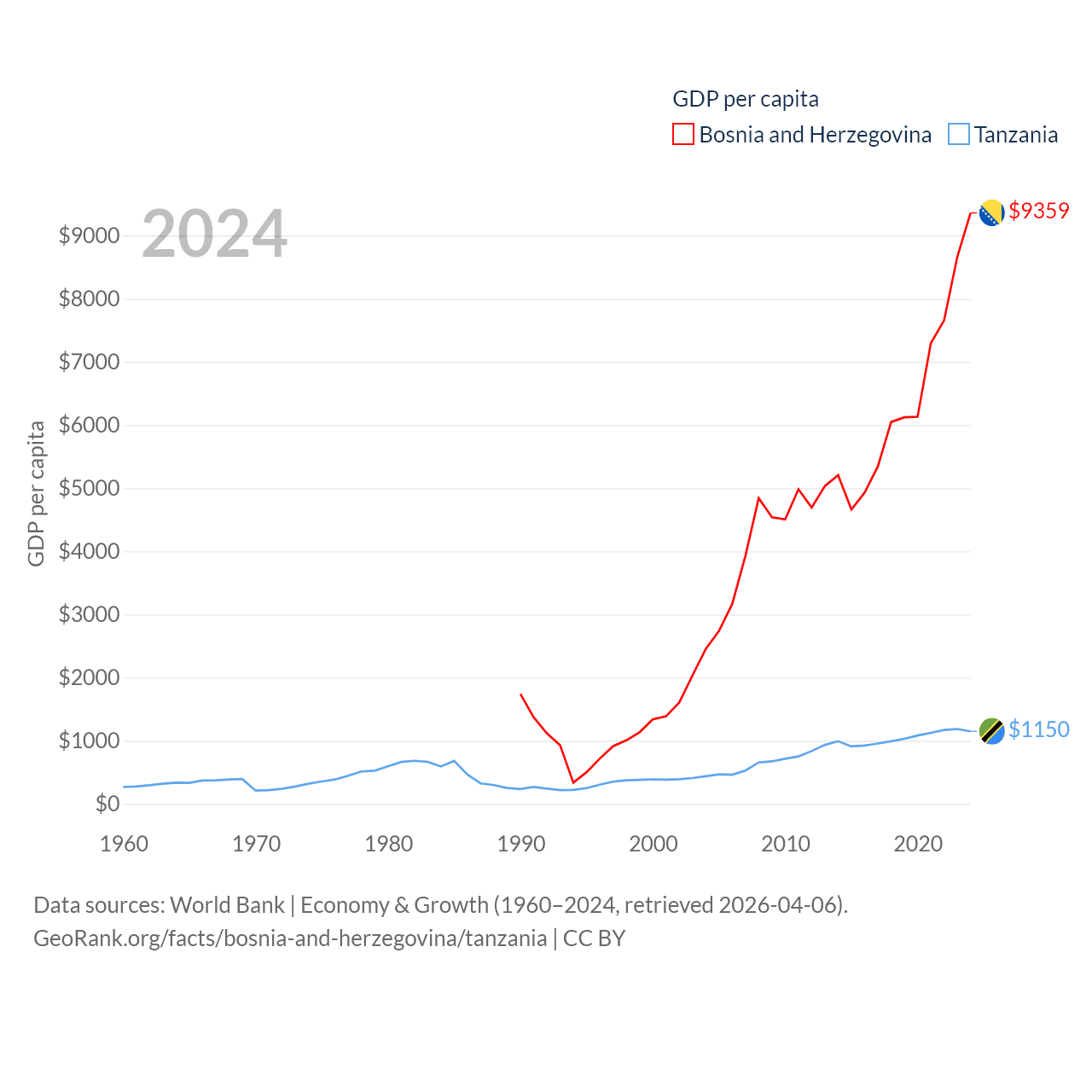 By GDP, Bosnia and Herzegovina ranks 111/197 ($29.6B) and Tanzania ranks 82/197 ($78.8B). By GDP per capita, Bosnia and Herzegovina ranks 87/197 ($9,359), while Tanzania ranks 170/197 ($1,150).