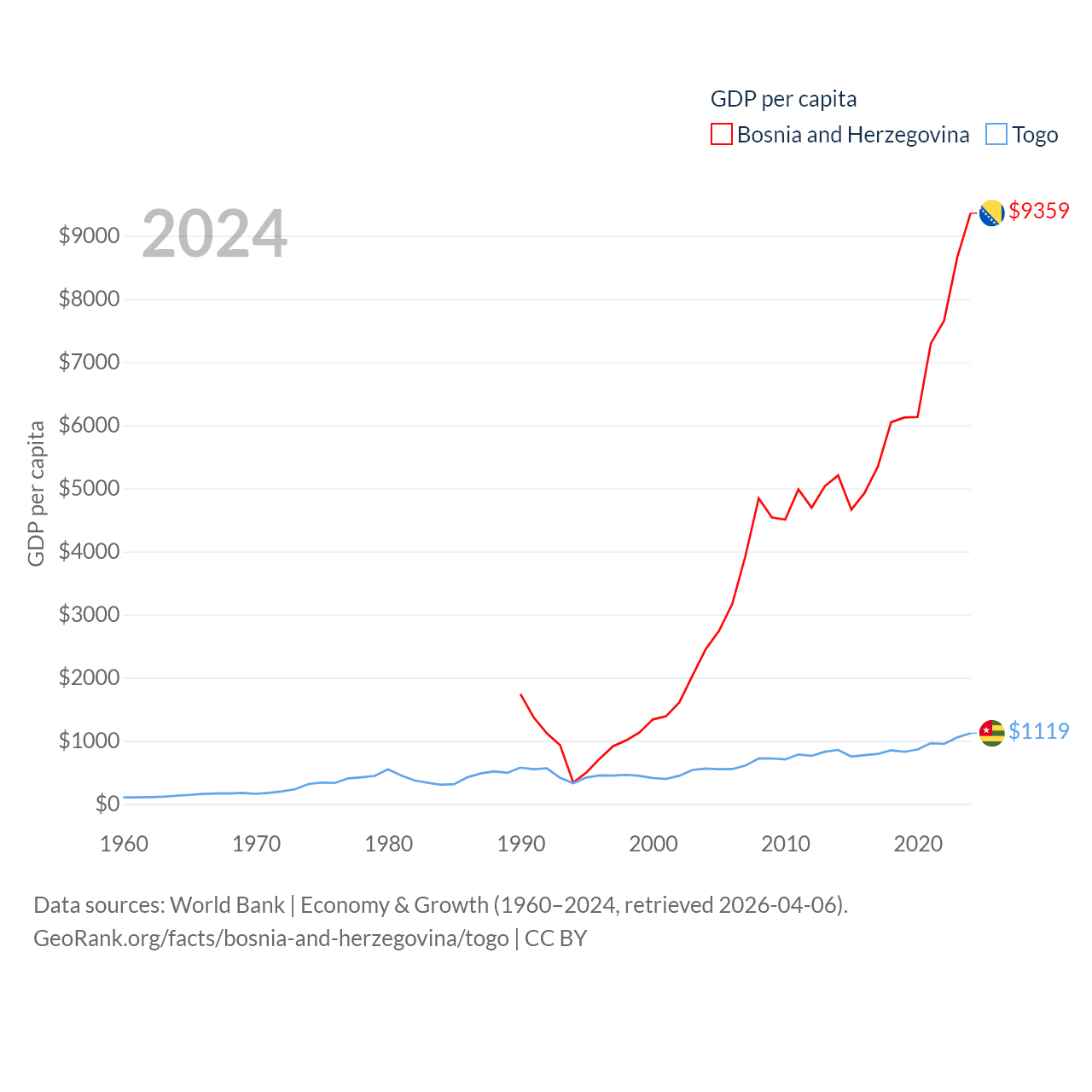 By GDP, Bosnia and Herzegovina ranks 111/197 ($29.6B) and Togo ranks 154/197 ($10.7B). By GDP per capita, Bosnia and Herzegovina ranks 87/197 ($9,359), while Togo ranks 172/197 ($1,119).