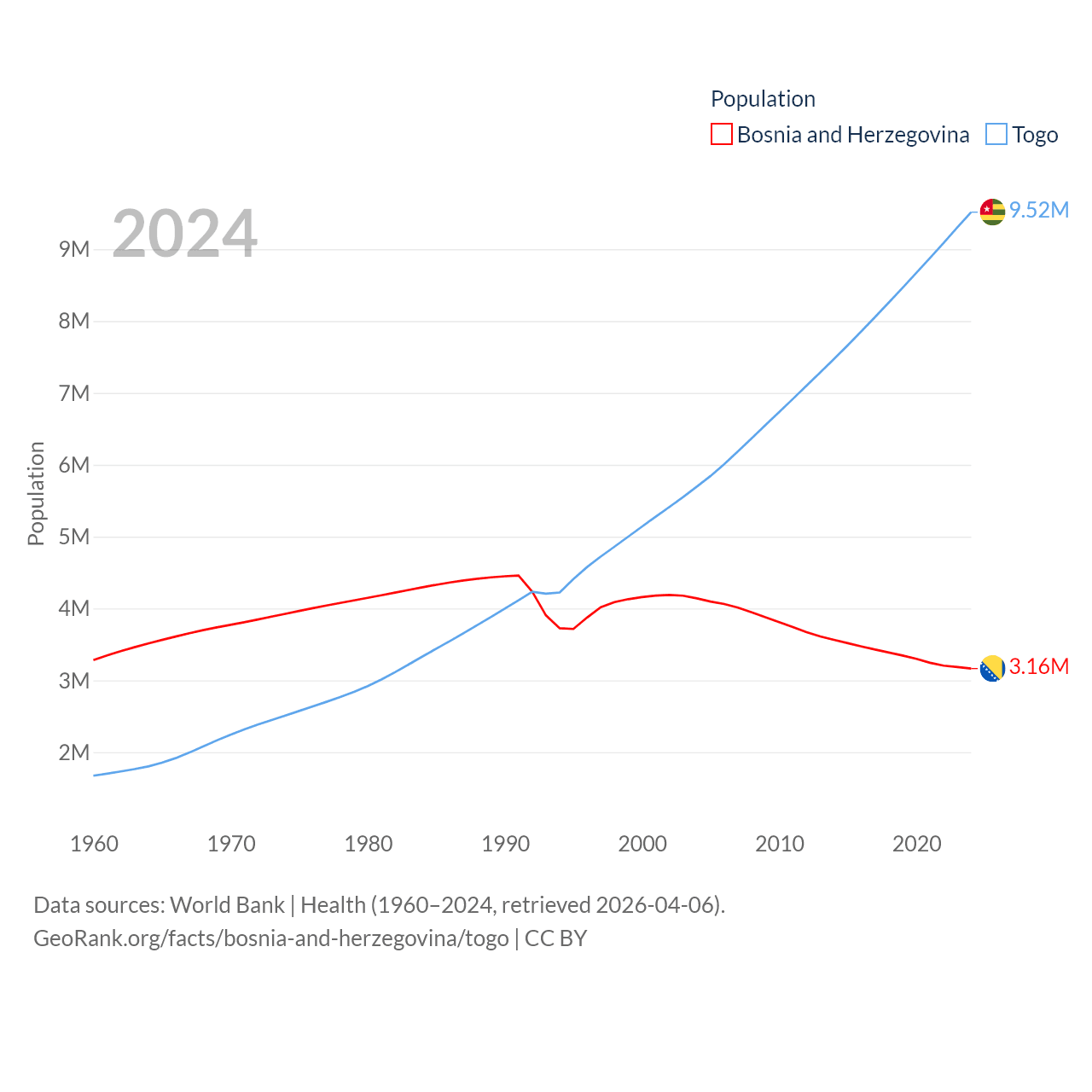 Bosnia and Herzegovina has a population of 3.16M (ranked 134/197), compared with 9.52M in Togo (ranked 98/197). Bosnia and Herzegovina's land area is 19,768 sq mi versus 21,000 sq mi for Togo (ranked 125th vs. 124th).