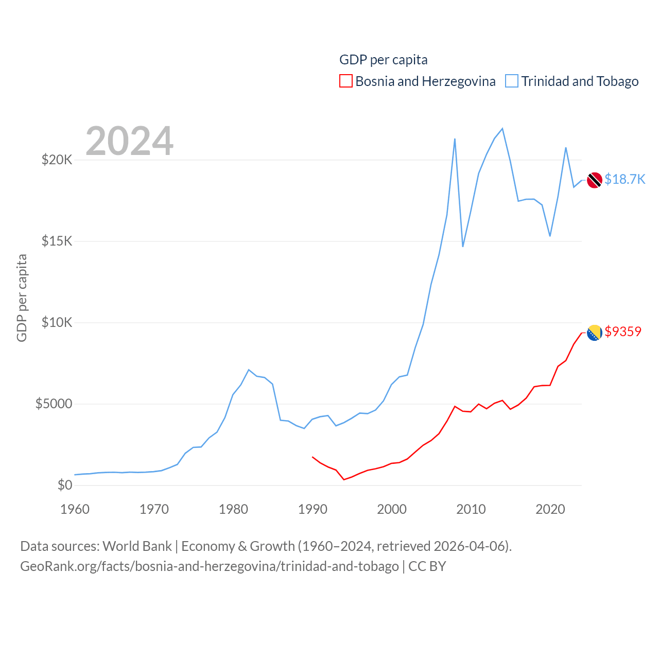 By GDP, Bosnia and Herzegovina ranks 111/197 ($29.6B) and Trinidad and Tobago ranks 115/197 ($25.6B). By GDP per capita, Bosnia and Herzegovina ranks 87/197 ($9,359), while Trinidad and Tobago ranks 61/197 ($18,733).