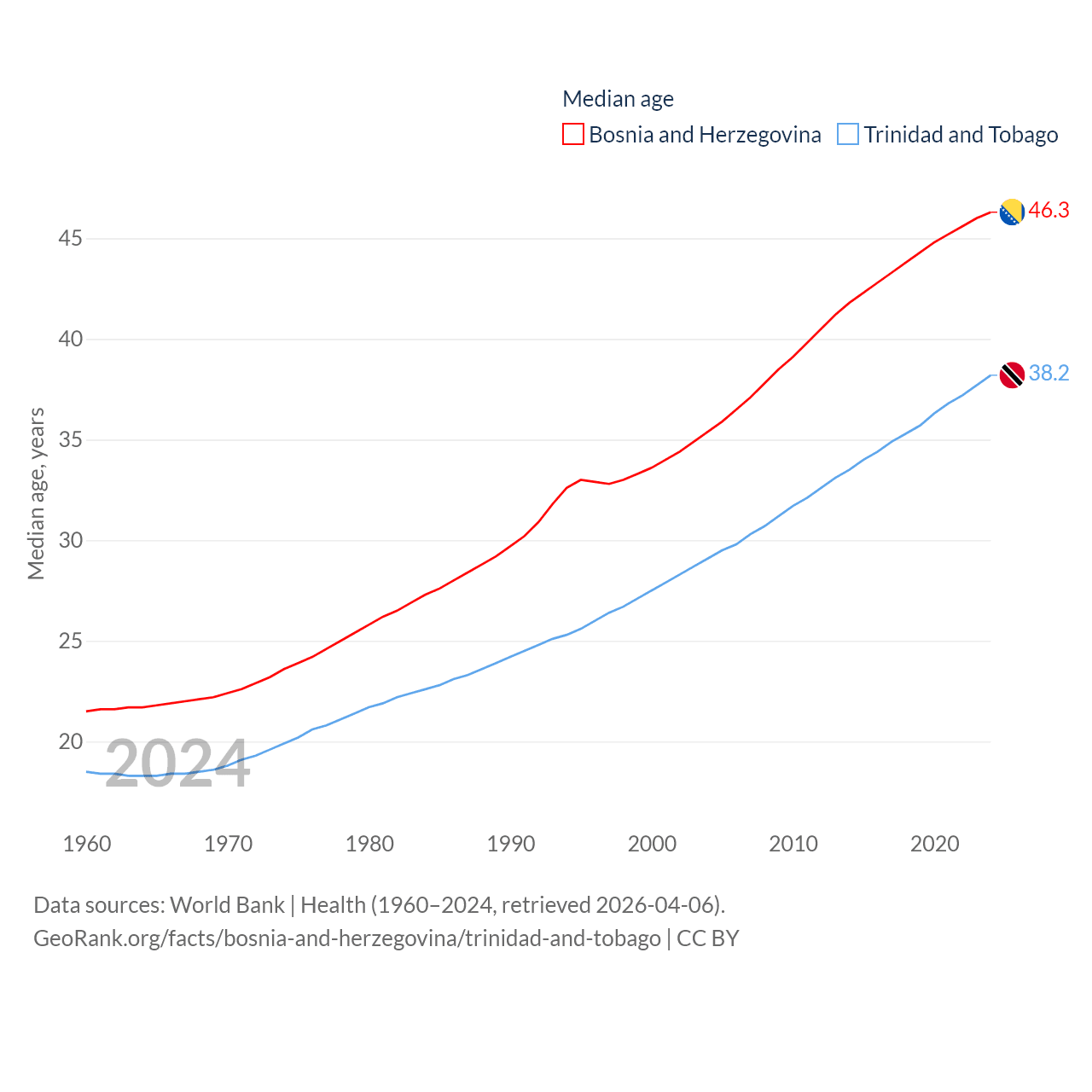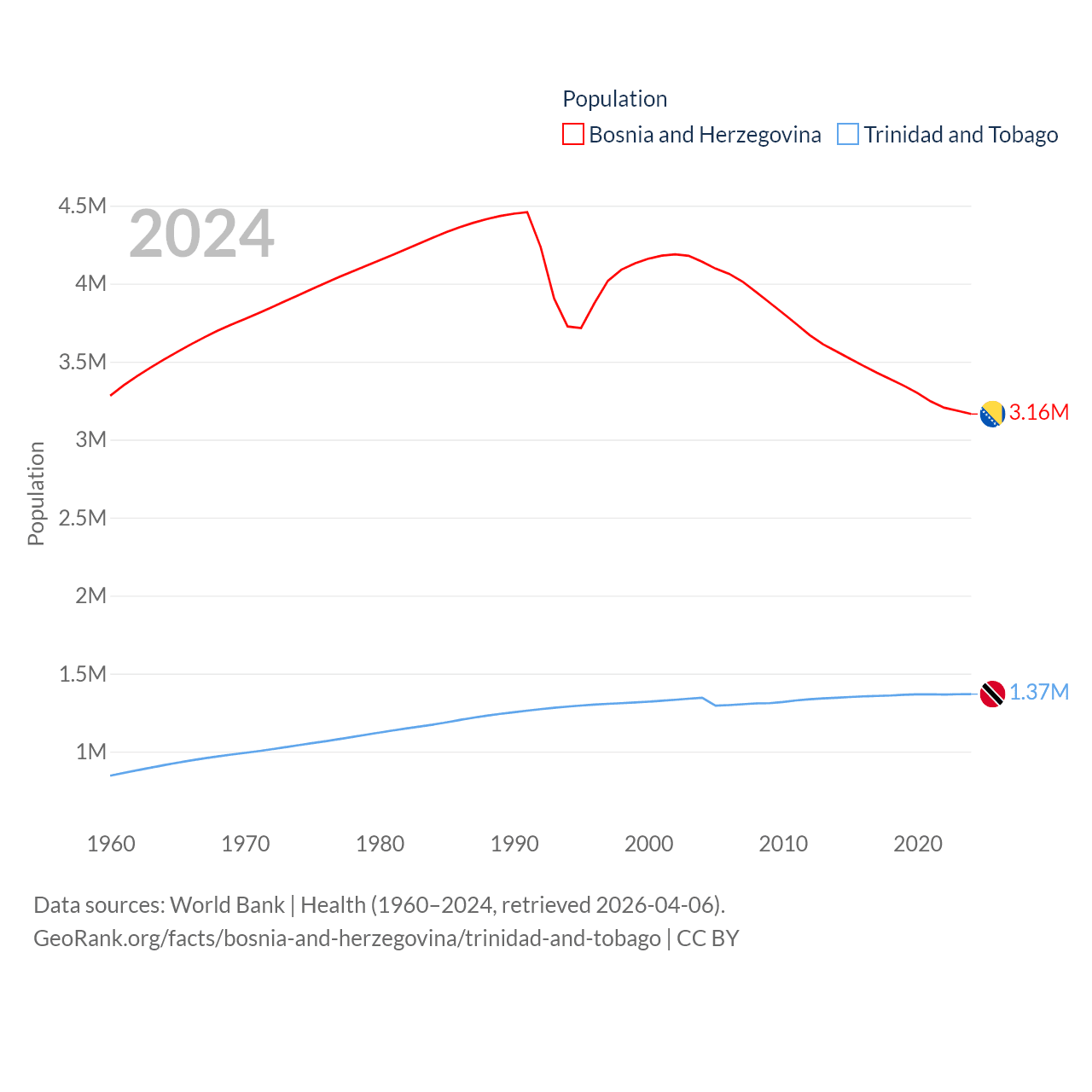 Bosnia and Herzegovina has a population of 3.16M (ranked 134/197), compared with 1.37M in Trinidad and Tobago (ranked 154/197). Bosnia and Herzegovina's land area is 19,768 sq mi versus 1,981 sq mi for Trinidad and Tobago (ranked 125th vs. 166th).