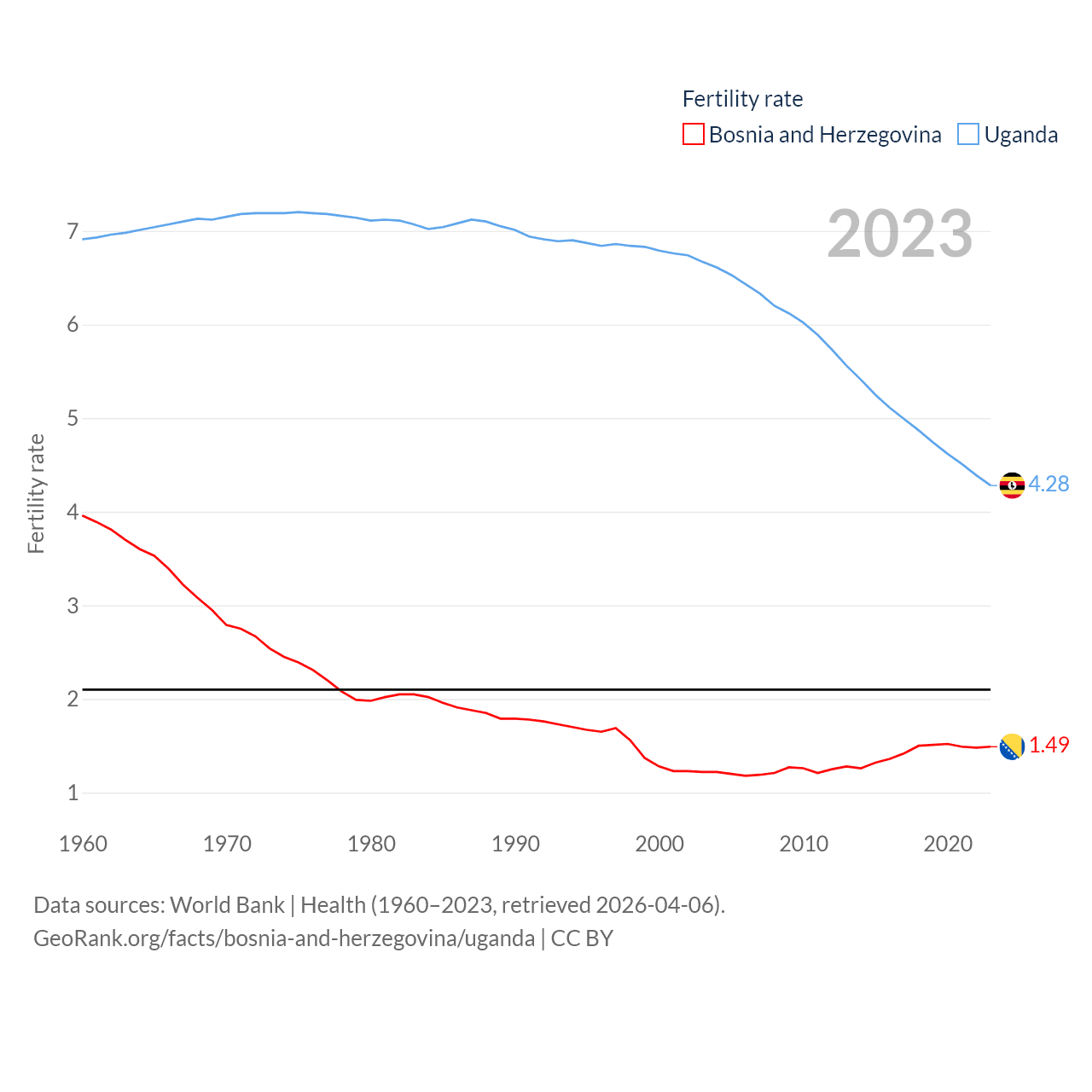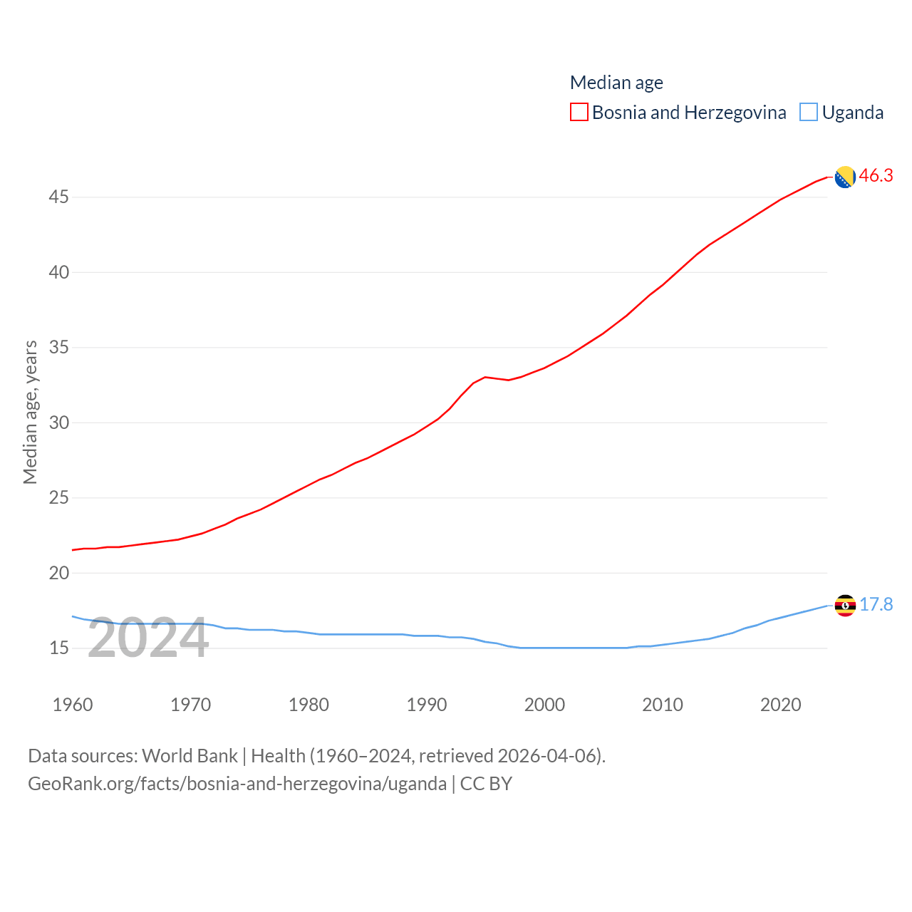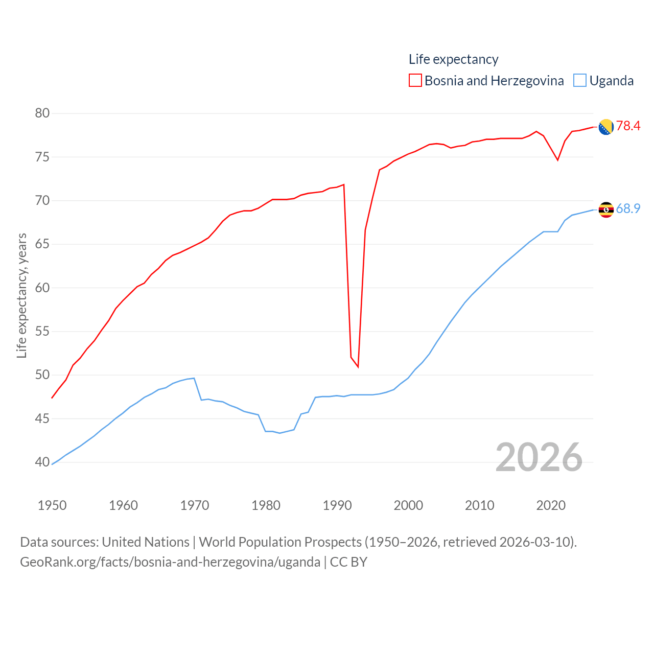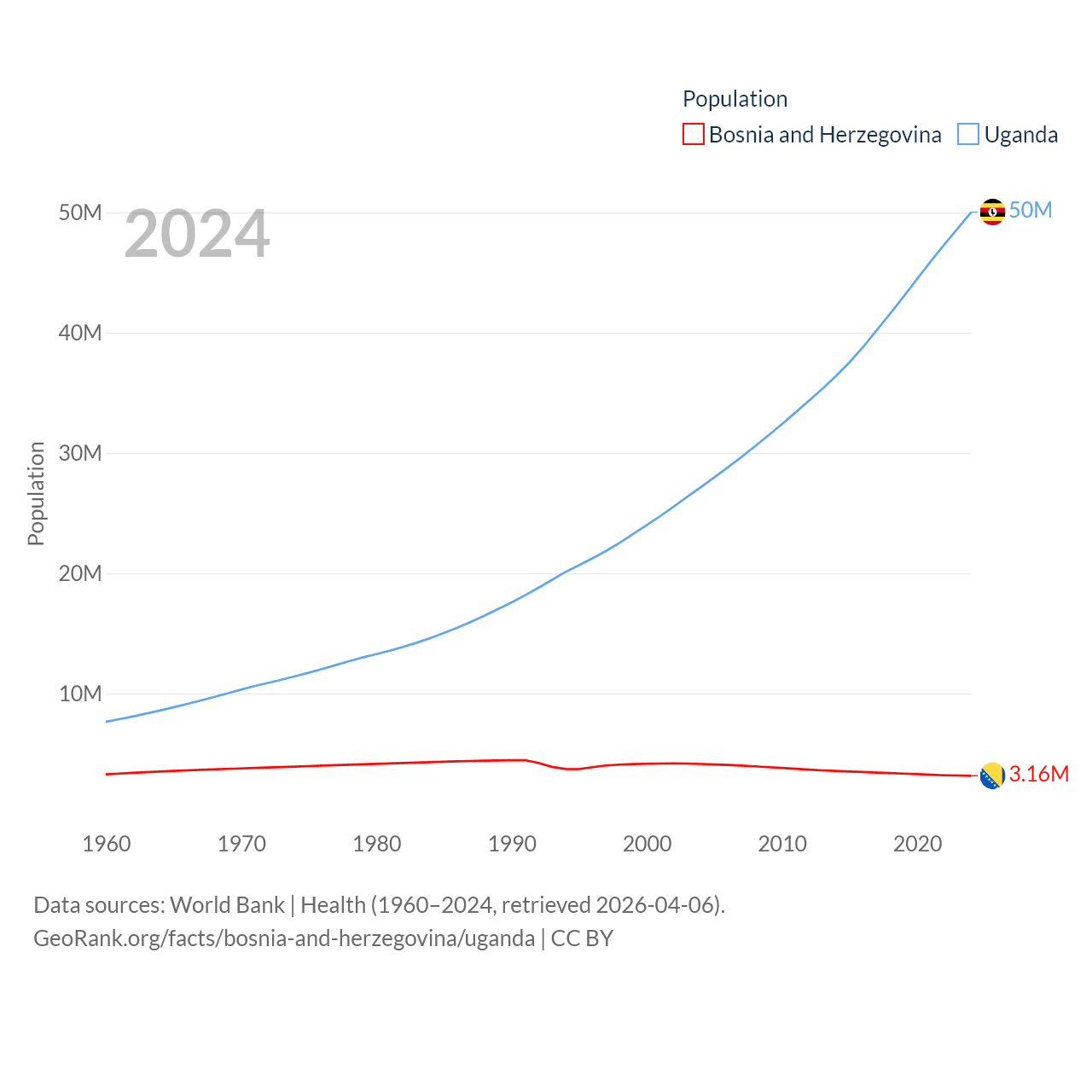 Bosnia and Herzegovina has a population of 3.16M (ranked 134/197), compared with 50M in Uganda (ranked 31/197). Bosnia and Herzegovina's land area is 19,768 sq mi versus 77,421 sq mi for Uganda (ranked 125th vs. 84th).