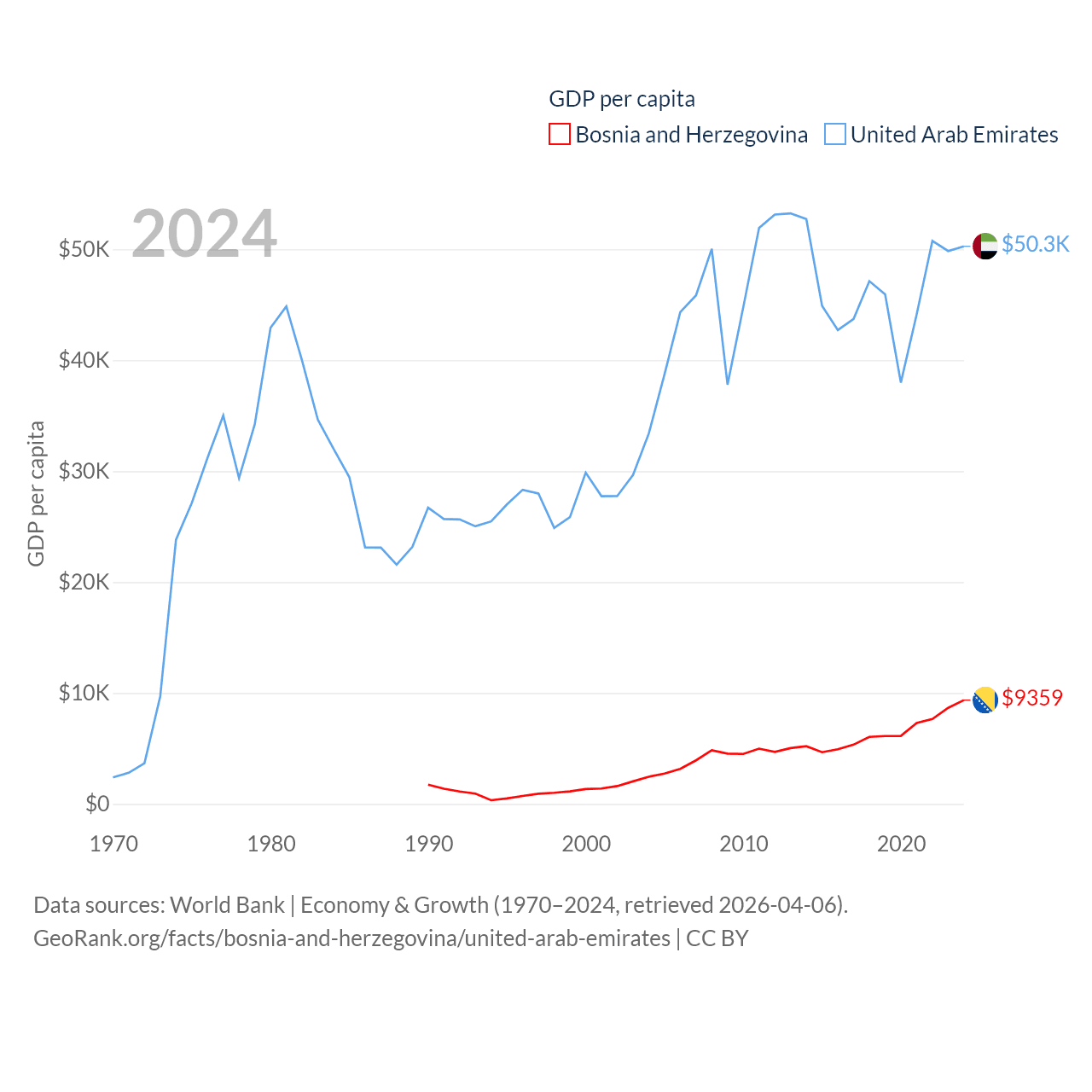 By GDP, Bosnia and Herzegovina ranks 111/197 ($29.6B) and The United Arab Emirates ranks 27/197 ($552B). By GDP per capita, Bosnia and Herzegovina ranks 87/197 ($9,359), while The United Arab Emirates ranks 24/197 ($50,274).
