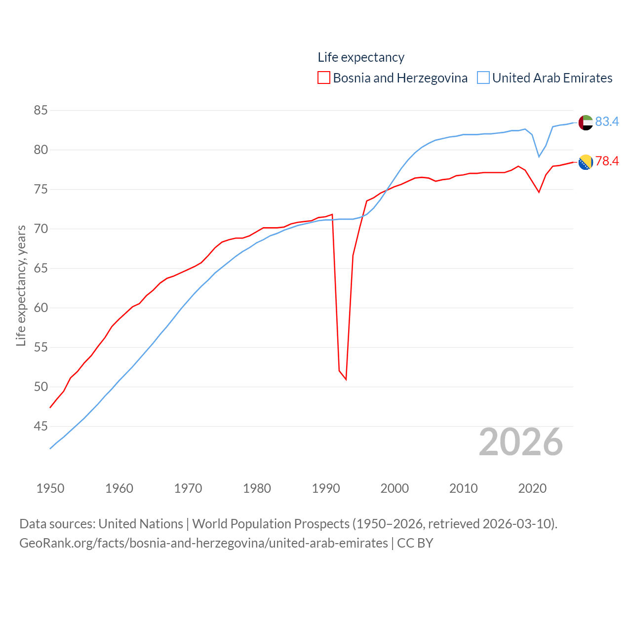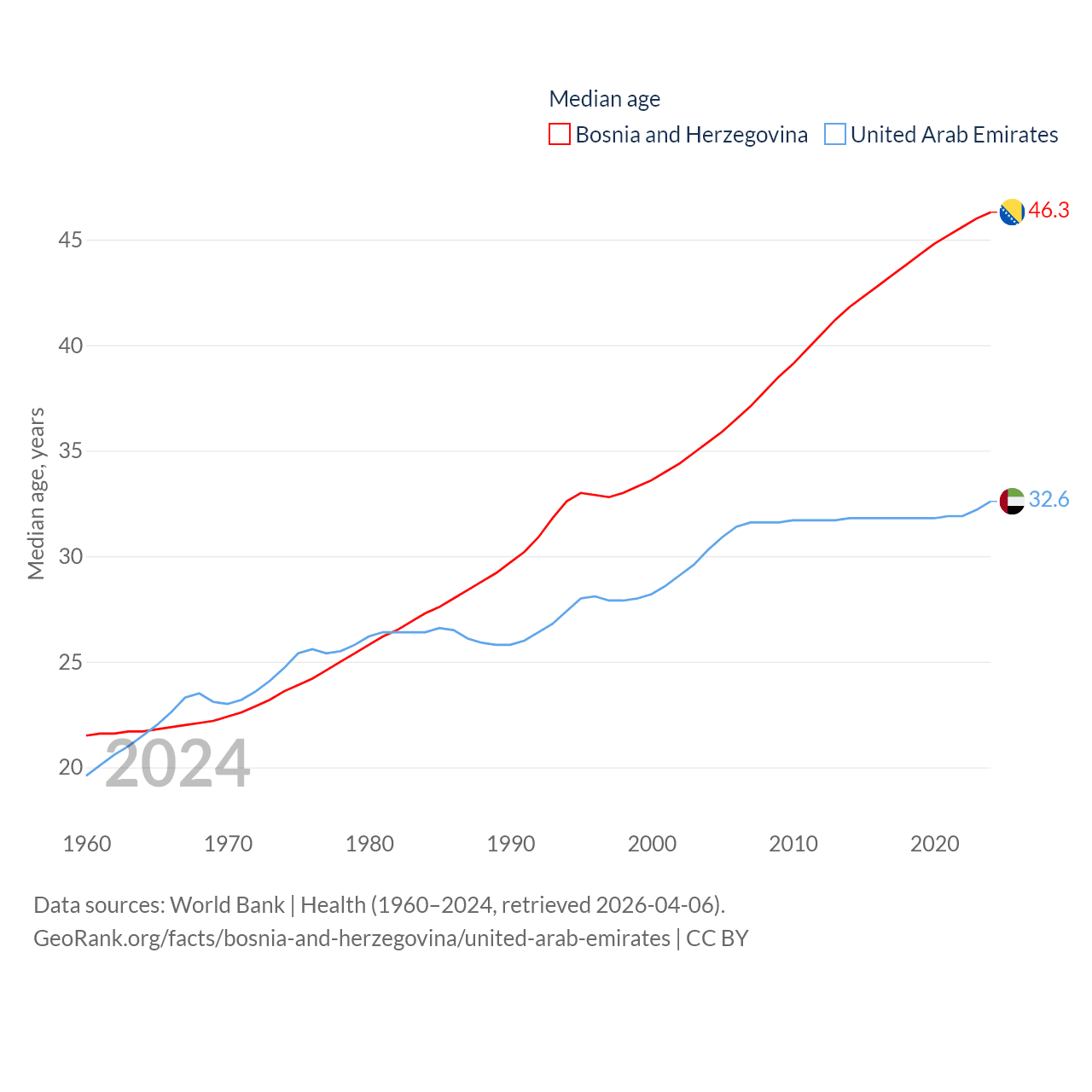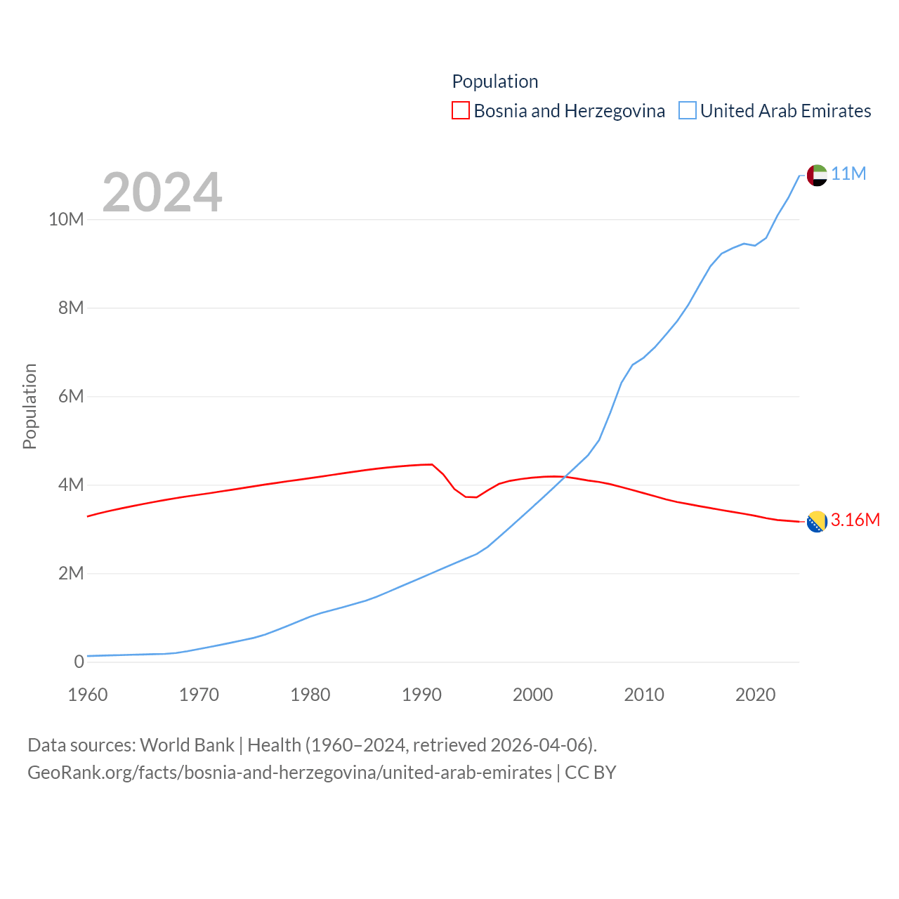 Bosnia and Herzegovina has a population of 3.16M (ranked 134/197), compared with 11M in The United Arab Emirates (ranked 86/197). Bosnia and Herzegovina's land area is 19,768 sq mi versus 27,421 sq mi for The United Arab Emirates (ranked 125th vs. 117th).