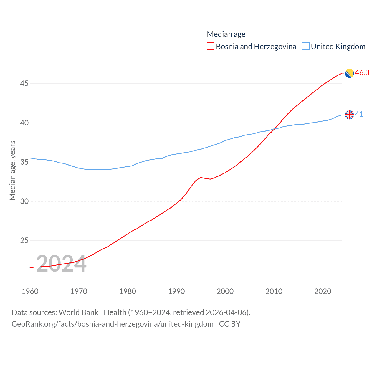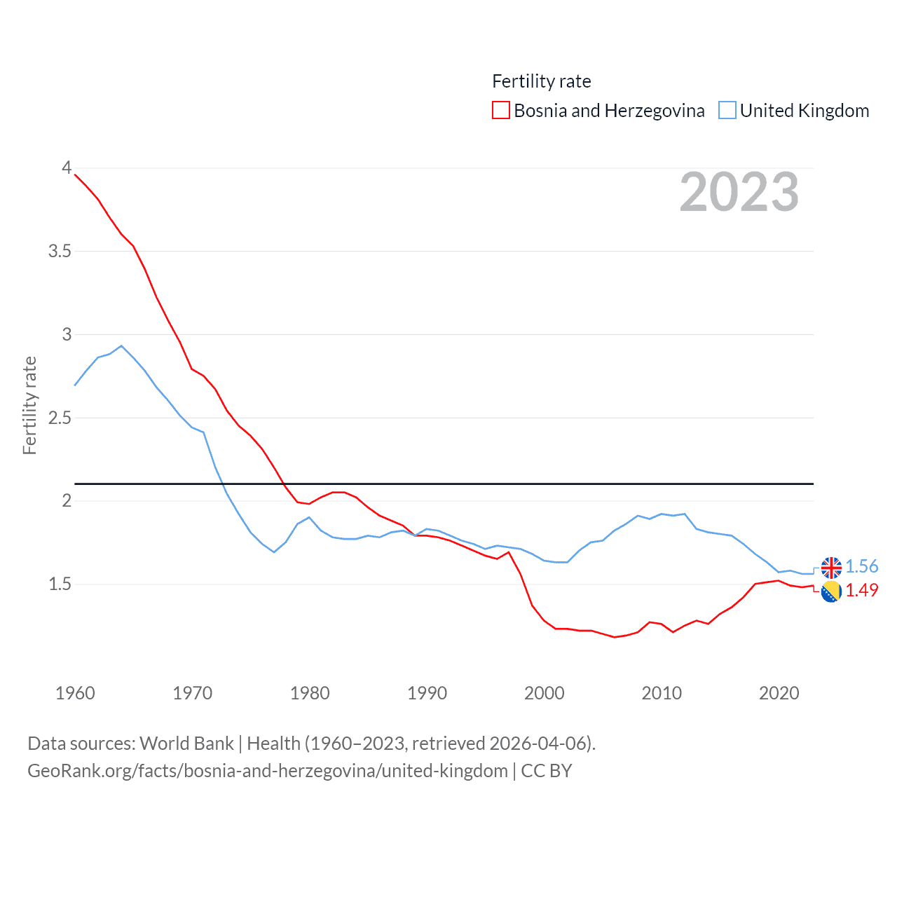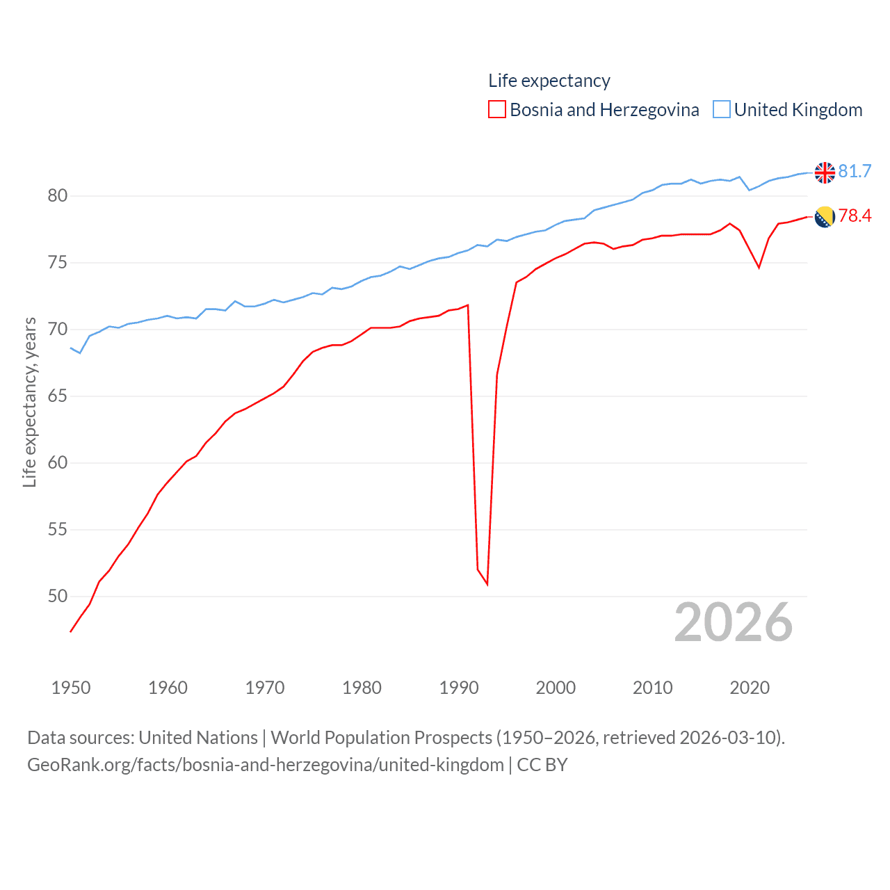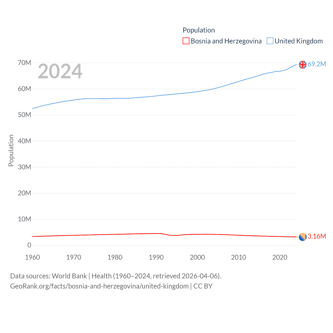 Bosnia and Herzegovina has a population of 3.16M (ranked 134/197), compared with 69.2M in The United Kingdom (ranked 21/197). Bosnia and Herzegovina's land area is 19,768 sq mi versus 93,410 sq mi for The United Kingdom (ranked 125th vs. 78th).
