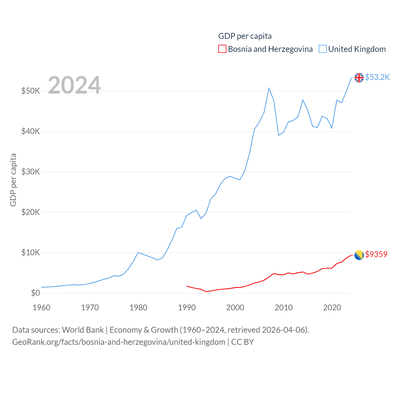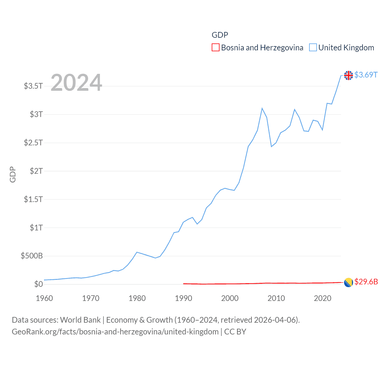 By GDP, Bosnia and Herzegovina ranks 111/197 ($29.6B) and The United Kingdom ranks 6/197 ($3.69T). By GDP per capita, Bosnia and Herzegovina ranks 87/197 ($9,359), while The United Kingdom ranks 22/197 ($53,246).