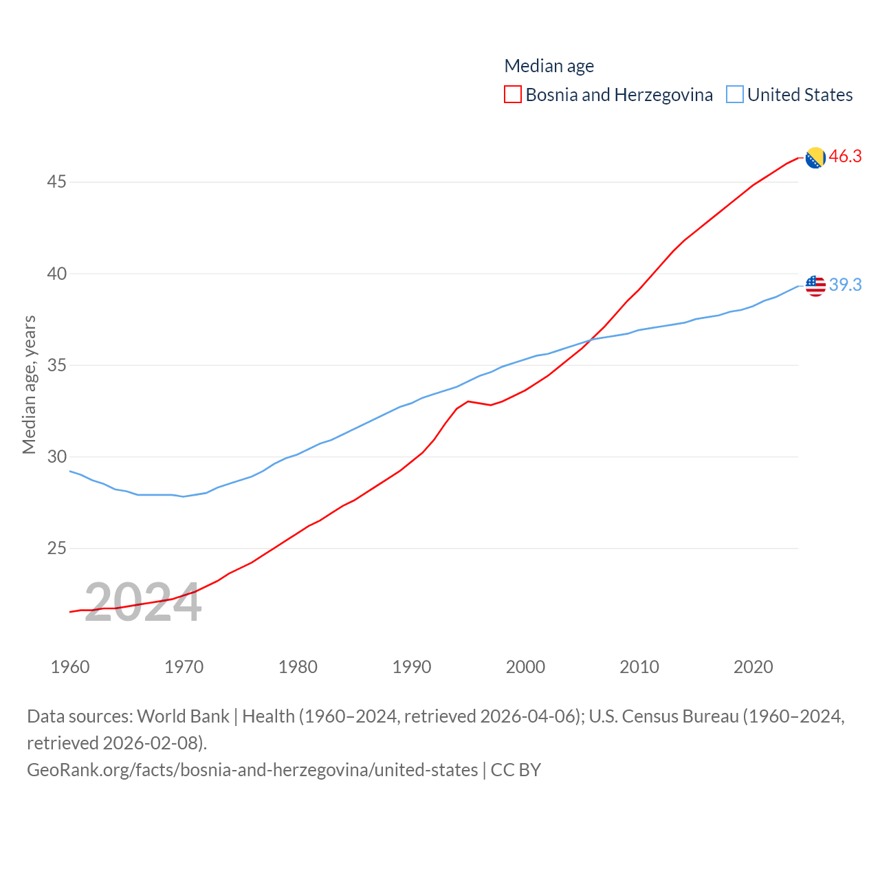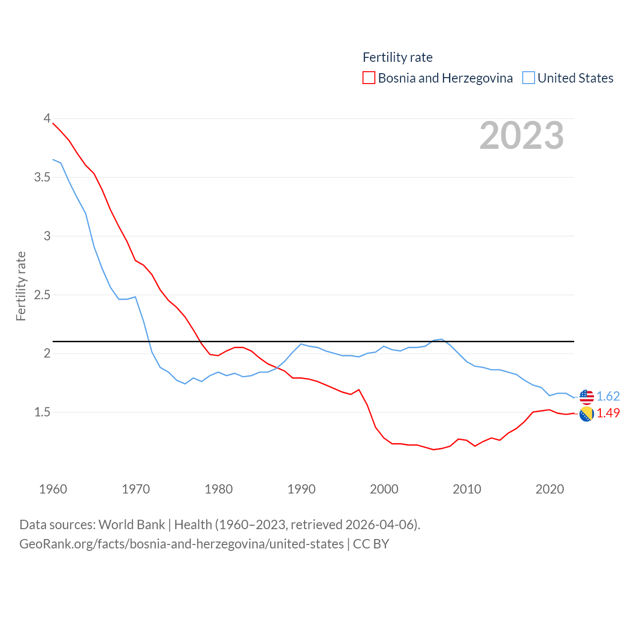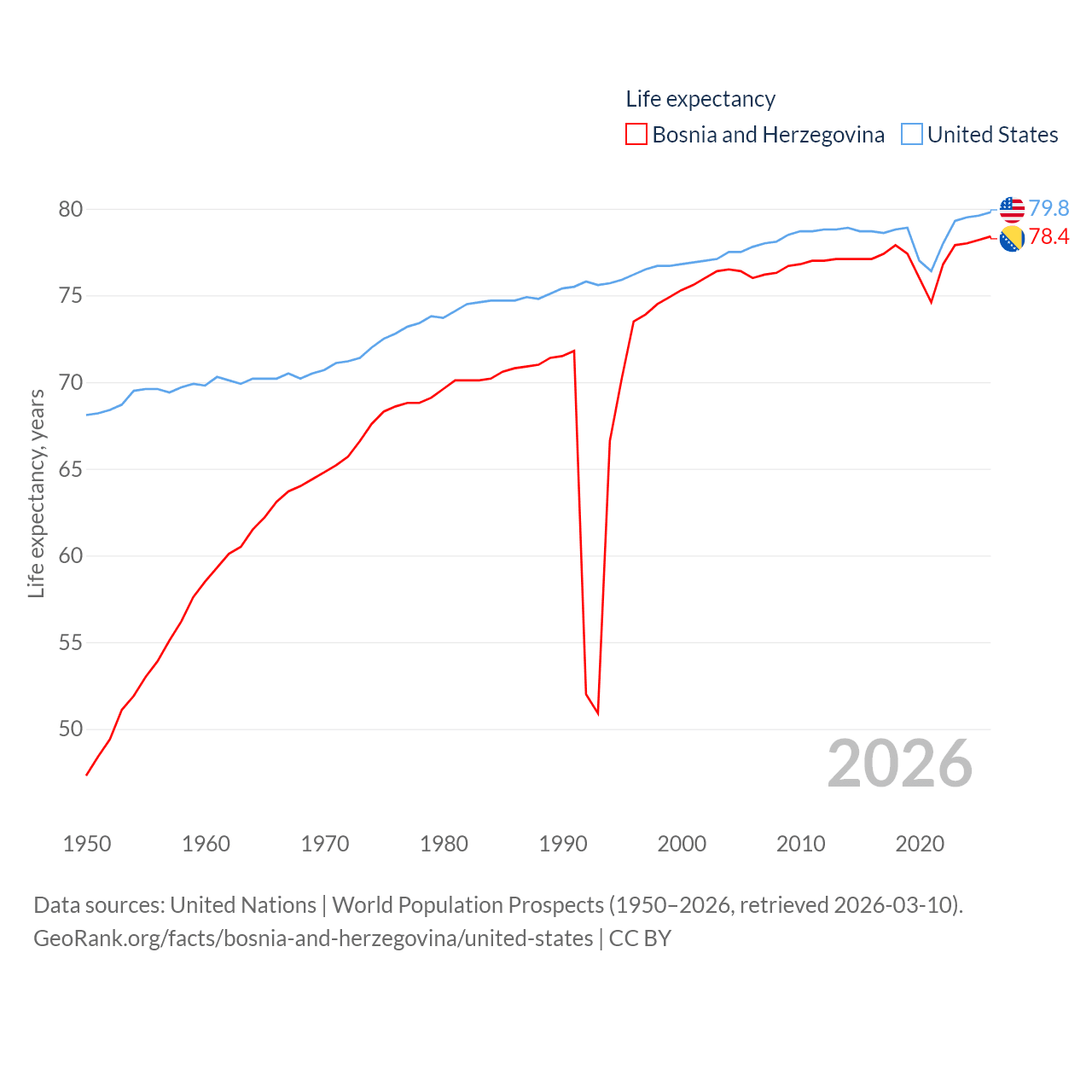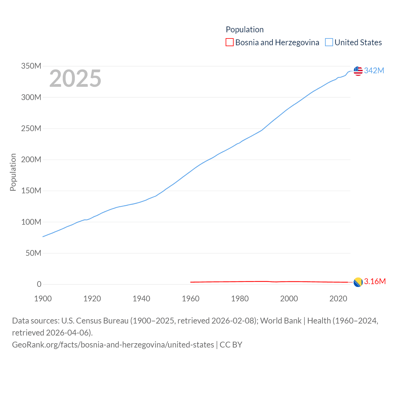 Bosnia and Herzegovina has a population of 3.16M (ranked 134/197), compared with 342M in The United States (ranked 3/197). Bosnia and Herzegovina's land area is 19,768 sq mi versus 3,531,839 sq mi for The United States (ranked 125th vs. 3rd).
