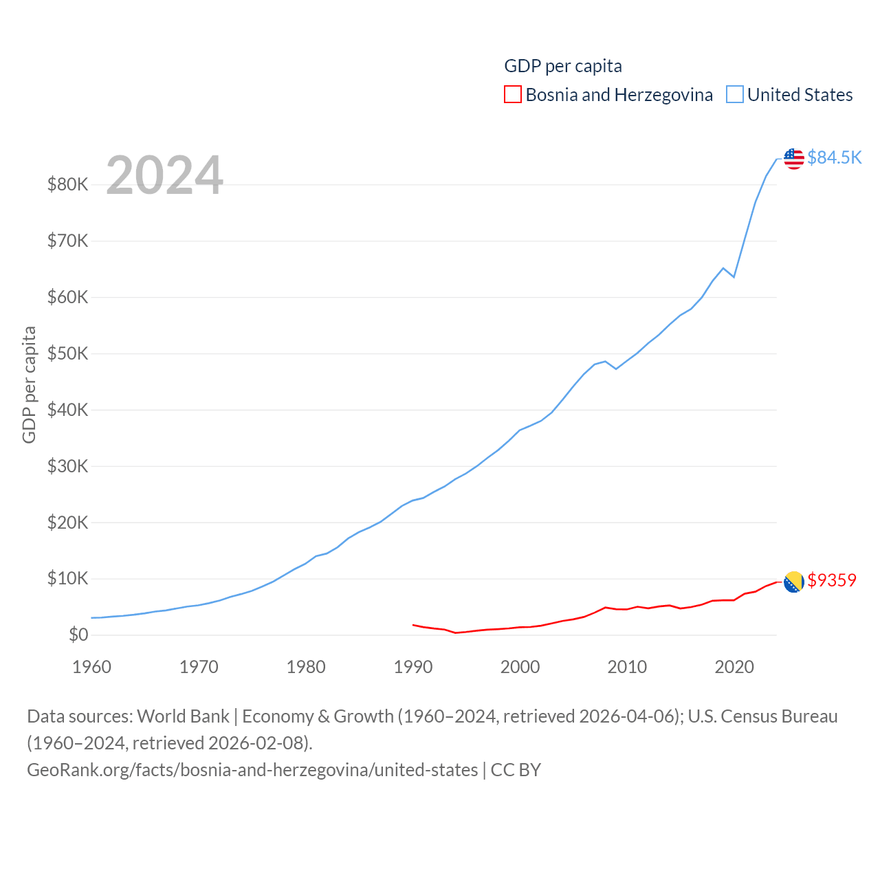 By GDP, Bosnia and Herzegovina ranks 111/197 ($29.6B) and The United States ranks 1/197 ($28.8T). By GDP per capita, Bosnia and Herzegovina ranks 87/197 ($9,359), while The United States ranks 10/197 ($84,534).
