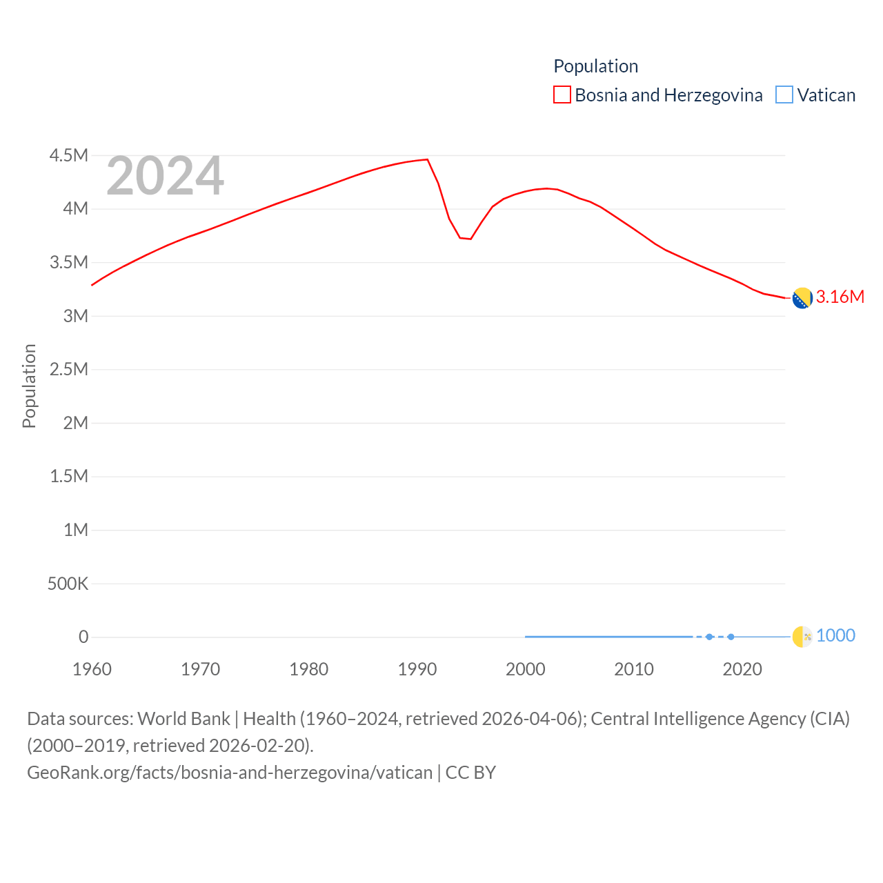 Bosnia and Herzegovina has a population of 3.16M (ranked 134/197), compared with 1K in The Vatican (ranked 197/197). Bosnia and Herzegovina's land area is 19,768 sq mi versus 0.17 sq mi for The Vatican (ranked 125th vs. 197th).