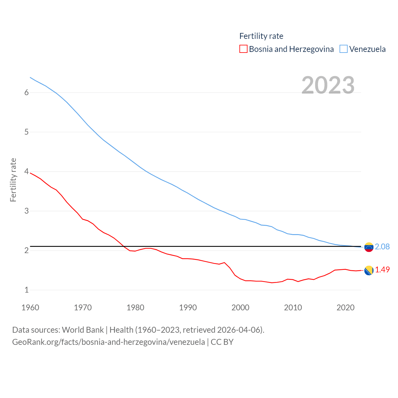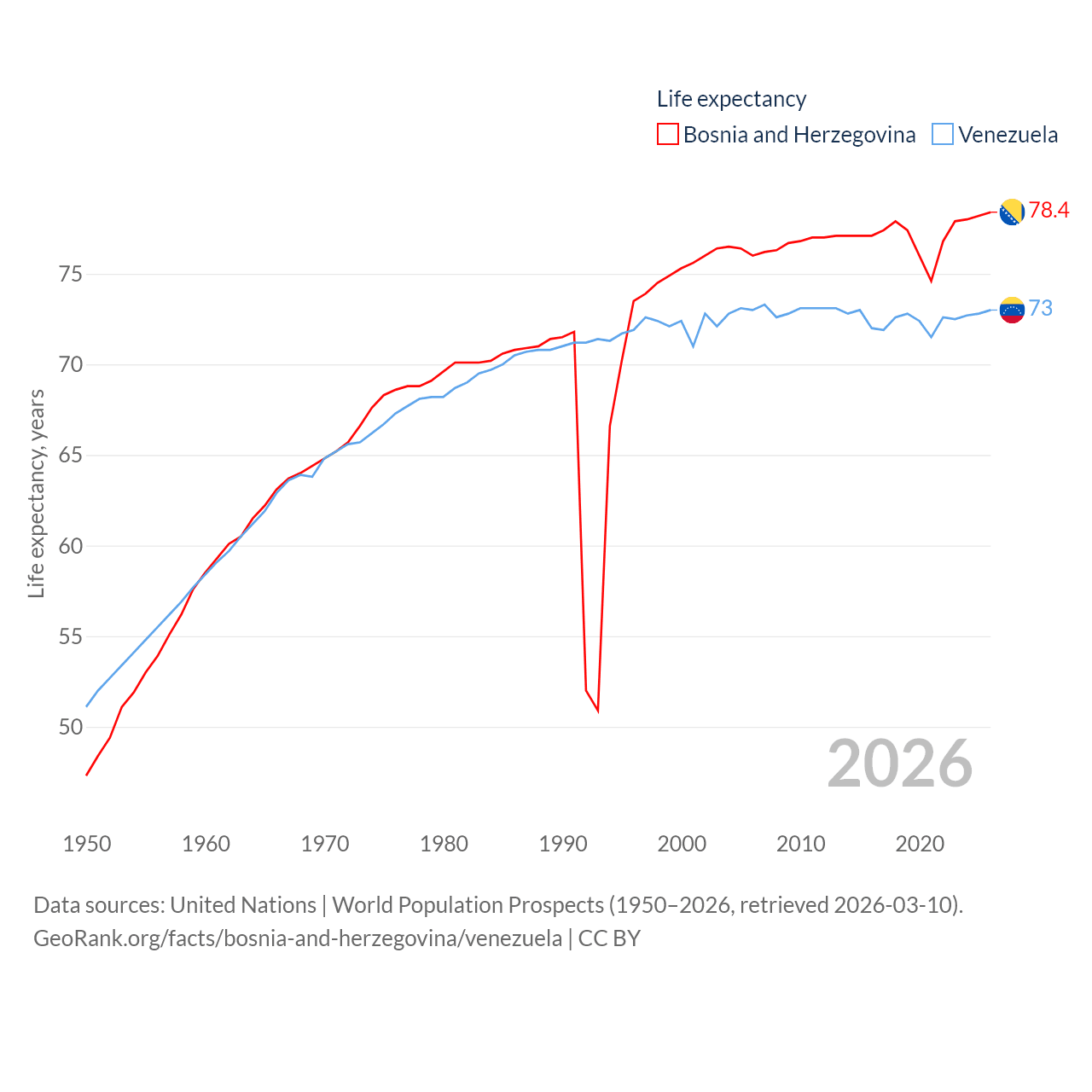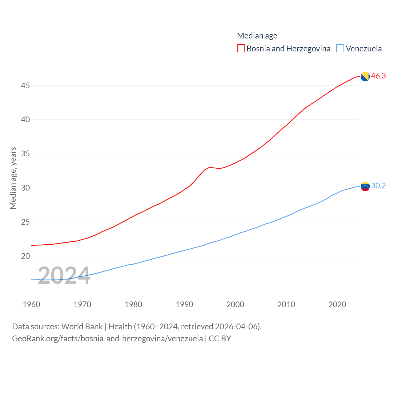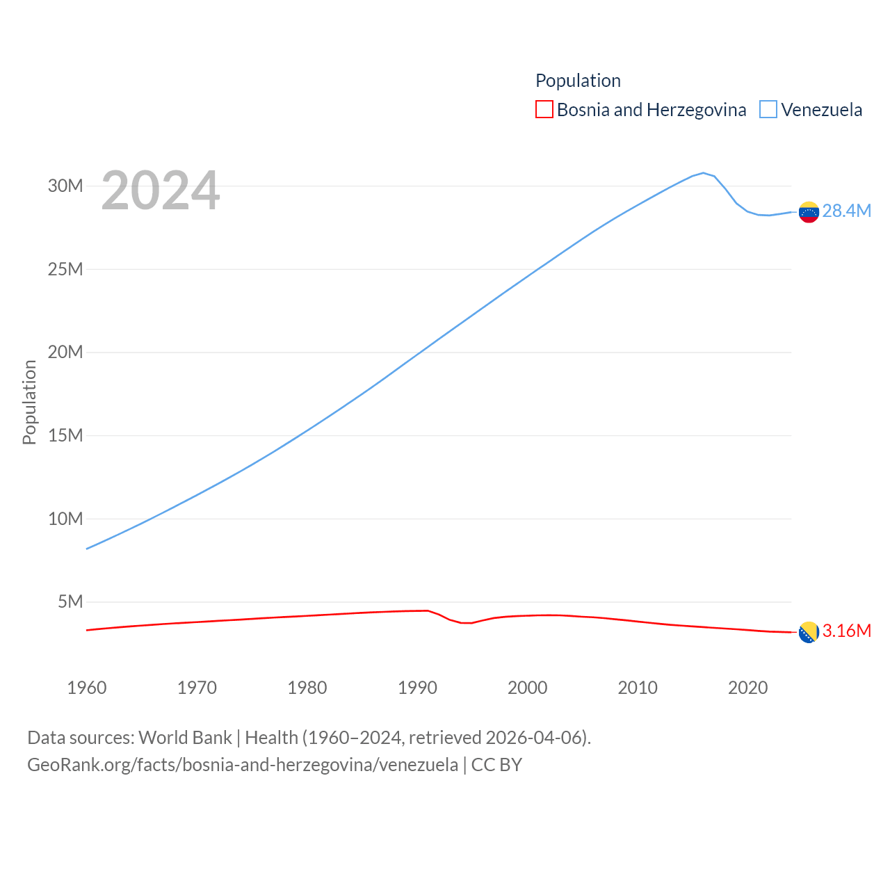 Bosnia and Herzegovina has a population of 3.16M (ranked 134/197), compared with 28.4M in Venezuela (ranked 53/197). Bosnia and Herzegovina's land area is 19,768 sq mi versus 340,561 sq mi for Venezuela (ranked 125th vs. 32nd).