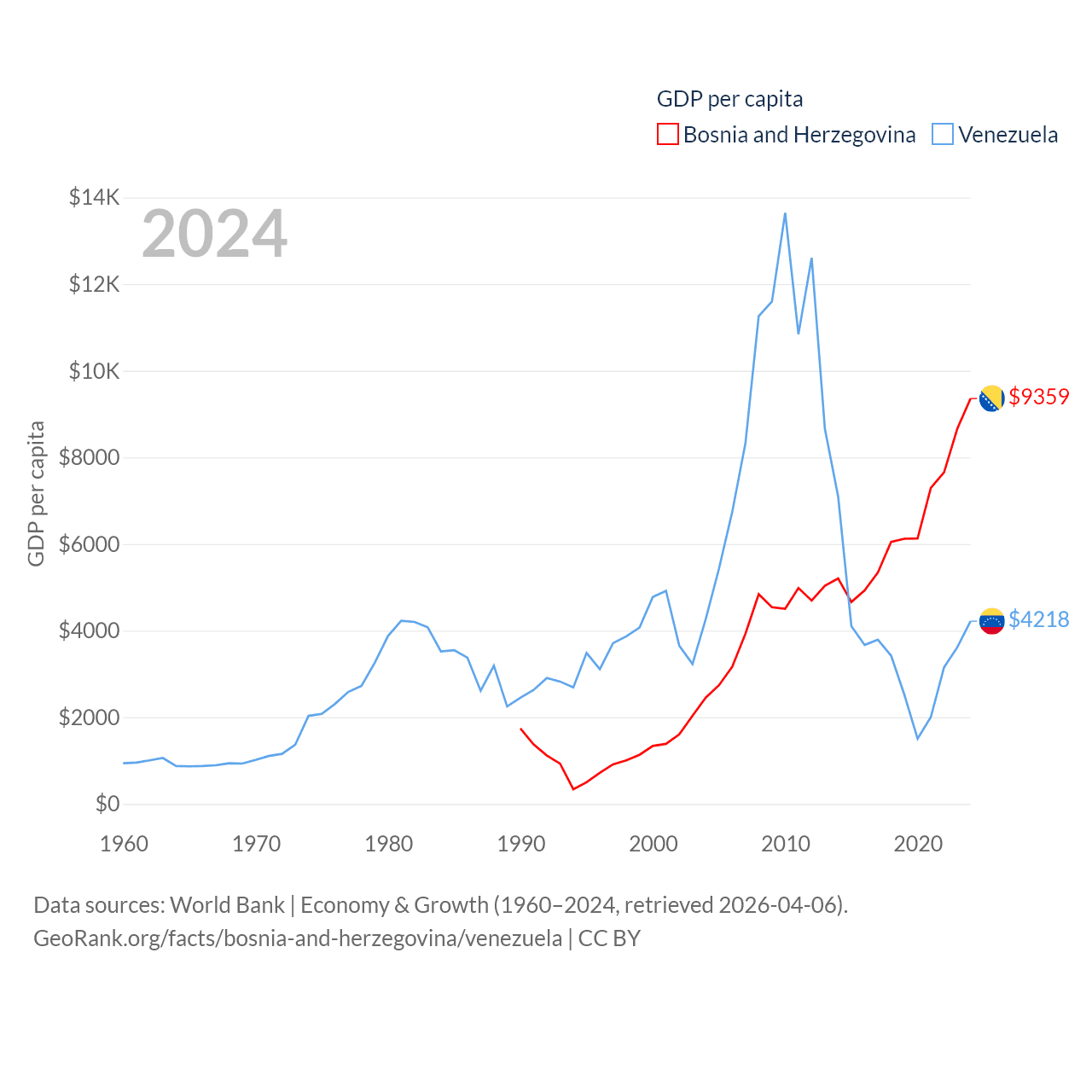 By GDP, Bosnia and Herzegovina ranks 111/197 ($29.6B) and Venezuela ranks 65/197 ($120B). By GDP per capita, Bosnia and Herzegovina ranks 87/197 ($9,359), while Venezuela ranks 128/197 ($4,218).