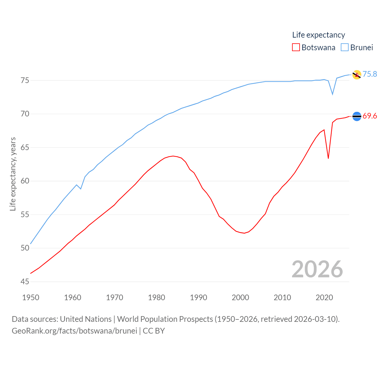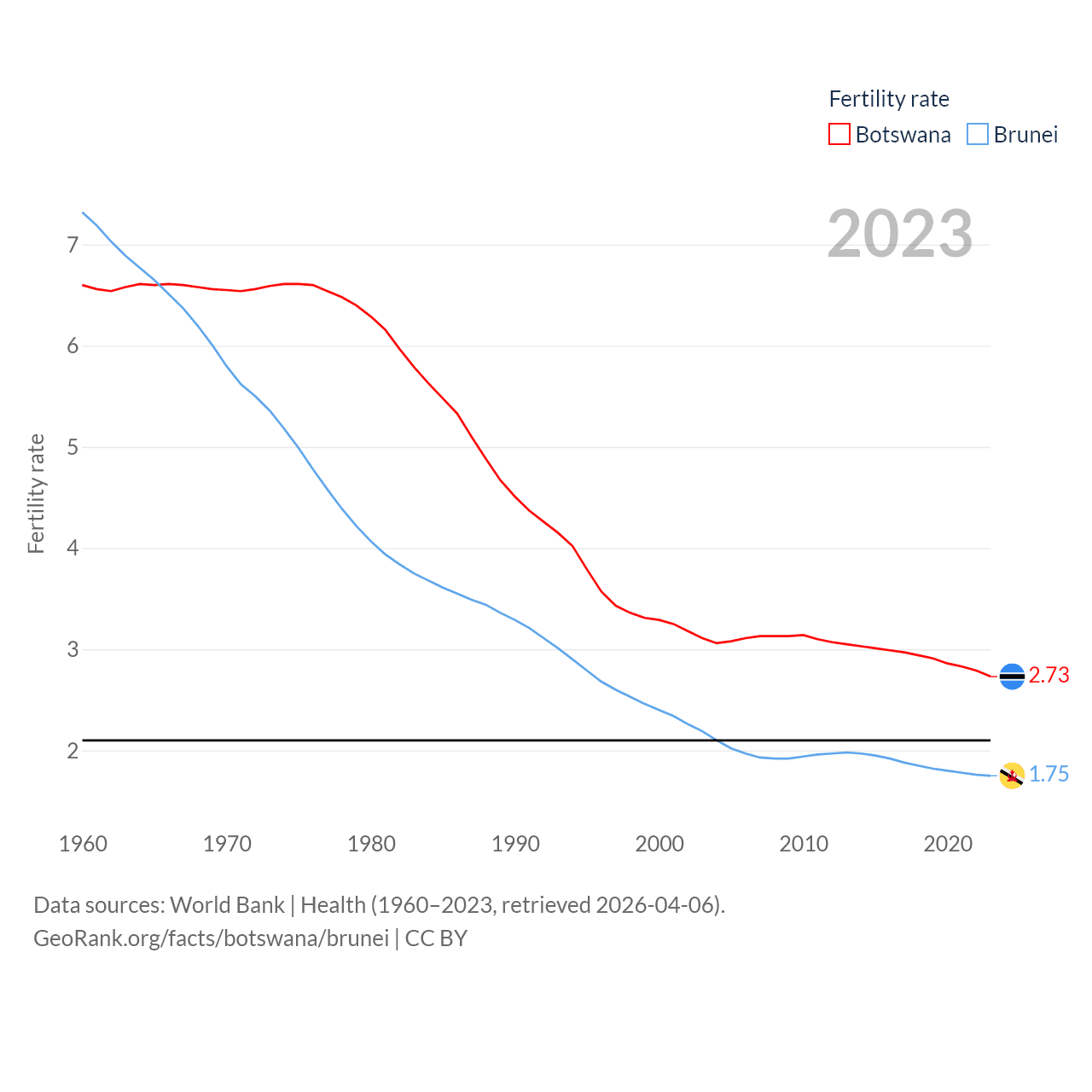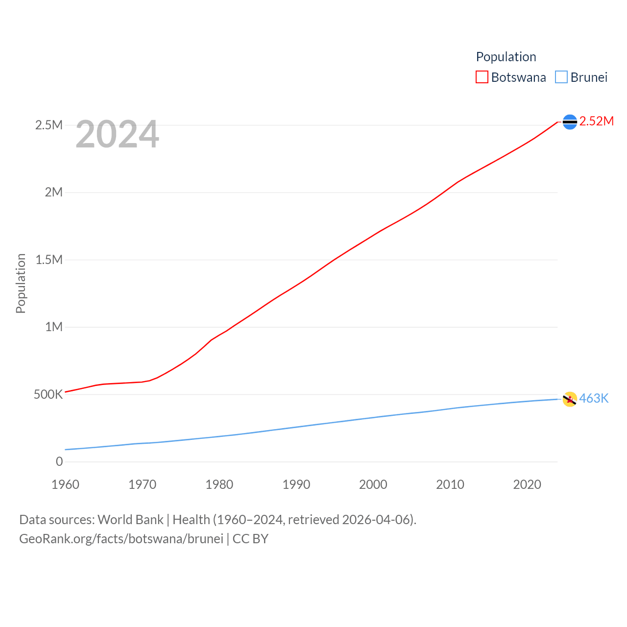 Botswana has a population of 2.52M (ranked 142/197), compared with 463K in Brunei (ranked 170/197). Botswana's land area is 218,816 sq mi versus 2,035 sq mi for Brunei (ranked 47th vs. 165th).