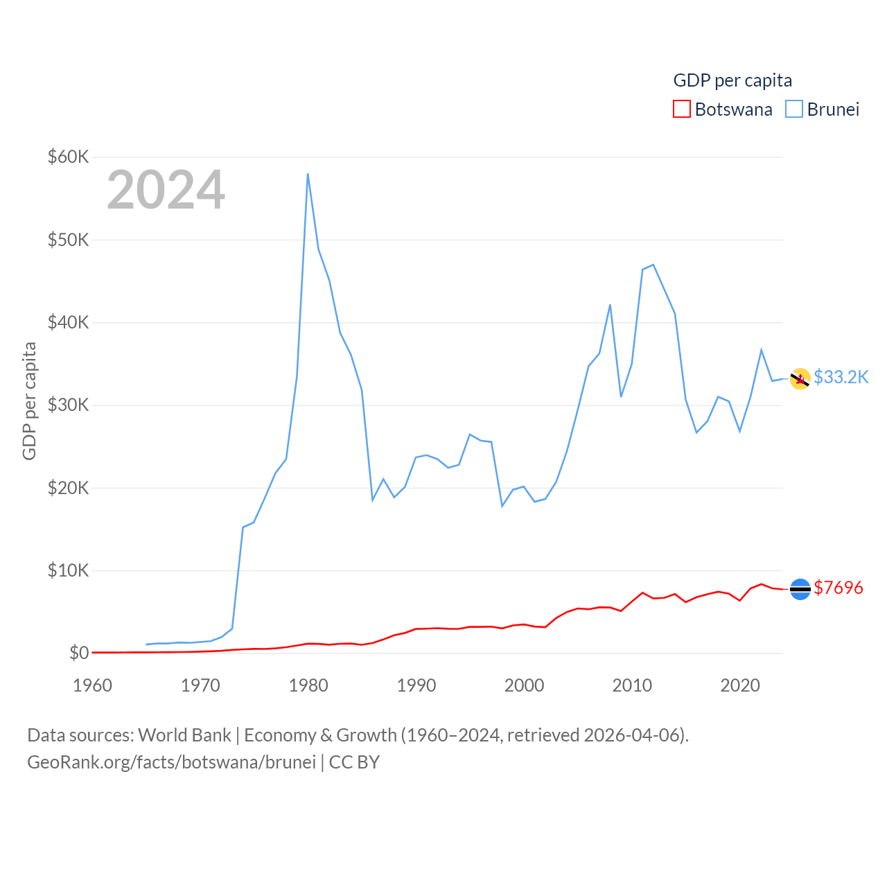 By GDP, Botswana ranks 133/197 ($19.4B) and Brunei ranks 142/197 ($15.3B). By GDP per capita, Botswana ranks 97/197 ($7,696), while Brunei ranks 36/197 ($33,153).