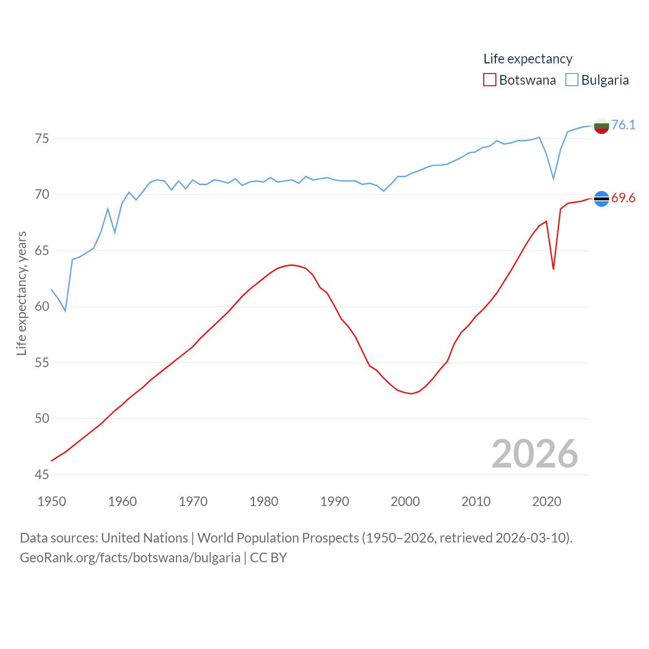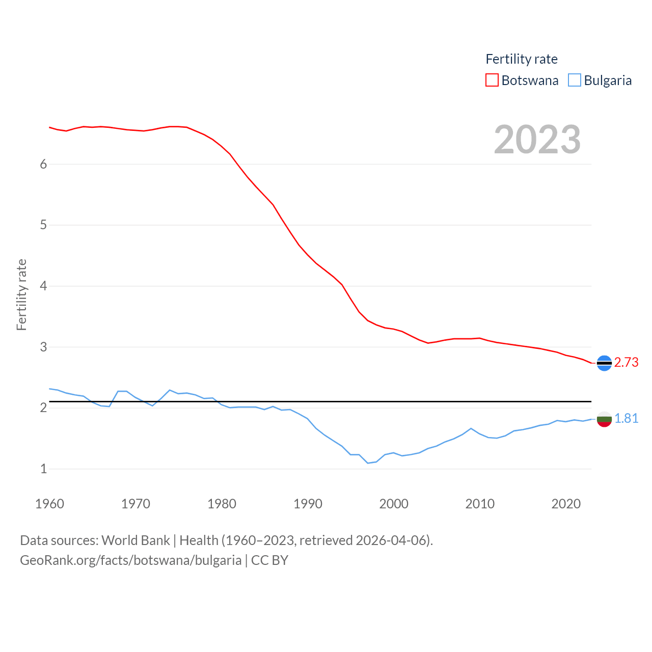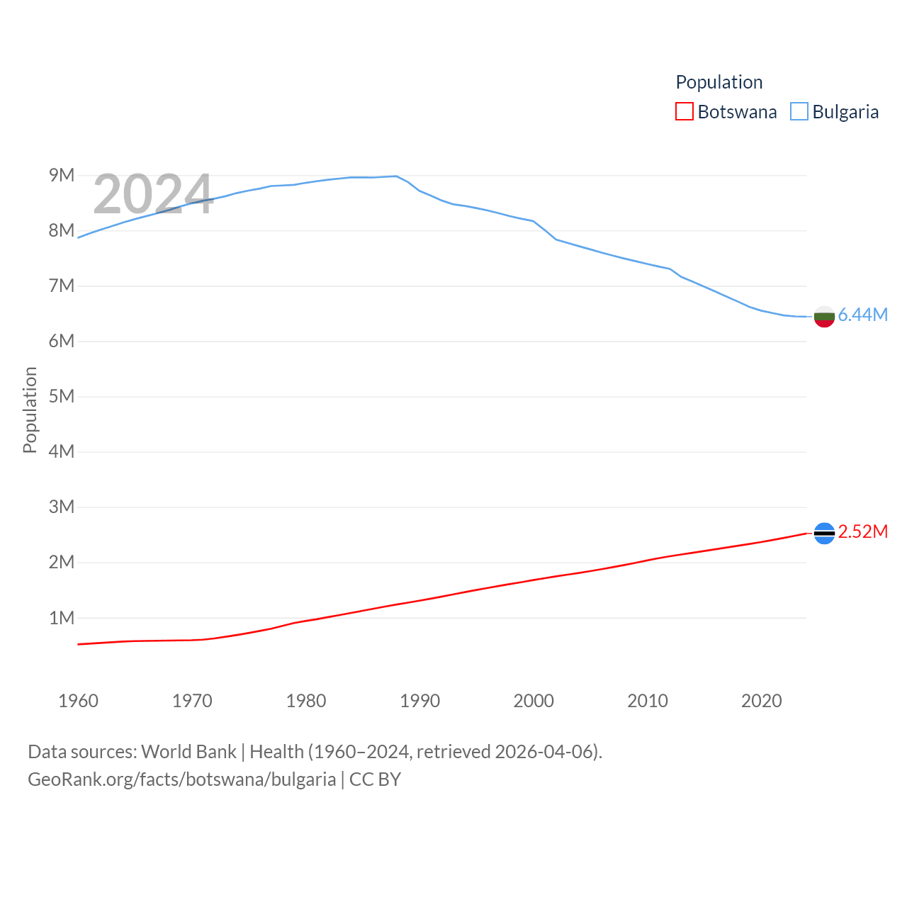 Botswana has a population of 2.52M (ranked 142/197), compared with 6.44M in Bulgaria (ranked 110/197). Botswana's land area is 218,816 sq mi versus 41,915 sq mi for Bulgaria (ranked 47th vs. 101st).