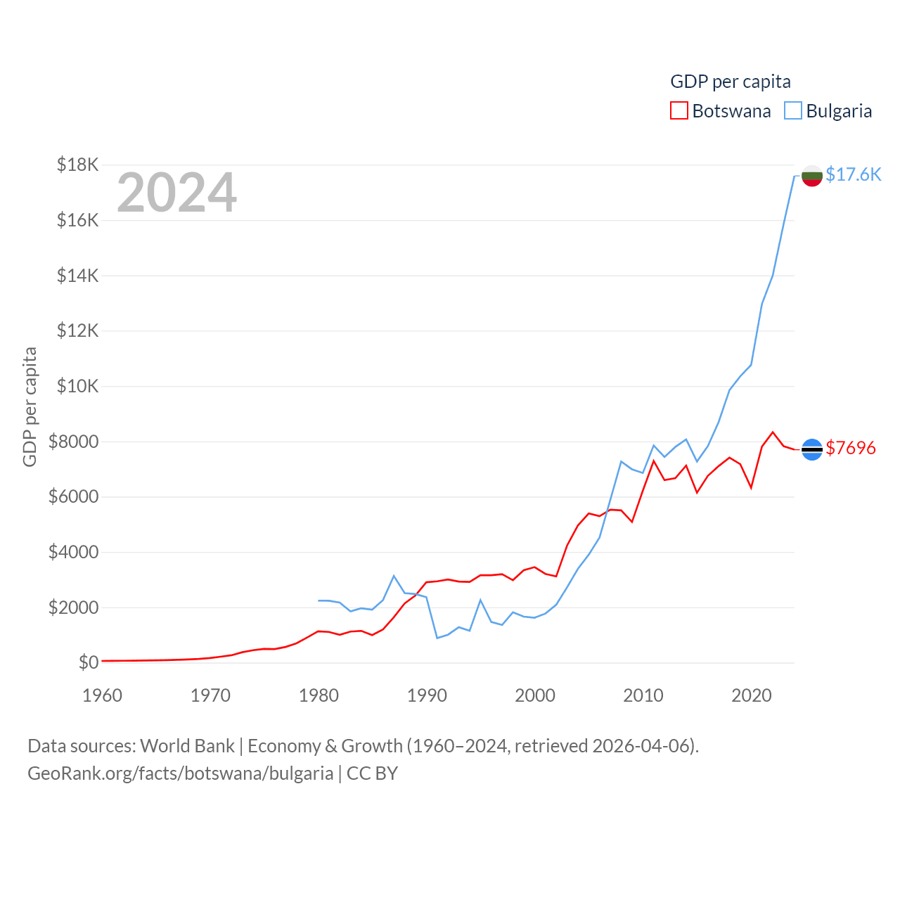 By GDP, Botswana ranks 133/197 ($19.4B) and Bulgaria ranks 67/197 ($113B). By GDP per capita, Botswana ranks 97/197 ($7,696), while Bulgaria ranks 64/197 ($17,596).