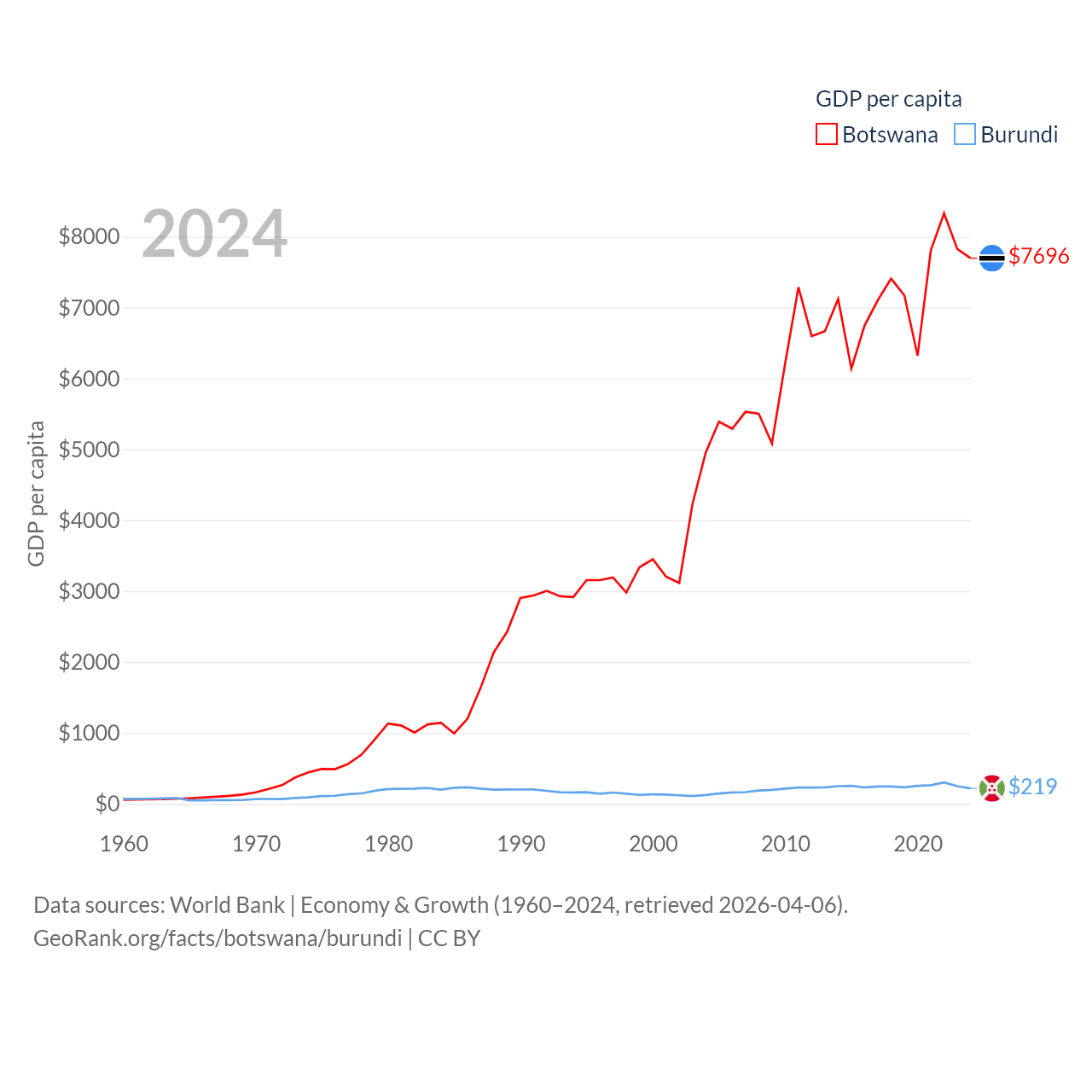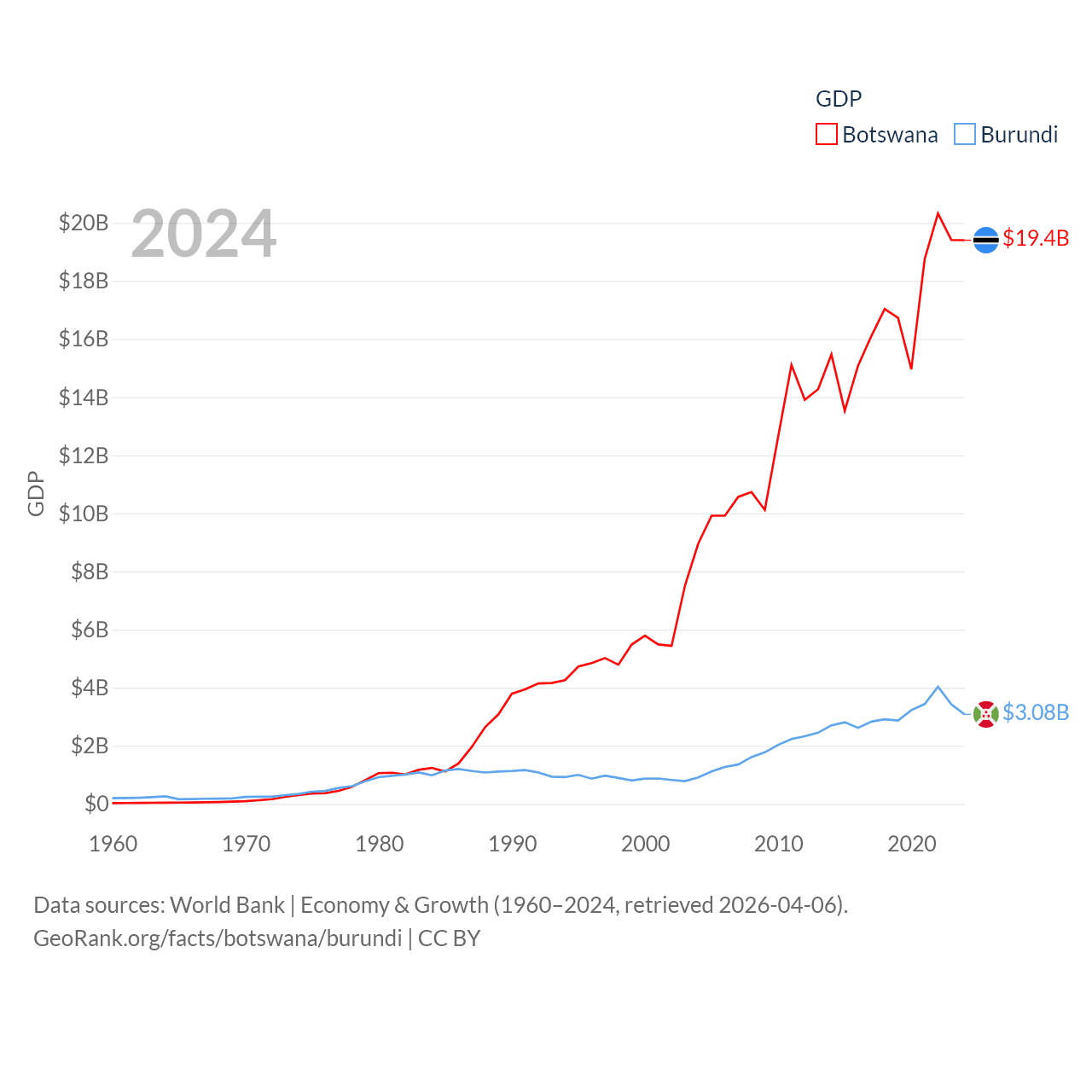By GDP, Botswana ranks 133/197 ($19.4B) and Burundi ranks 169/197 ($3.08B). By GDP per capita, Botswana ranks 97/197 ($7,696), while Burundi ranks 197/197 ($219.4).