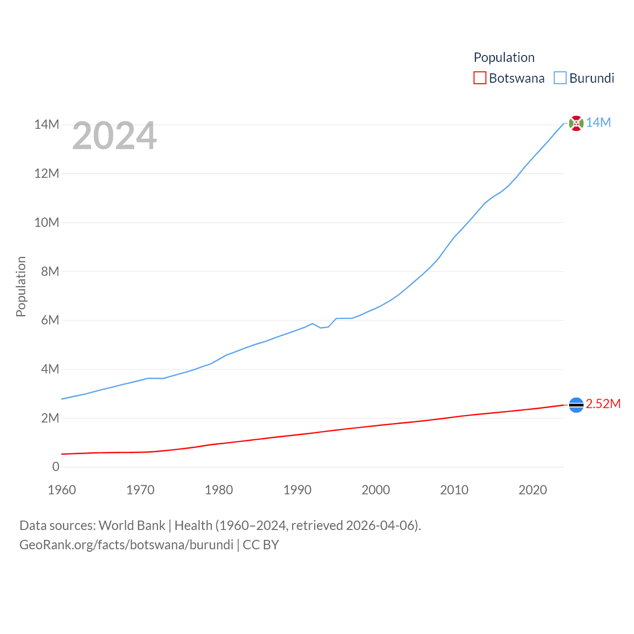Botswana has a population of 2.52M (ranked 142/197), compared with 14M in Burundi (ranked 78/197). Botswana's land area is 218,816 sq mi versus 9,915 sq mi for Burundi (ranked 47th vs. 144th).