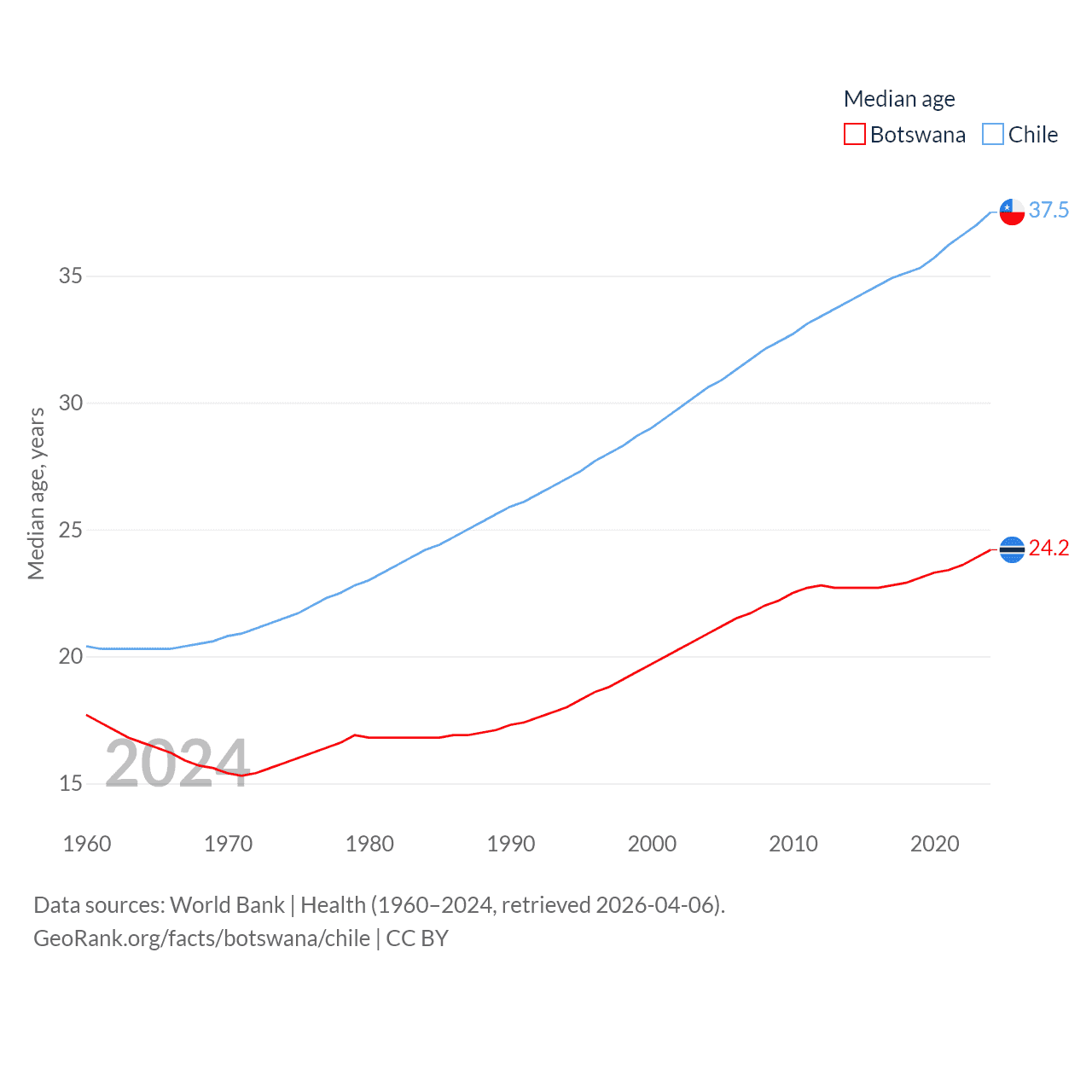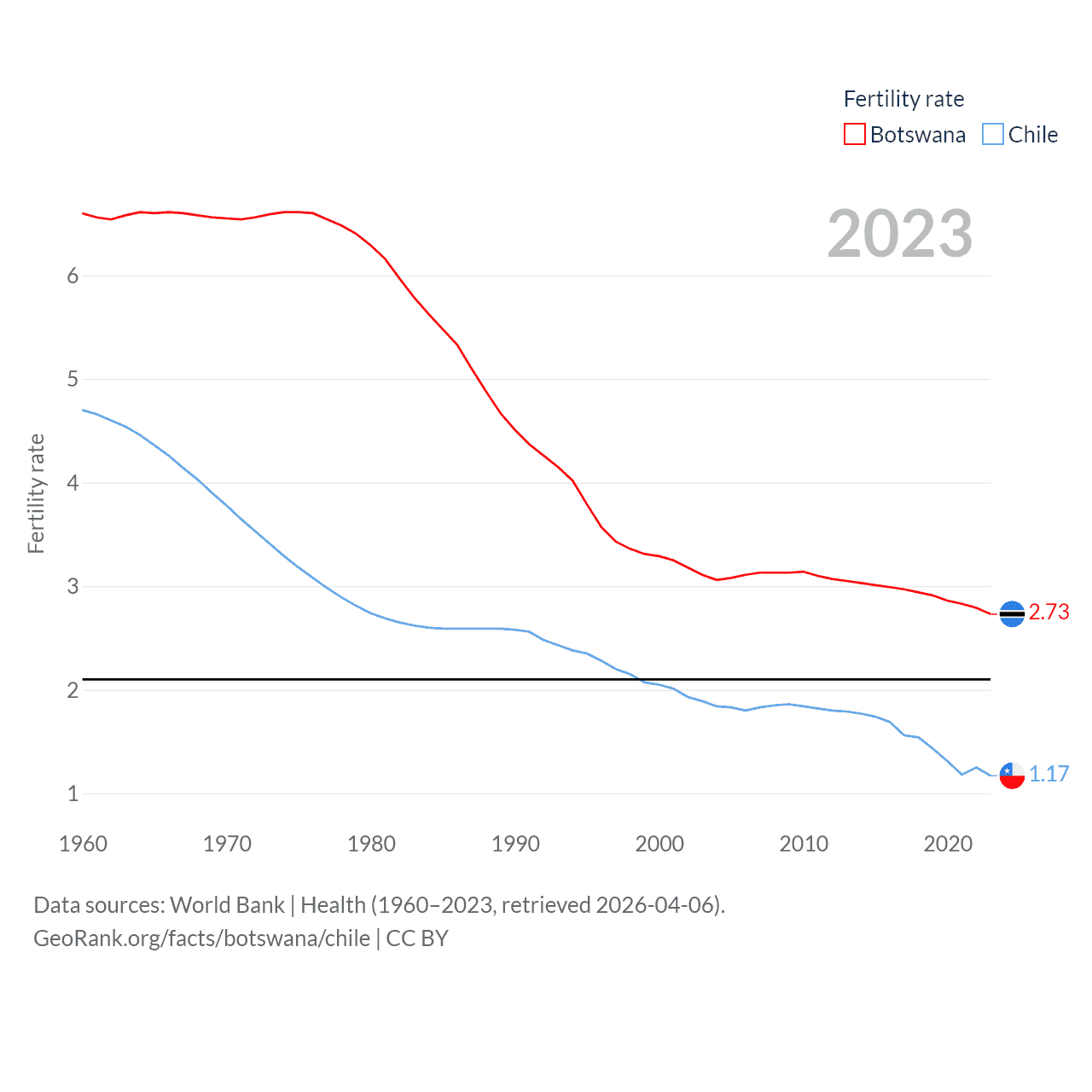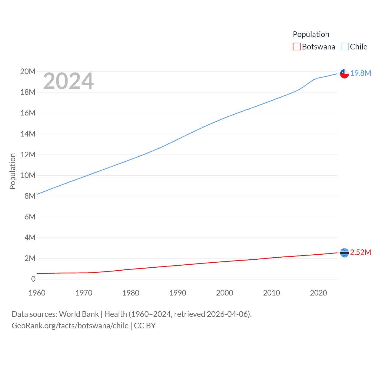 Botswana has a population of 2.52M (ranked 142/197), compared with 19.8M in Chile (ranked 66/197). Botswana's land area is 218,816 sq mi versus 286,809 sq mi for Chile (ranked 47th vs. 38th).