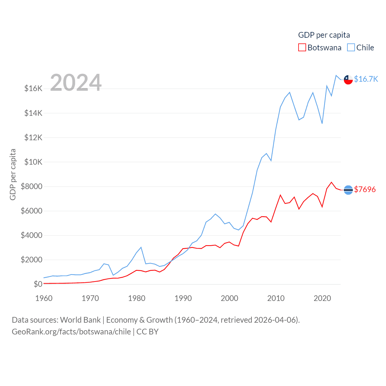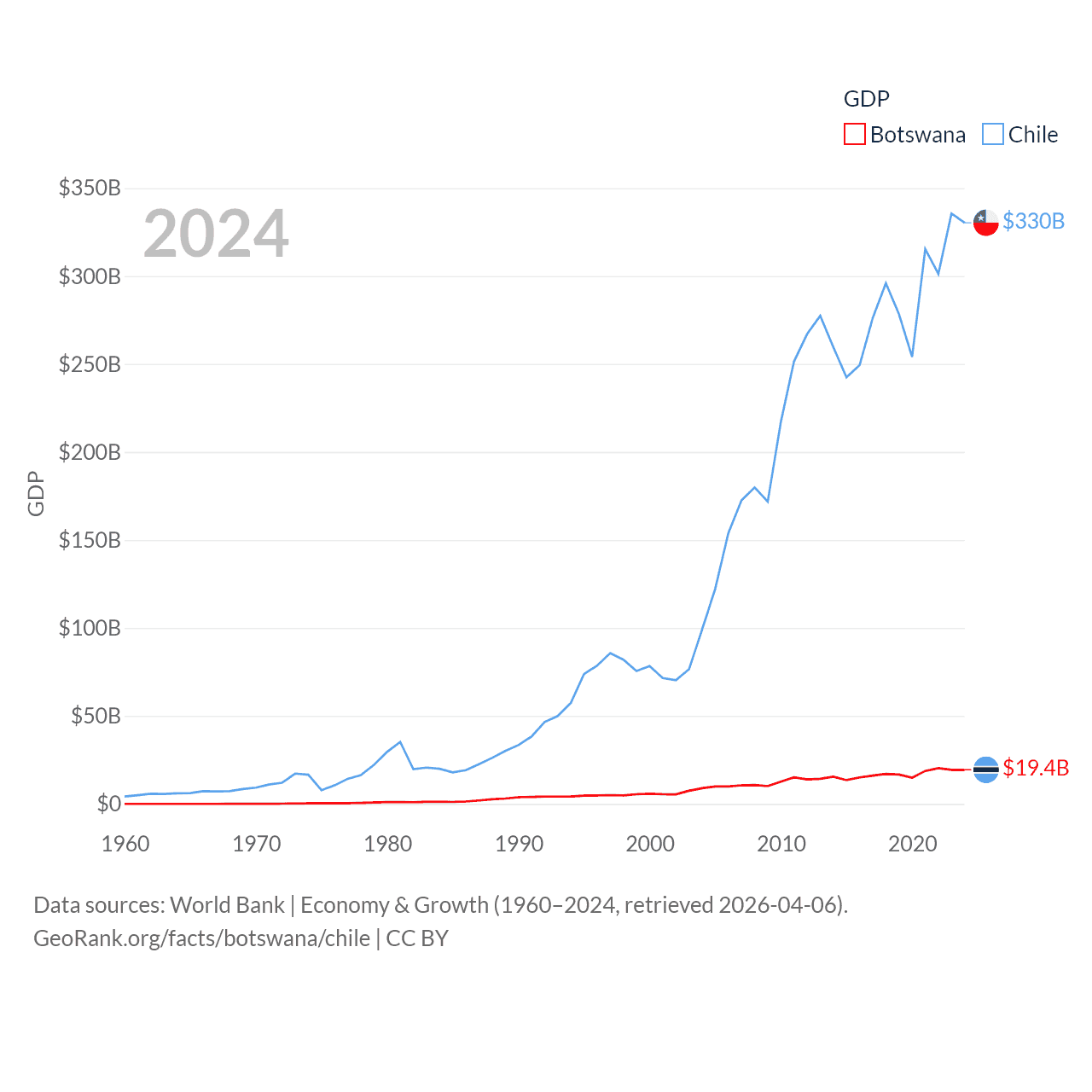 By GDP, Botswana ranks 133/197 ($19.4B) and Chile ranks 45/197 ($330B). By GDP per capita, Botswana ranks 97/197 ($7,696), while Chile ranks 65/197 ($16,710).