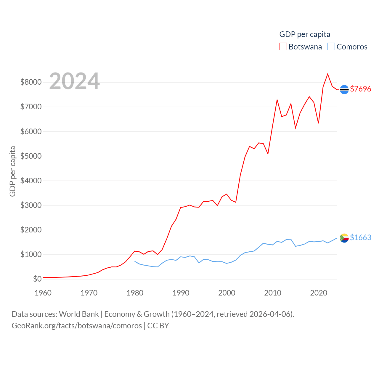 By GDP, Botswana ranks 133/197 ($19.4B) and Comoros ranks 183/197 ($1.44B). By GDP per capita, Botswana ranks 97/197 ($7,696), while Comoros ranks 161/197 ($1,663).