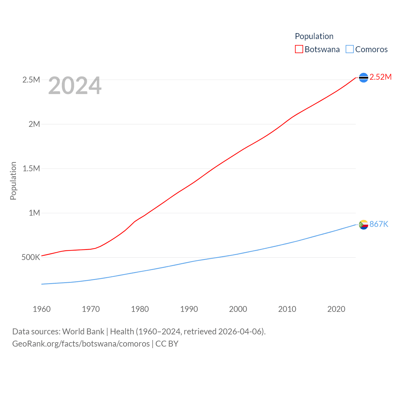 Botswana has a population of 2.52M (ranked 142/197), compared with 867K in Comoros (ranked 160/197). Botswana's land area is 218,816 sq mi versus 719 sq mi for Comoros (ranked 47th vs. 171st).