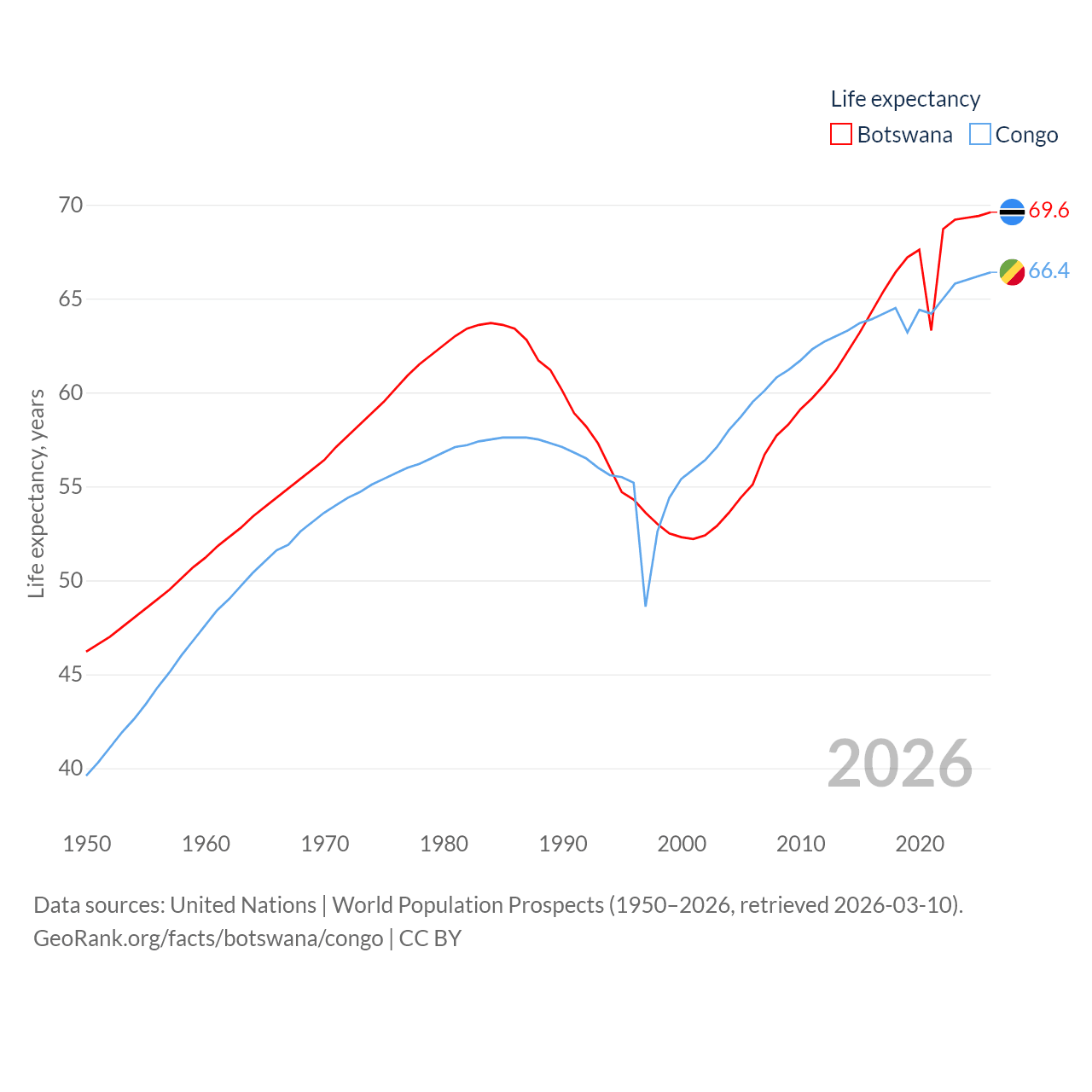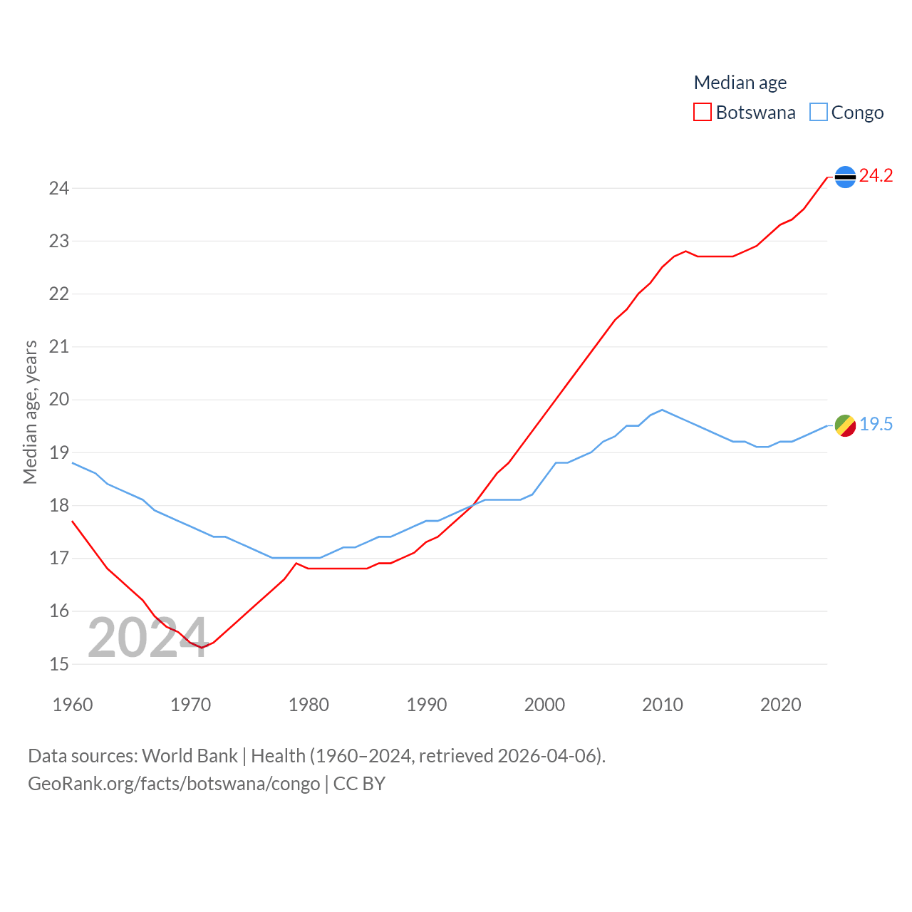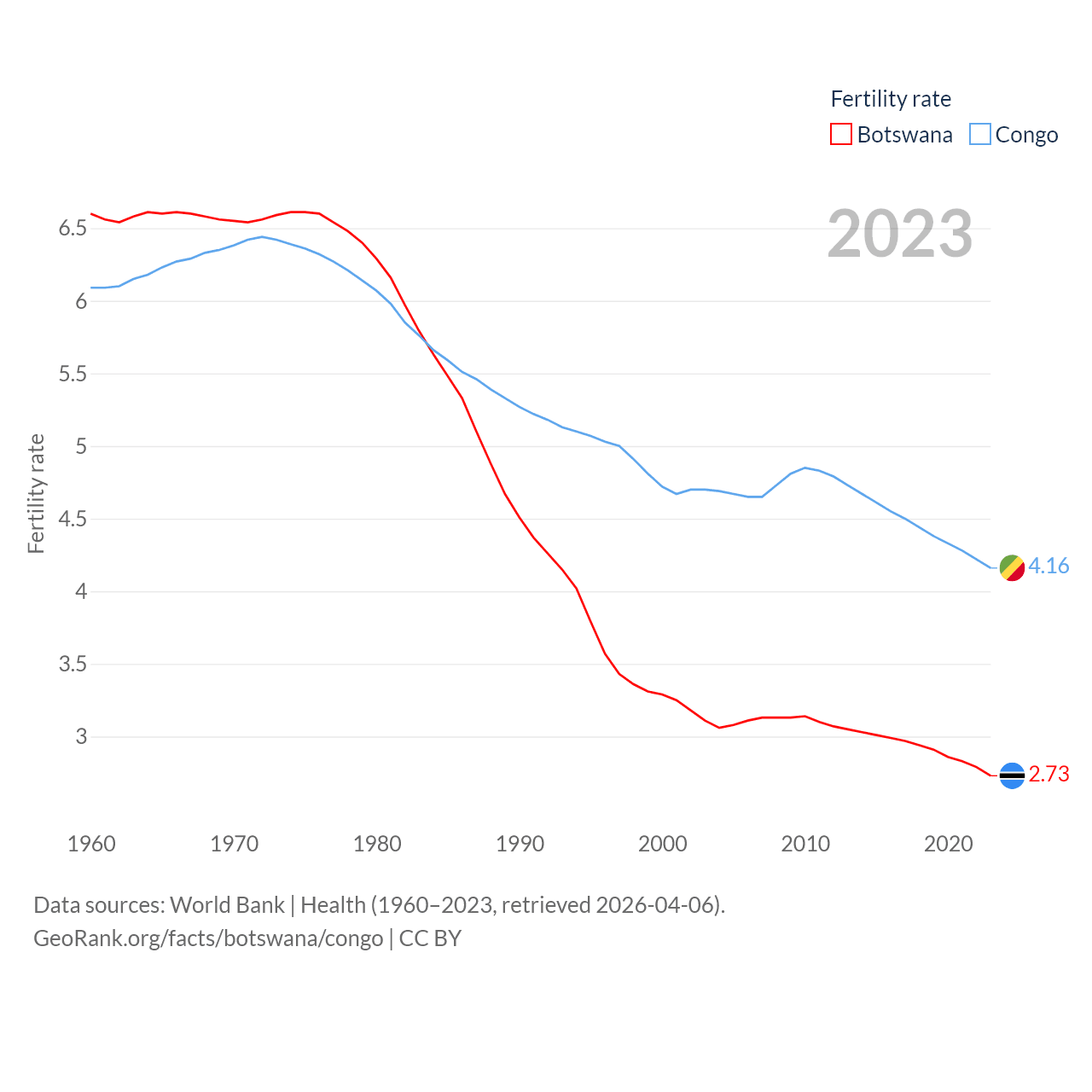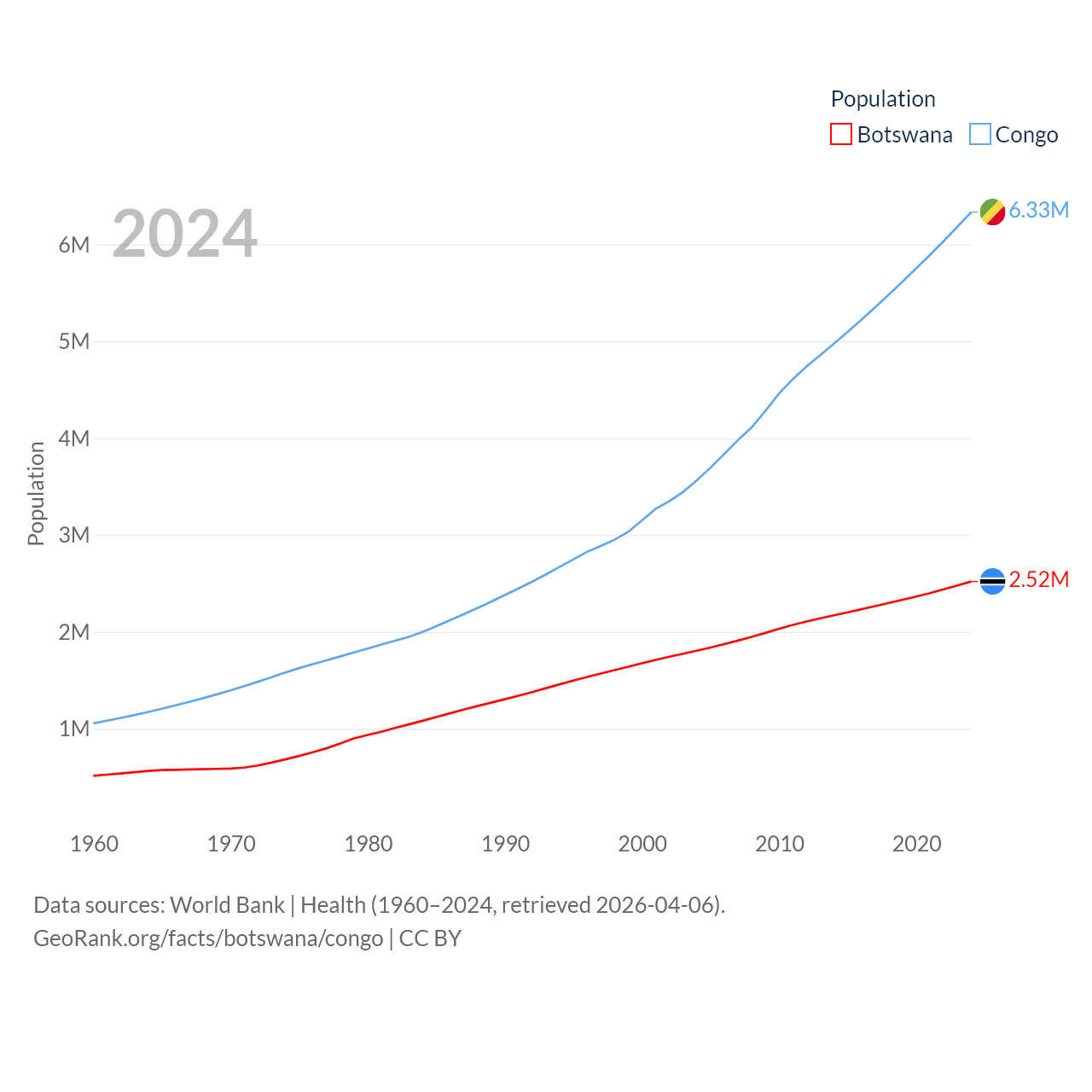 Botswana has a population of 2.52M (ranked 142/197), compared with 6.33M in The Congo (ranked 112/197). Botswana's land area is 218,816 sq mi versus 131,854 sq mi for The Congo (ranked 47th vs. 64th).