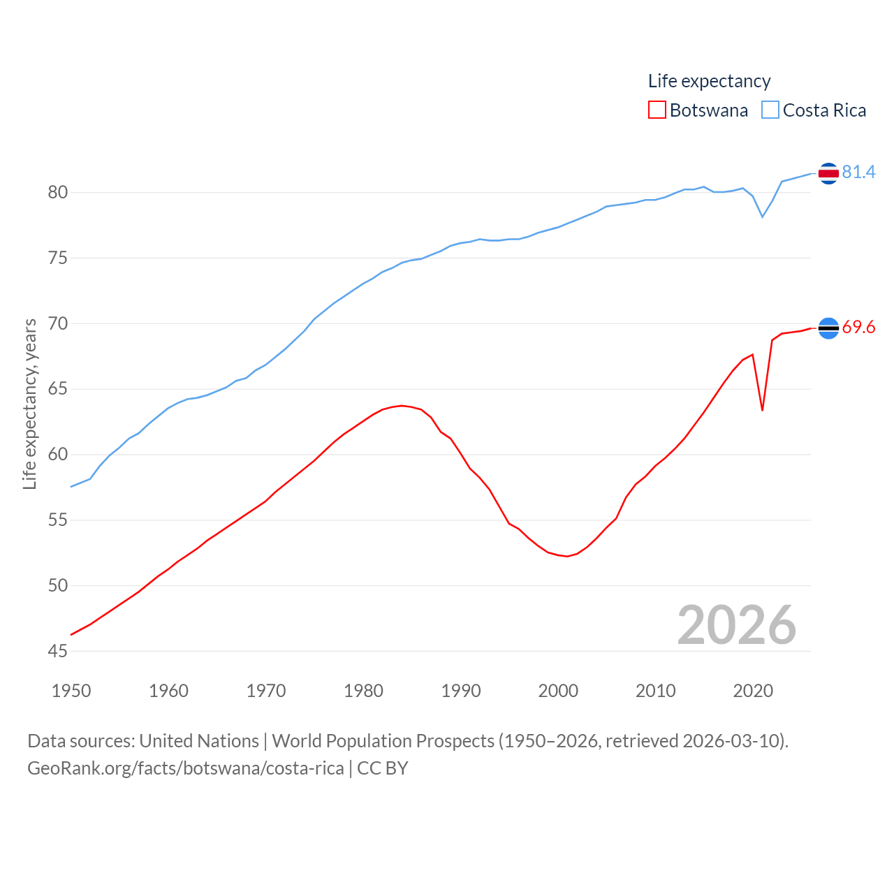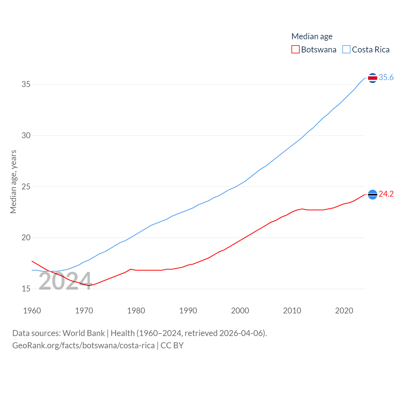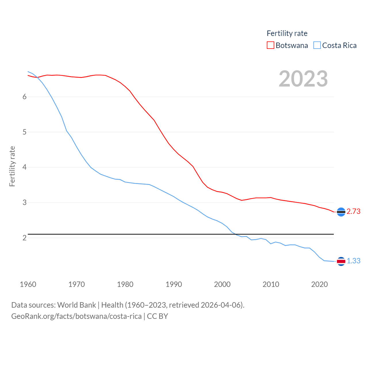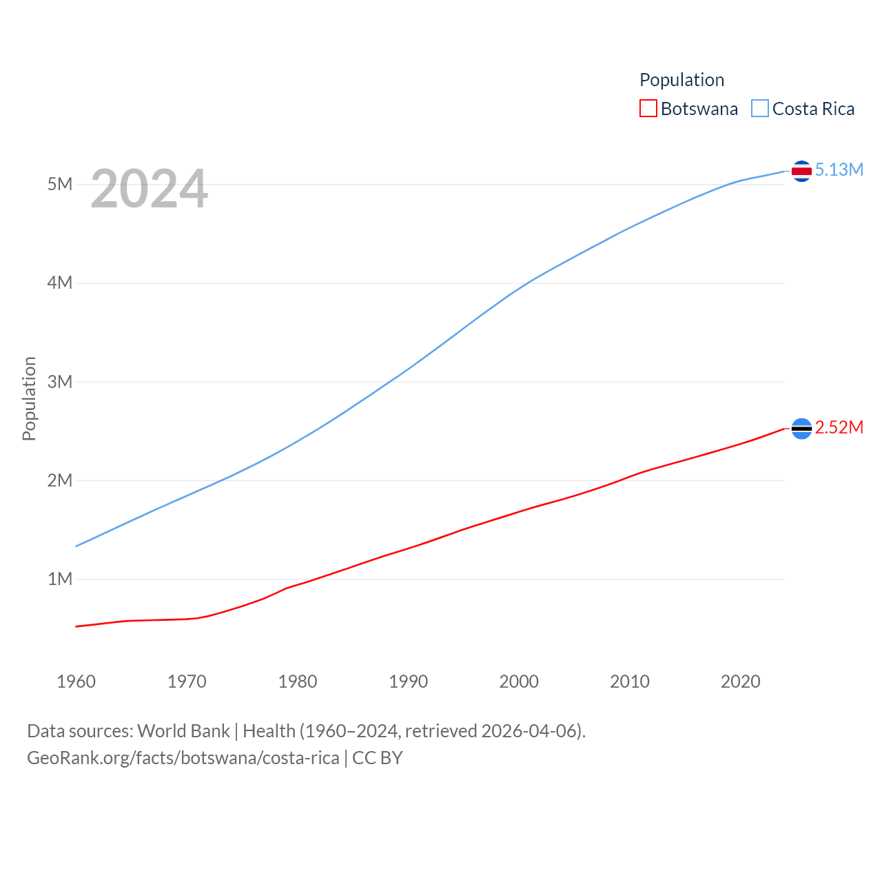 Botswana has a population of 2.52M (ranked 142/197), compared with 5.13M in Costa Rica (ranked 126/197). Botswana's land area is 218,816 sq mi versus 19,714 sq mi for Costa Rica (ranked 47th vs. 126th).