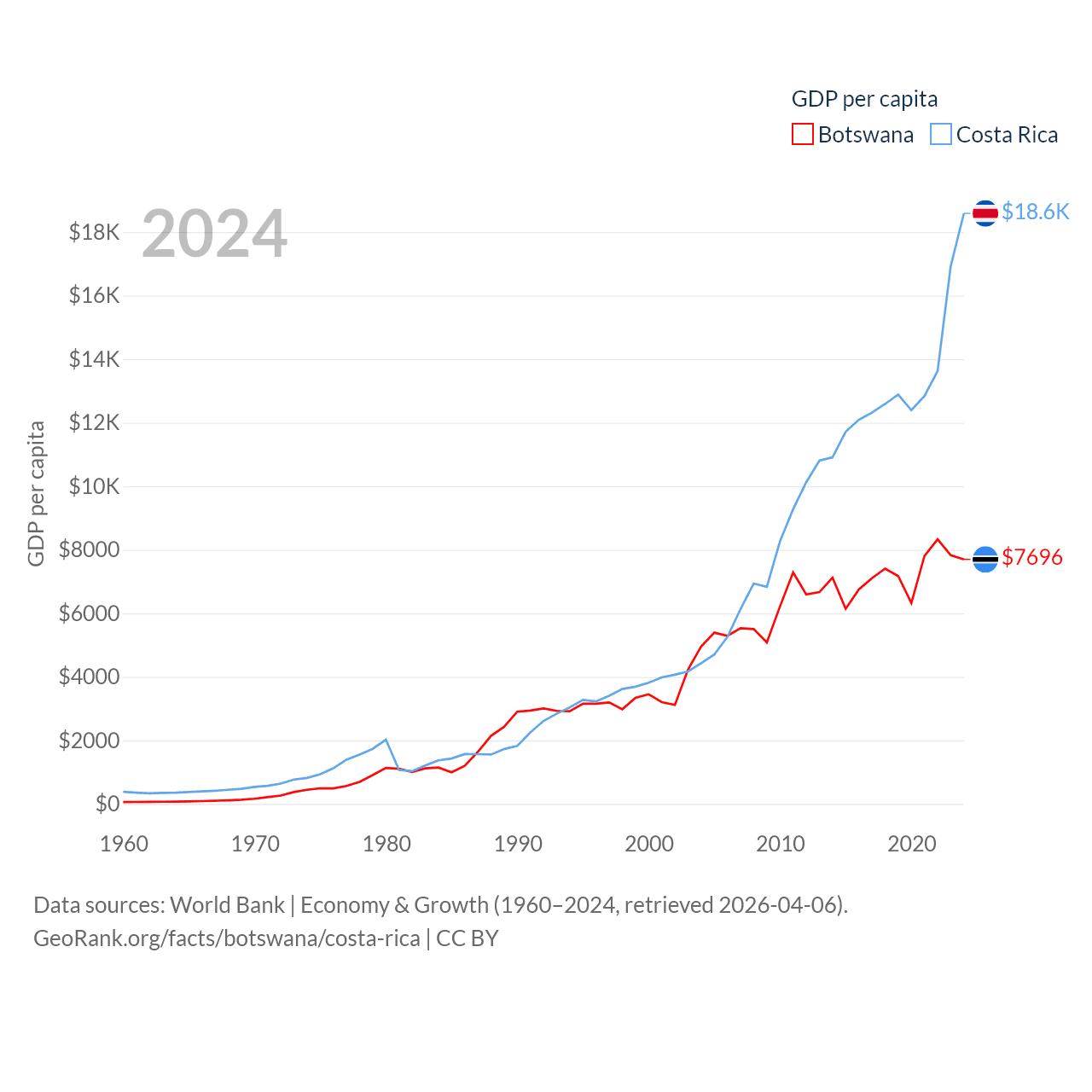 By GDP, Botswana ranks 133/197 ($19.4B) and Costa Rica ranks 73/197 ($95.4B). By GDP per capita, Botswana ranks 97/197 ($7,696), while Costa Rica ranks 62/197 ($18,587).