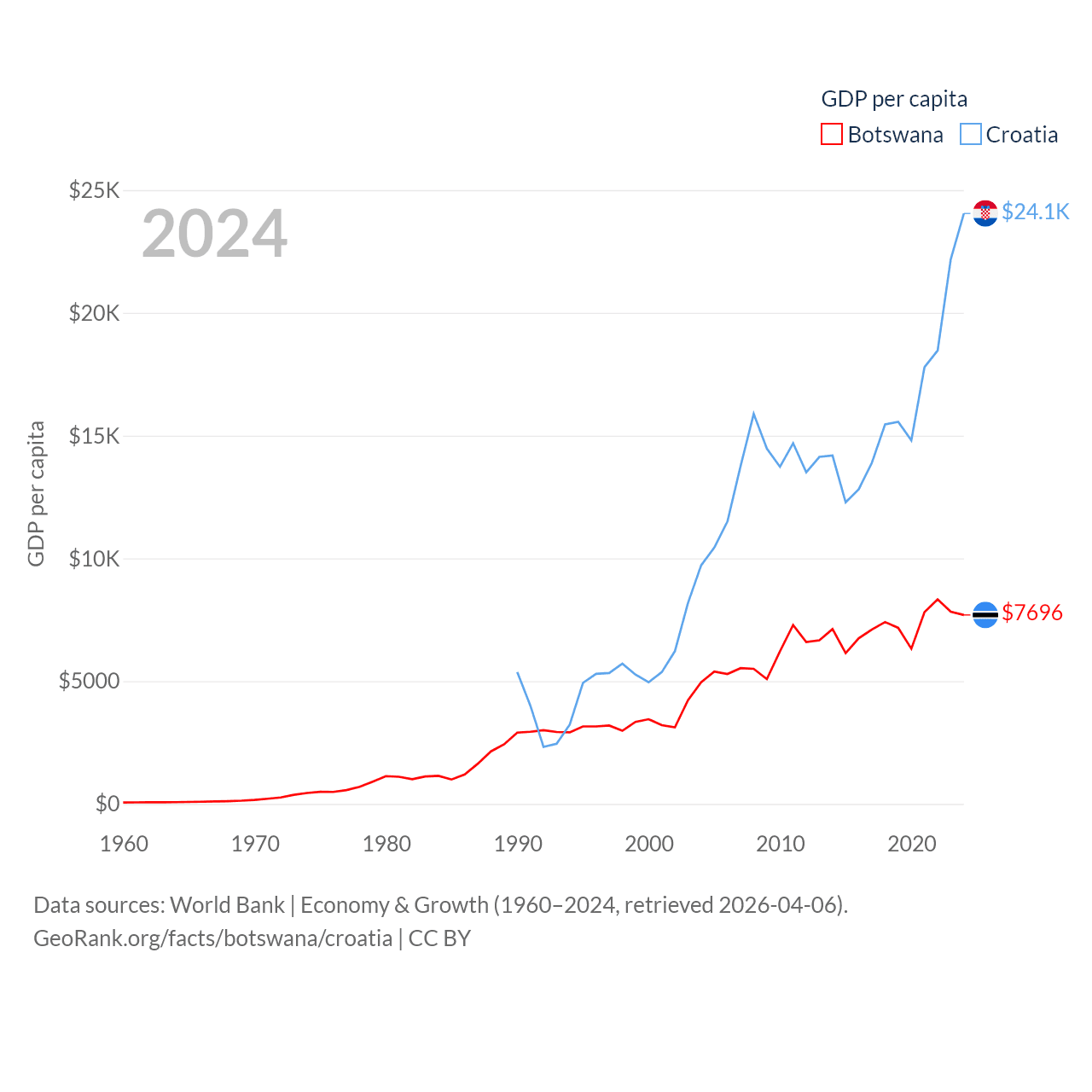 By GDP, Botswana ranks 133/197 ($19.4B) and Croatia ranks 75/197 ($93B). By GDP per capita, Botswana ranks 97/197 ($7,696), while Croatia ranks 50/197 ($24,050).