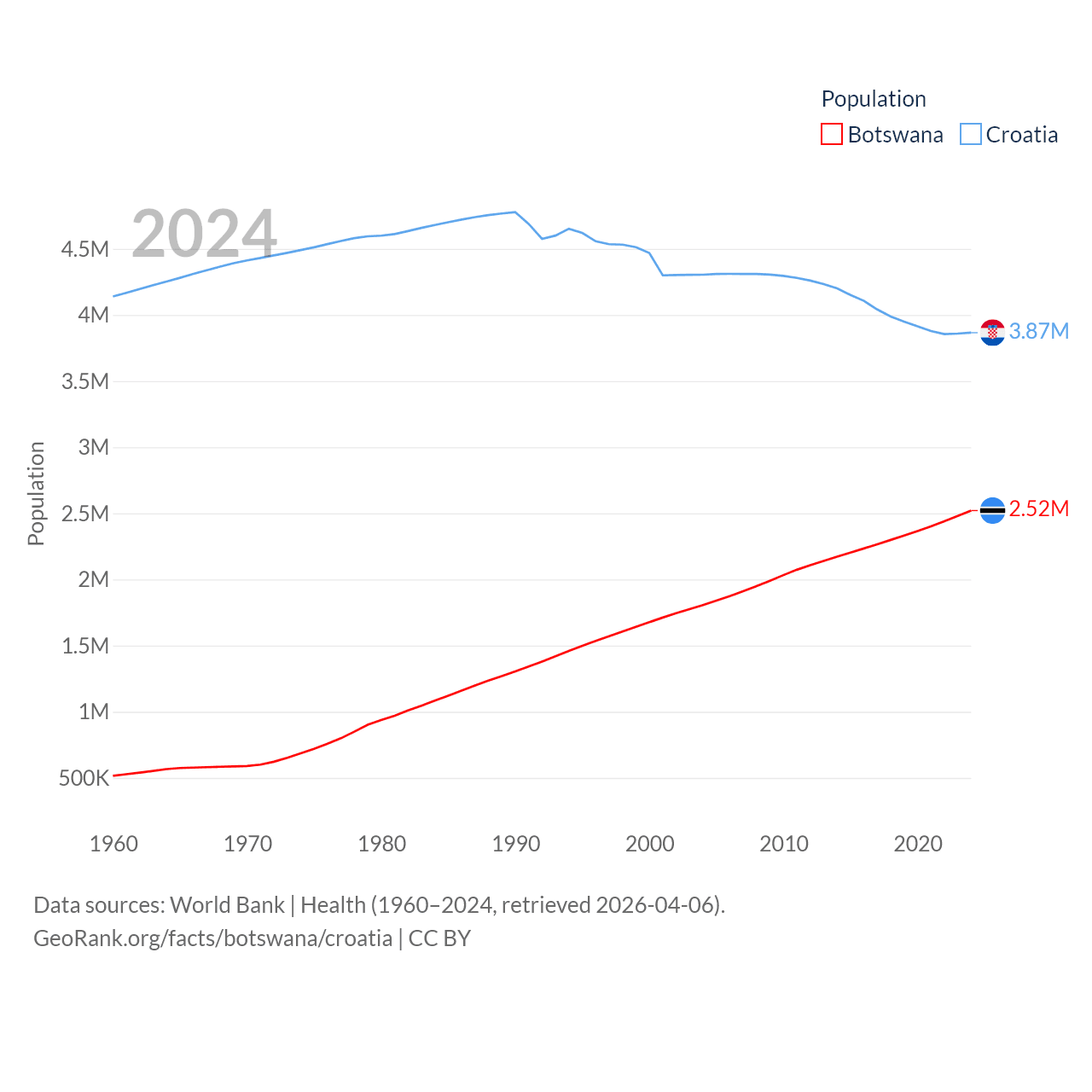 Botswana has a population of 2.52M (ranked 142/197), compared with 3.87M in Croatia (ranked 129/197). Botswana's land area is 218,816 sq mi versus 21,606 sq mi for Croatia (ranked 47th vs. 123rd).