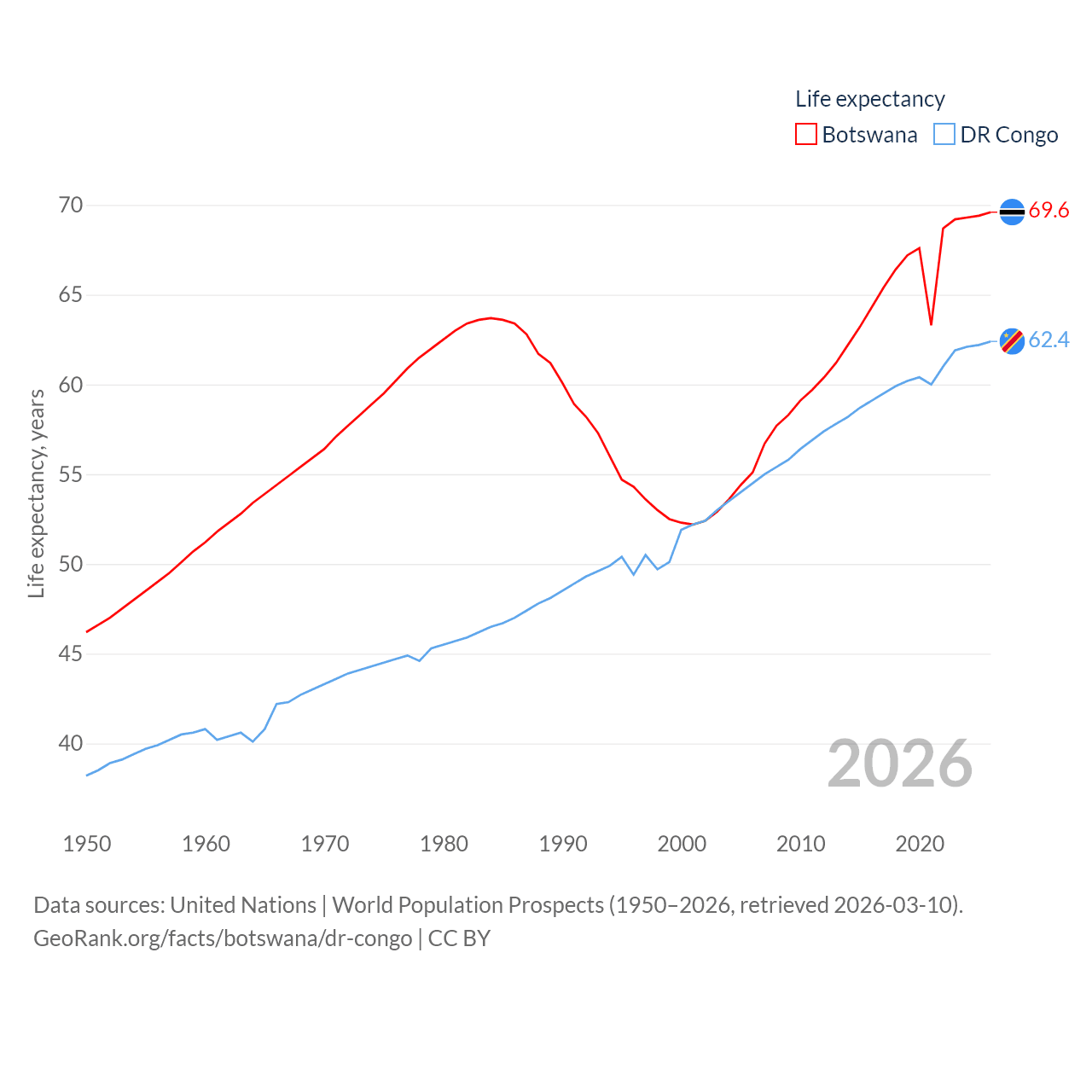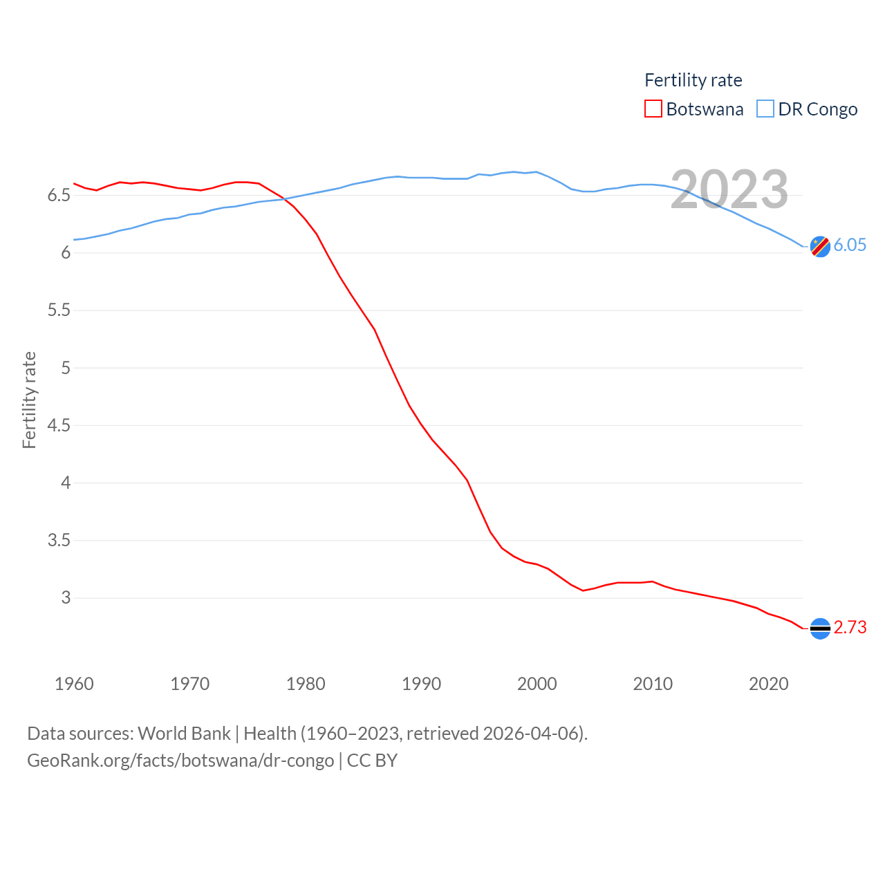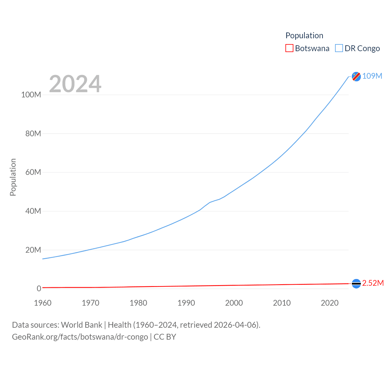 Botswana has a population of 2.52M (ranked 142/197), compared with 109M in The DR Congo (ranked 15/197). Botswana's land area is 218,816 sq mi versus 875,313 sq mi for The DR Congo (ranked 47th vs. 11th).