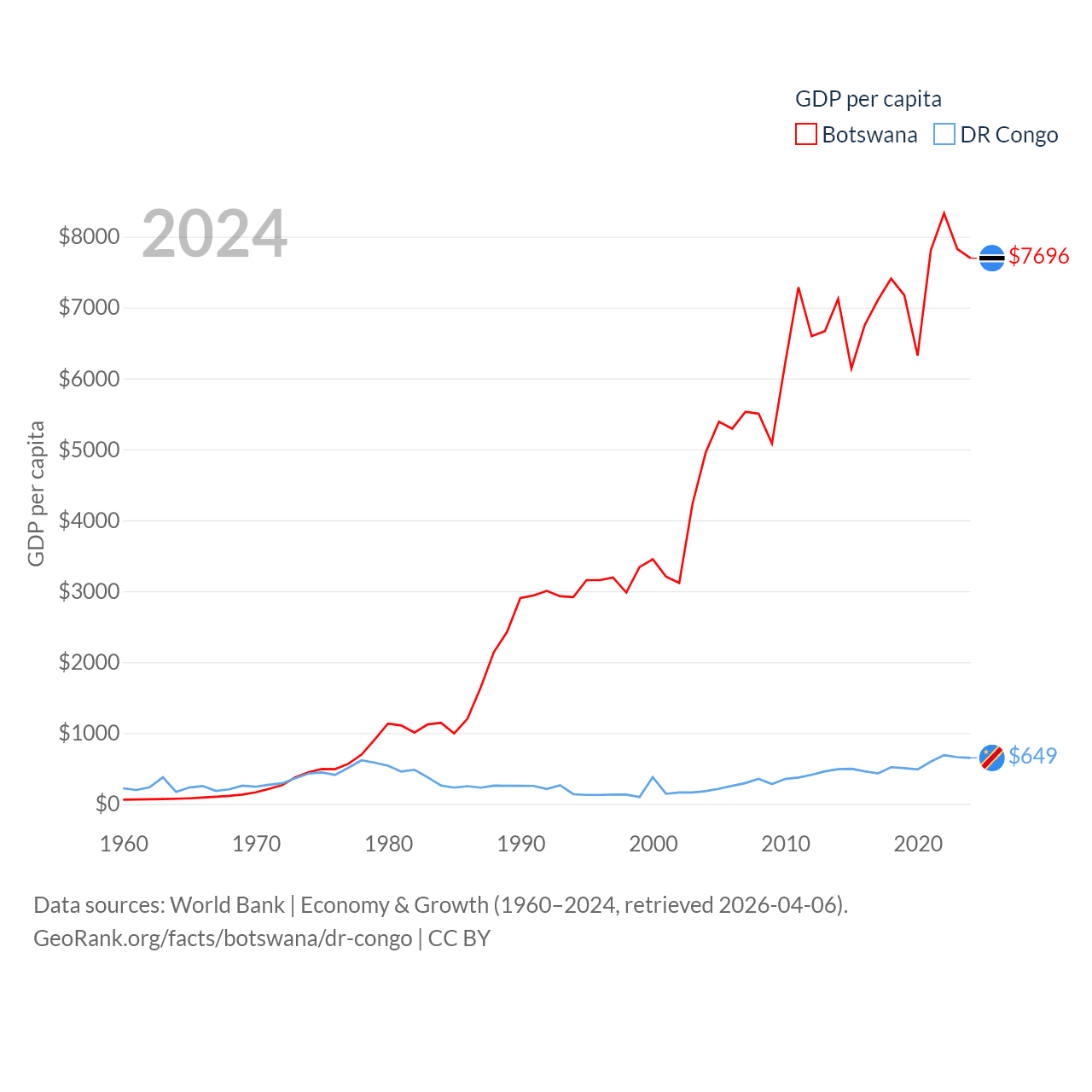 By GDP, Botswana ranks 133/197 ($19.4B) and The DR Congo ranks 87/197 ($71B). By GDP per capita, Botswana ranks 97/197 ($7,696), while The DR Congo ranks 190/197 ($649).