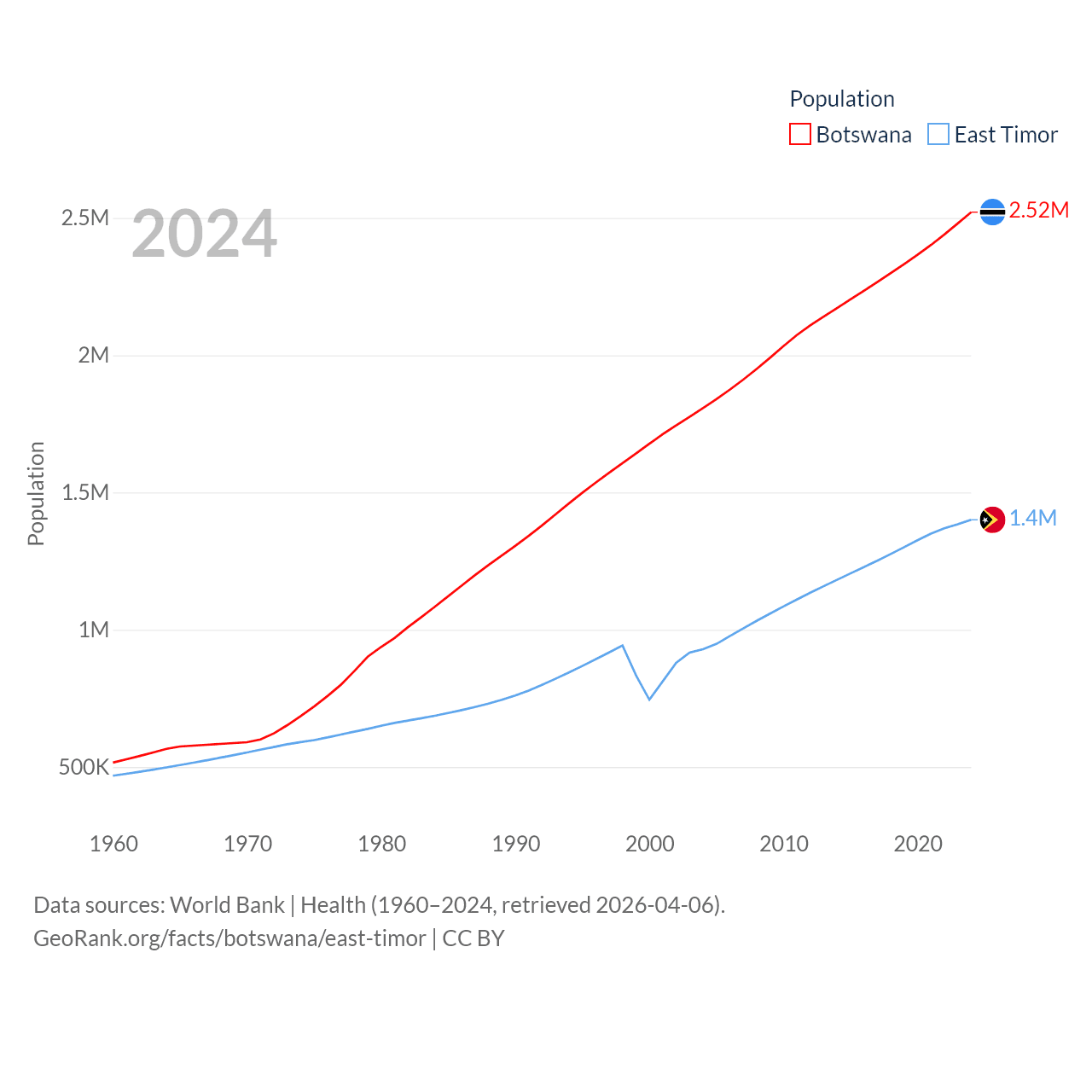 Botswana has a population of 2.52M (ranked 142/197), compared with 1.4M in East Timor (ranked 152/197). Botswana's land area is 218,816 sq mi versus 5,741 sq mi for East Timor (ranked 47th vs. 155th).